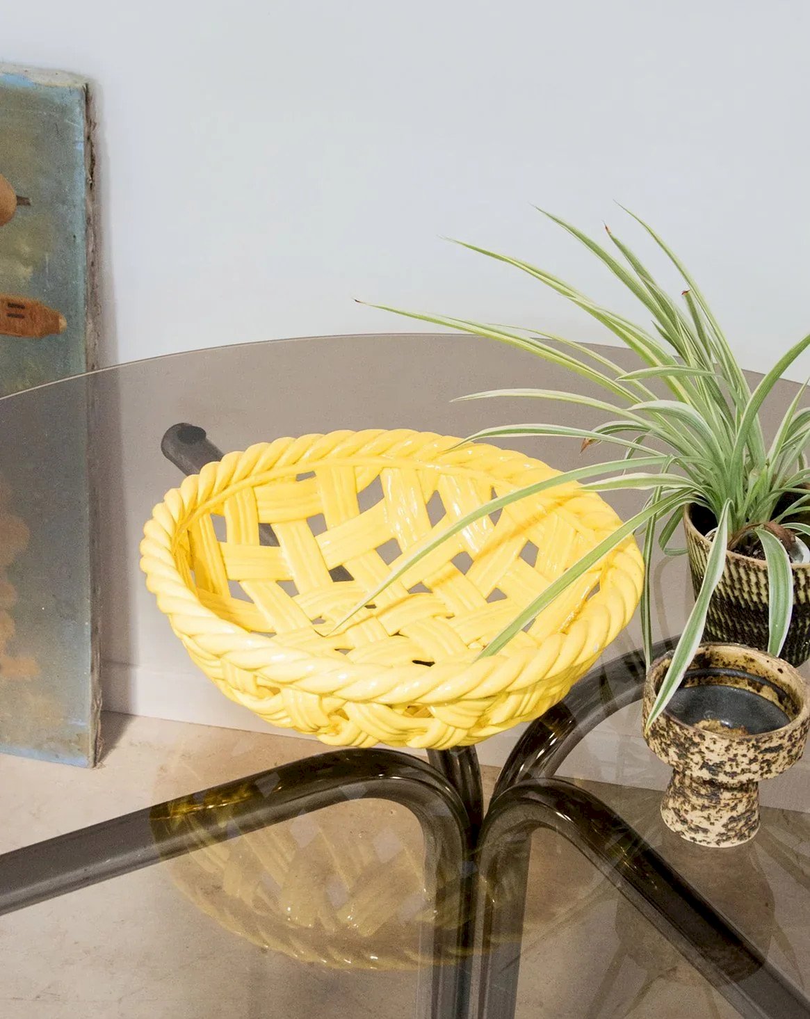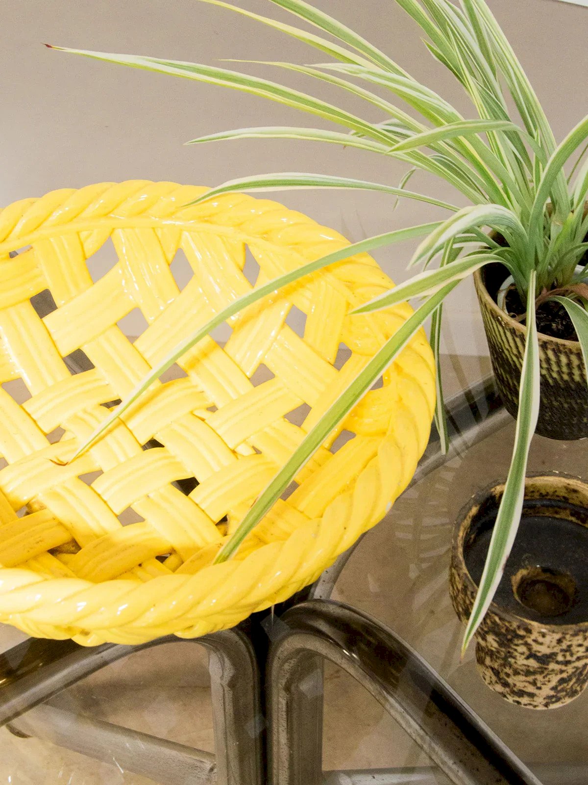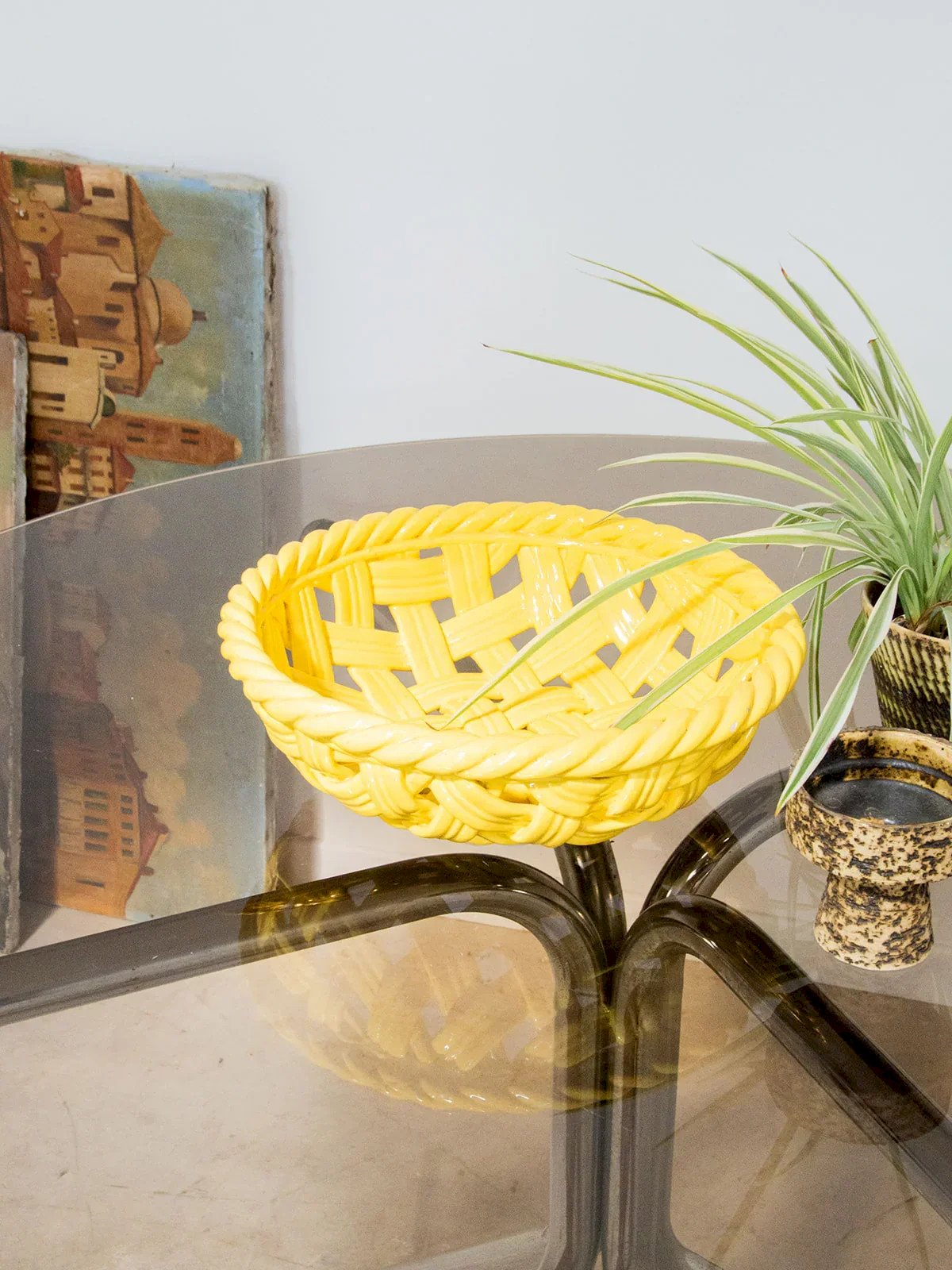 Apportez une touche de fraîcheur et de couleur à votre intérieur avec cette coupe de fruits jaune en faïence. Sa teinte vive et lumineuse égayera facilement votre table ou comptoir de cuisine. Idéale pour accueillir vos fruits ou servir d'accessoire décoratif, elle s'adapte à toutes les ambiances. Sa forme élégante et simple permet de l'intégrer facilement dans tout type de décoration. Un objet pratique et esthétique qui apportera de la gaieté à vos moments conviviaux. Hauteur : 11 cm Diamètre : 30 cm État:Occasion: Objet ayant été utilisé. Objet présentant quelques marques d'usure superficielle, ...Occasion: Objet ayant été utilisé. Objet présentant quelques marques d'usure superficielle, entièrement opérationnel et fonctionnant correctement. Il peut s'agir d'un modèle de démonstration ou d'un objet retourné en magasin après une courte période d'utilisation. les éventuelles imperfections. Marque:Debongout Type:Produit chiné Matériau:Faïence Style:Campagne