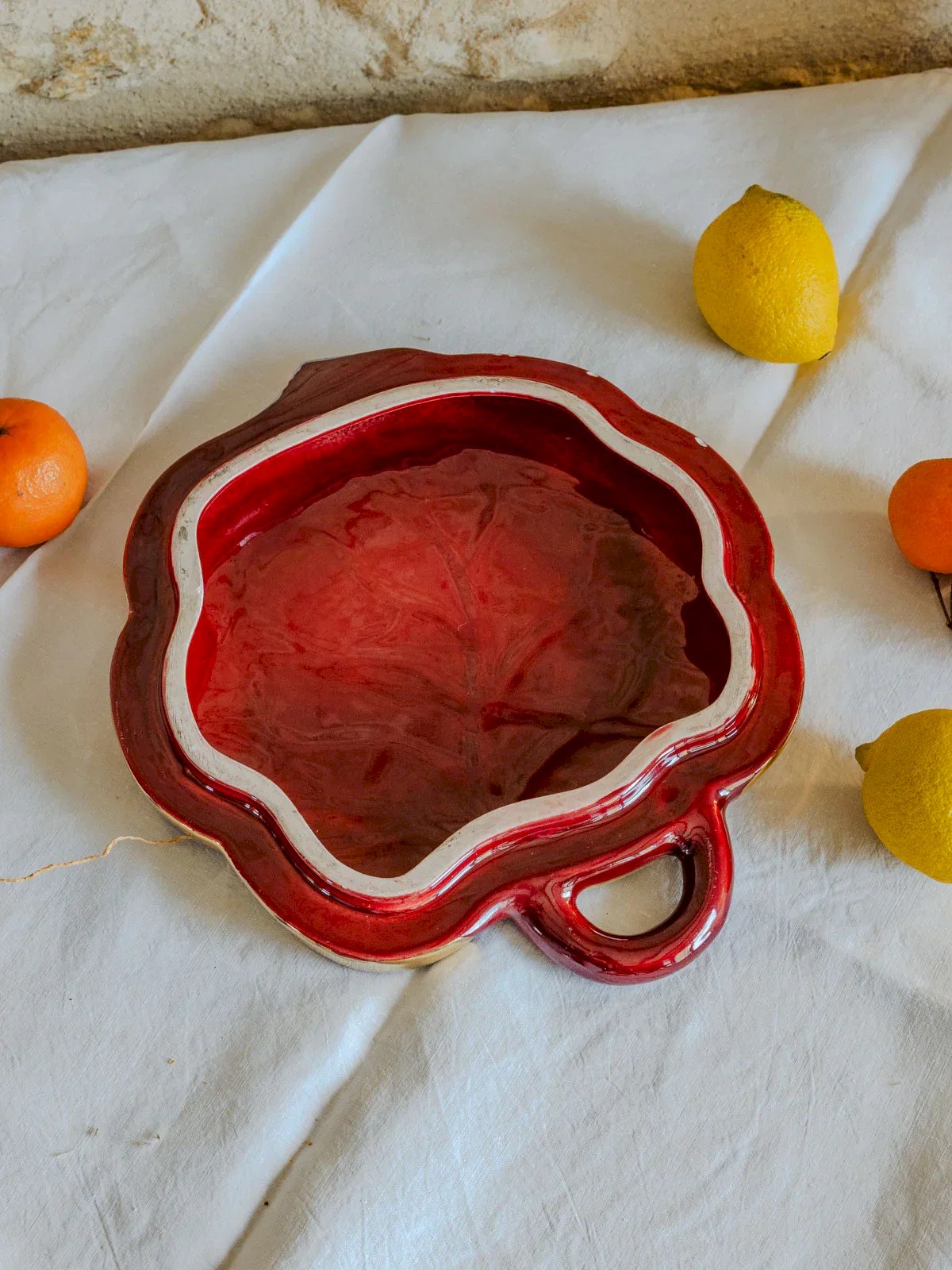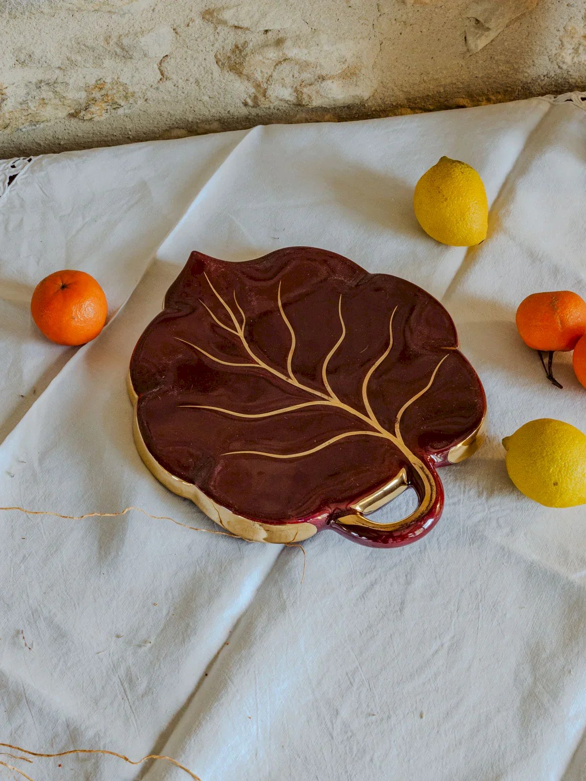 Ajoutez ce dessous de plat vintage en faïence vernissée, habillé d'un élégant liseré doré en forme de feuille et d'une teinte lit de vin profonde. Sa surface lumineuse protège élégamment la table tout en offrant un point d'appui stable pour casseroles ou plats, et ses proportions mesurées en font un accessoire à la fois pratique et décoratif. Installez-le au centre d'une table conviviale pour instaurer une atmosphère chaleureuse et raffinée. Longueur : 27 cm Largeur : 23 cm Hauteur : 2,5 cm État:Occasion: Objet ayant été utilisé. Objet présentant quelques marques d'usure superficielle, ...Occasion: Objet ayant été utilisé. Objet présentant quelques marques d'usure superficielle, entièrement opérationnel et fonctionnant correctement. Il peut s'agir d'un modèle de démonstration ou d'un objet retourné en magasin après une courte période d'utilisation. les éventuelles imperfections. Marque:Debongout Type:Produit chiné Matériau:Faïence Style:Campagne