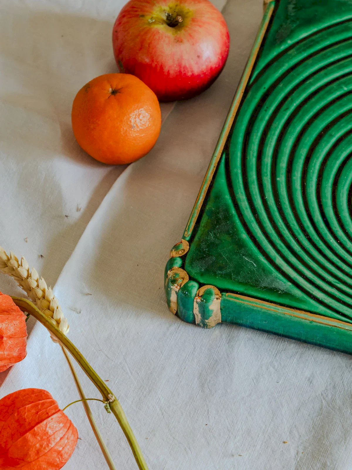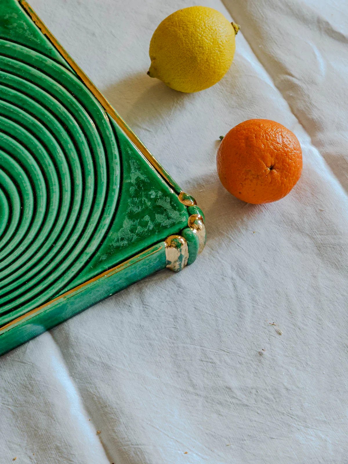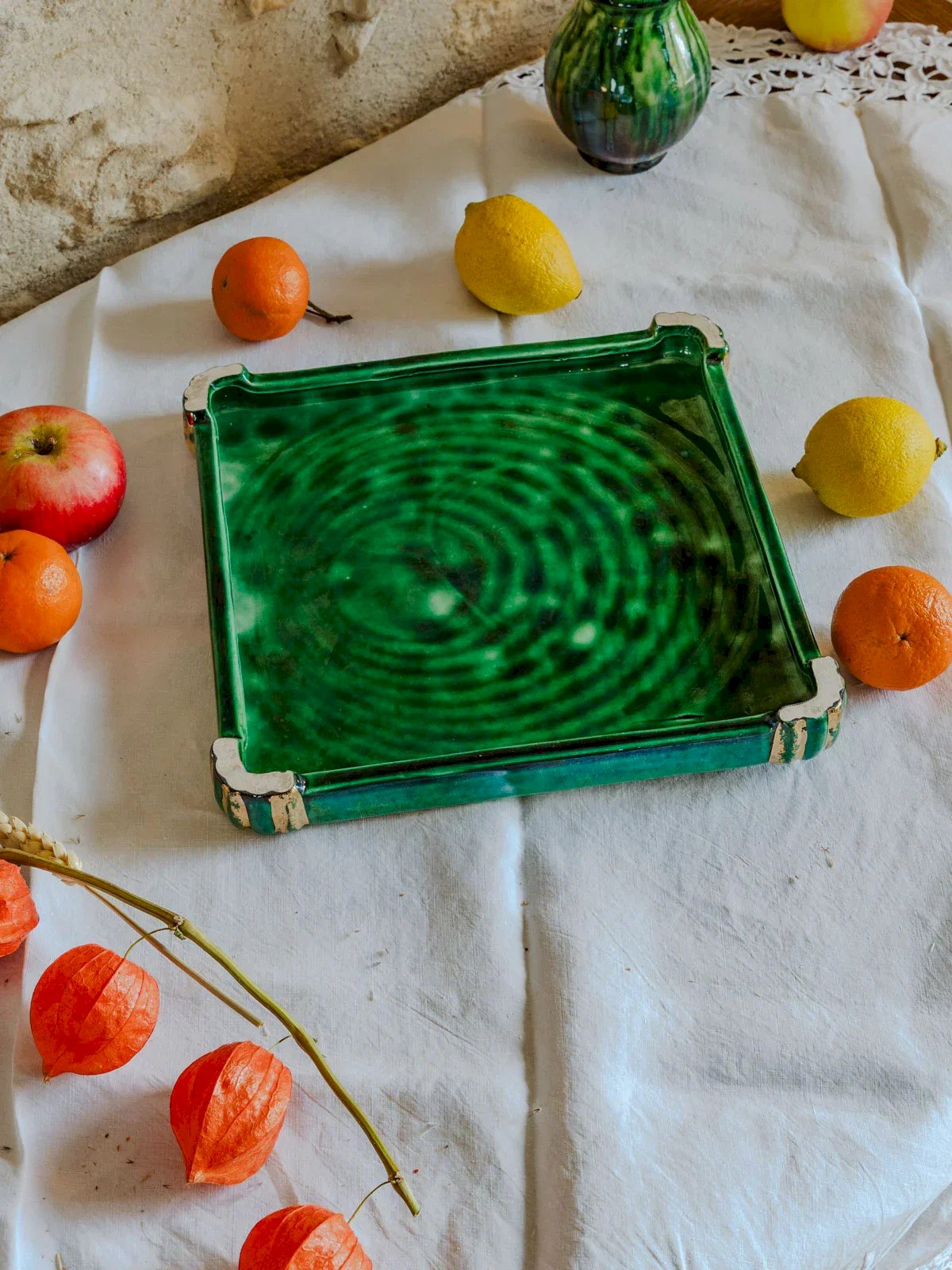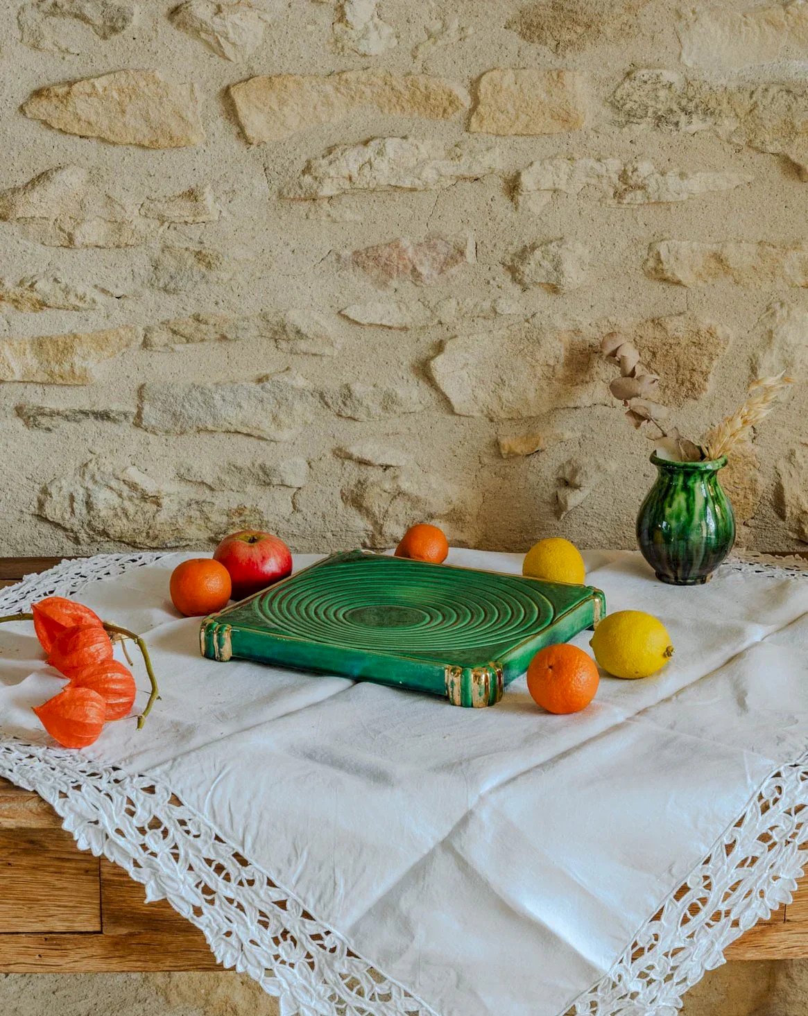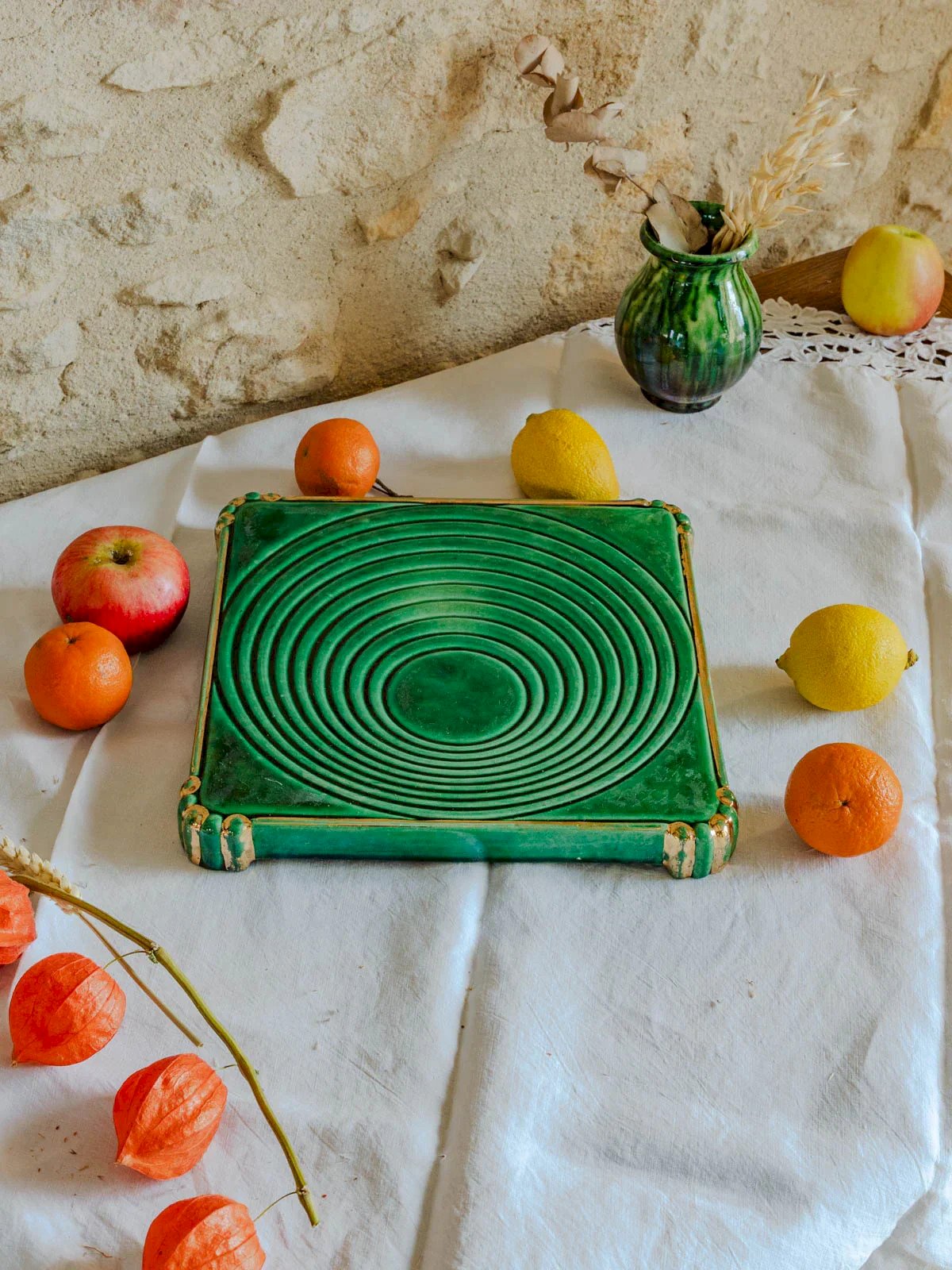 Ajoutez un accent Art déco à vos tables avec ce dessous de plat vintage aux nuances vertes et dorées et base métallique patinée, qui marie élégance graphique et chaleur rétro. Sa finition soignée protège joliment les surfaces tout en mettant en valeur vos plats lors des repas et réceptions, et son format compact accueille assiettes et petites casseroles avec aisance. Idéal pour une présentation raffinée et conviviale. Longueur : 25 cm Largeur : 25 cm Hauteur : 3 cm État:Occasion: Objet ayant été utilisé. Objet présentant quelques marques d'usure superficielle, ...Occasion: Objet ayant été utilisé. Objet présentant quelques marques d'usure superficielle, entièrement opérationnel et fonctionnant correctement. Il peut s'agir d'un modèle de démonstration ou d'un objet retourné en magasin après une courte période d'utilisation. les éventuelles imperfections. Marque:Debongout Type:Produit chiné Matériau:Faïence Style:Campagne