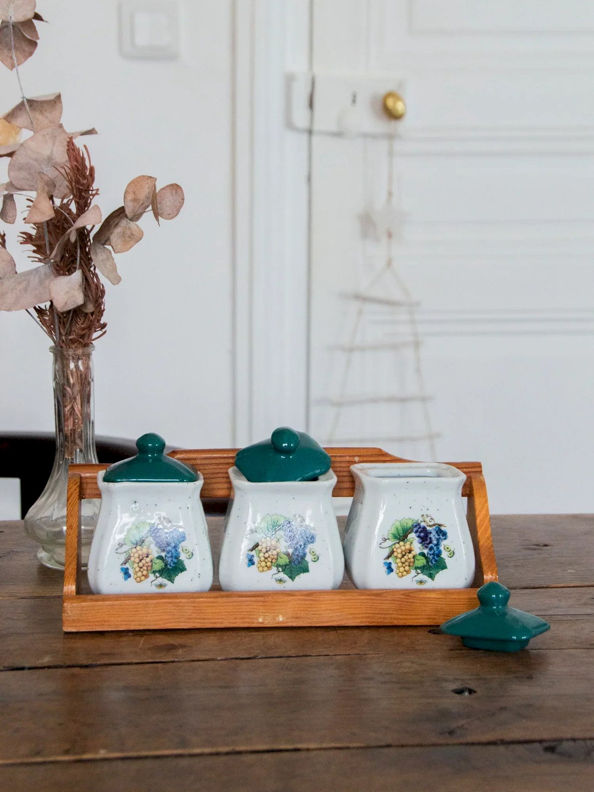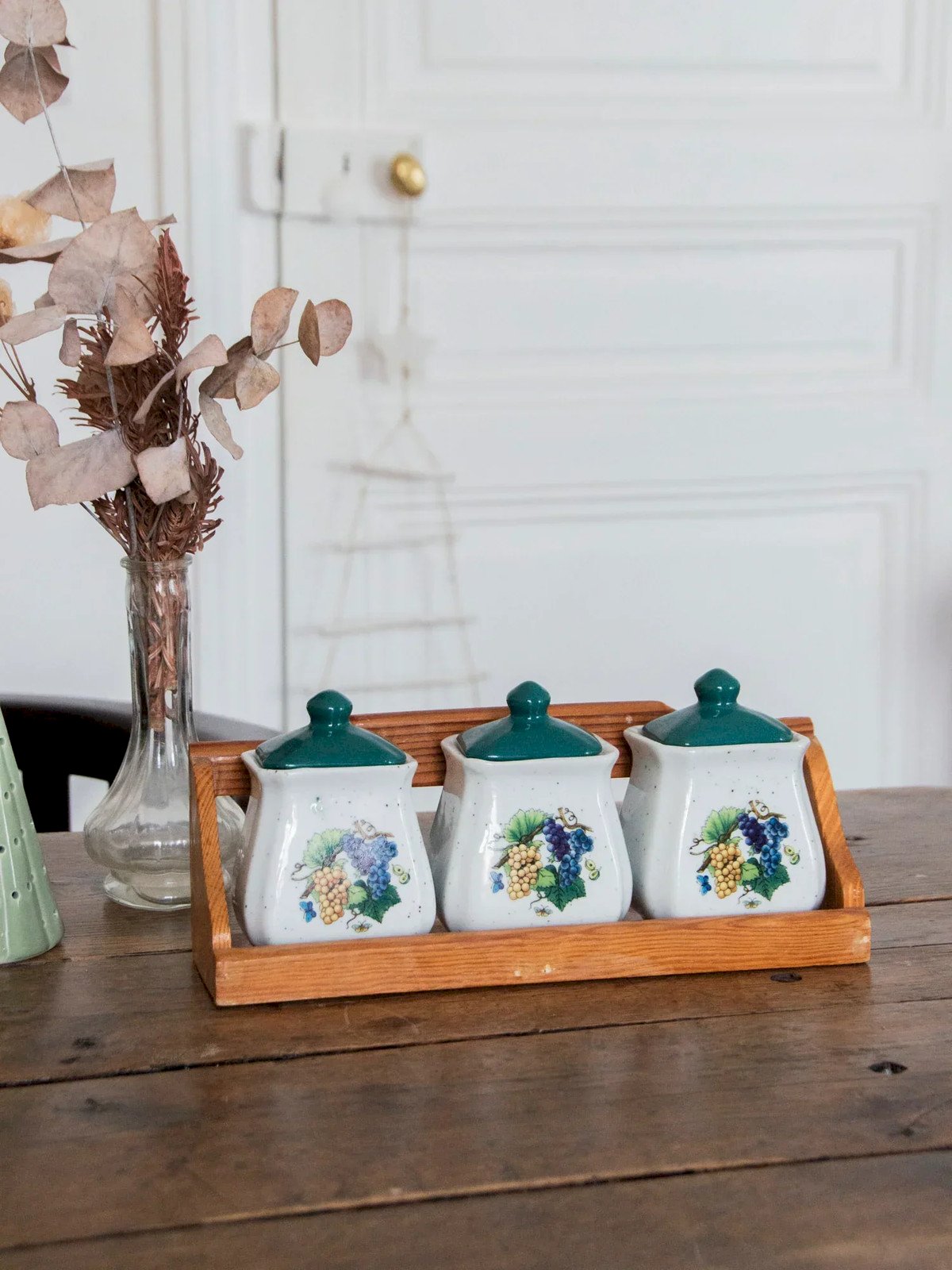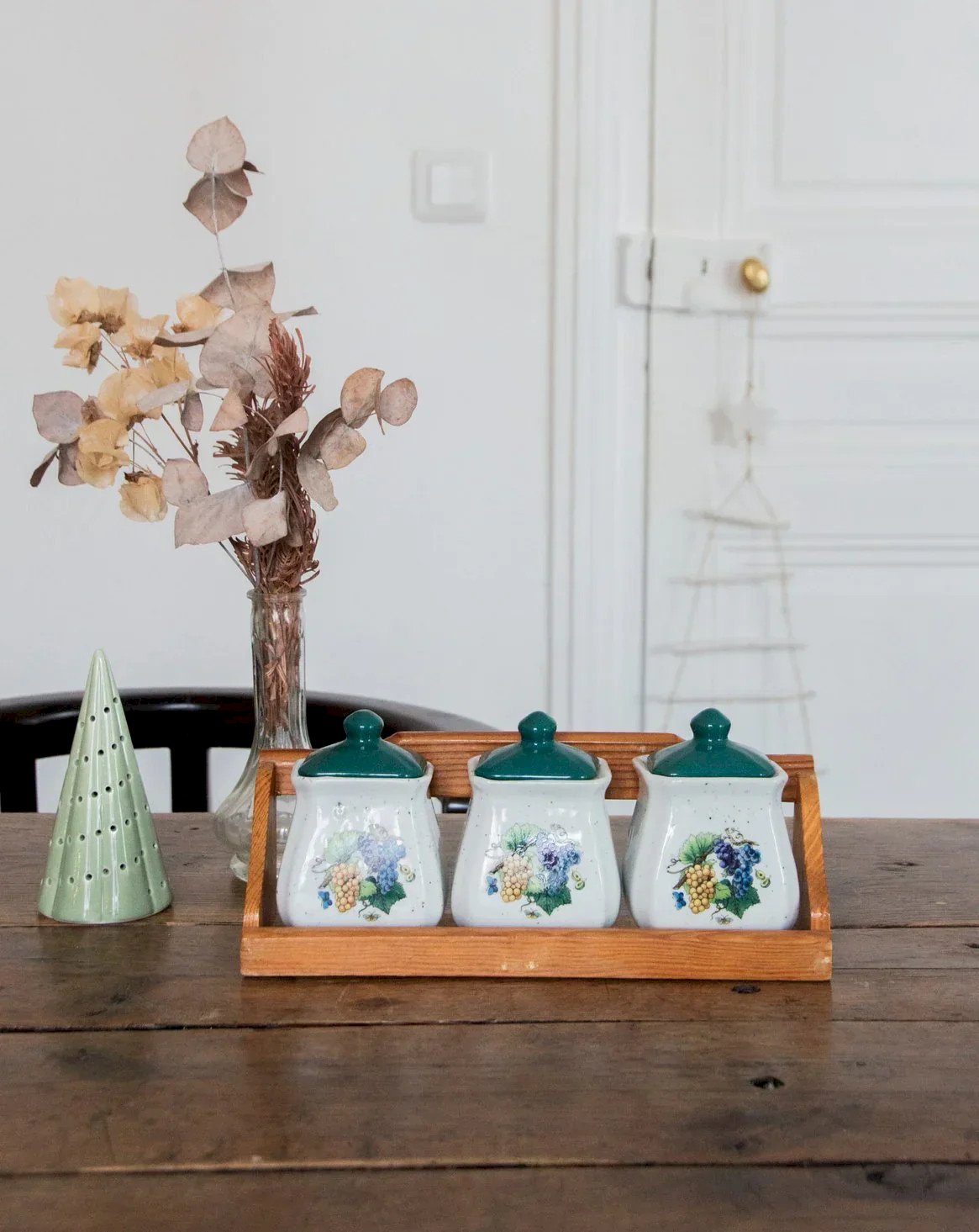 Ajoutez une touche rétro et organisée à votre plan de travail avec ce set-étagère à épices en bois émaillé, composé de trois petites boîtes à couvercles verts. La structure compacte et le plateau peu profond permettent de rassembler condiments et aromates à portée de main tout en conservant une silhouette délicate sur l'étagère. L'émail apporte une finition lumineuse facile d'entretien tandis que le bois confère chaleur et authenticité. Idéal pour structurer une cuisine au style soigné. Longueur : 26 cm Largeur : 7 cm Hauteur : 8,5 cm État:Occasion: Objet ayant été utilisé. Objet présentant quelques marques d'usure superficielle, ...Occasion: Objet ayant été utilisé. Objet présentant quelques marques d'usure superficielle, entièrement opérationnel et fonctionnant correctement. Il peut s'agir d'un modèle de démonstration ou d'un objet retourné en magasin après une courte période d'utilisation. les éventuelles imperfections. Marque:Debongout Type:Produit chiné Matériau:Bois, Faïence, Émail Style:Campagne