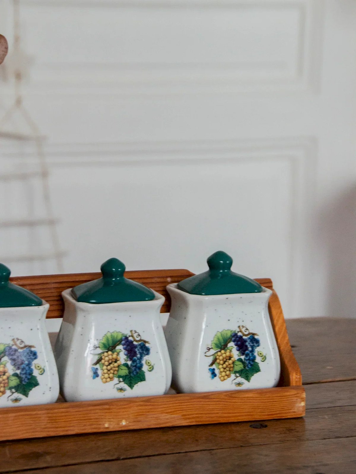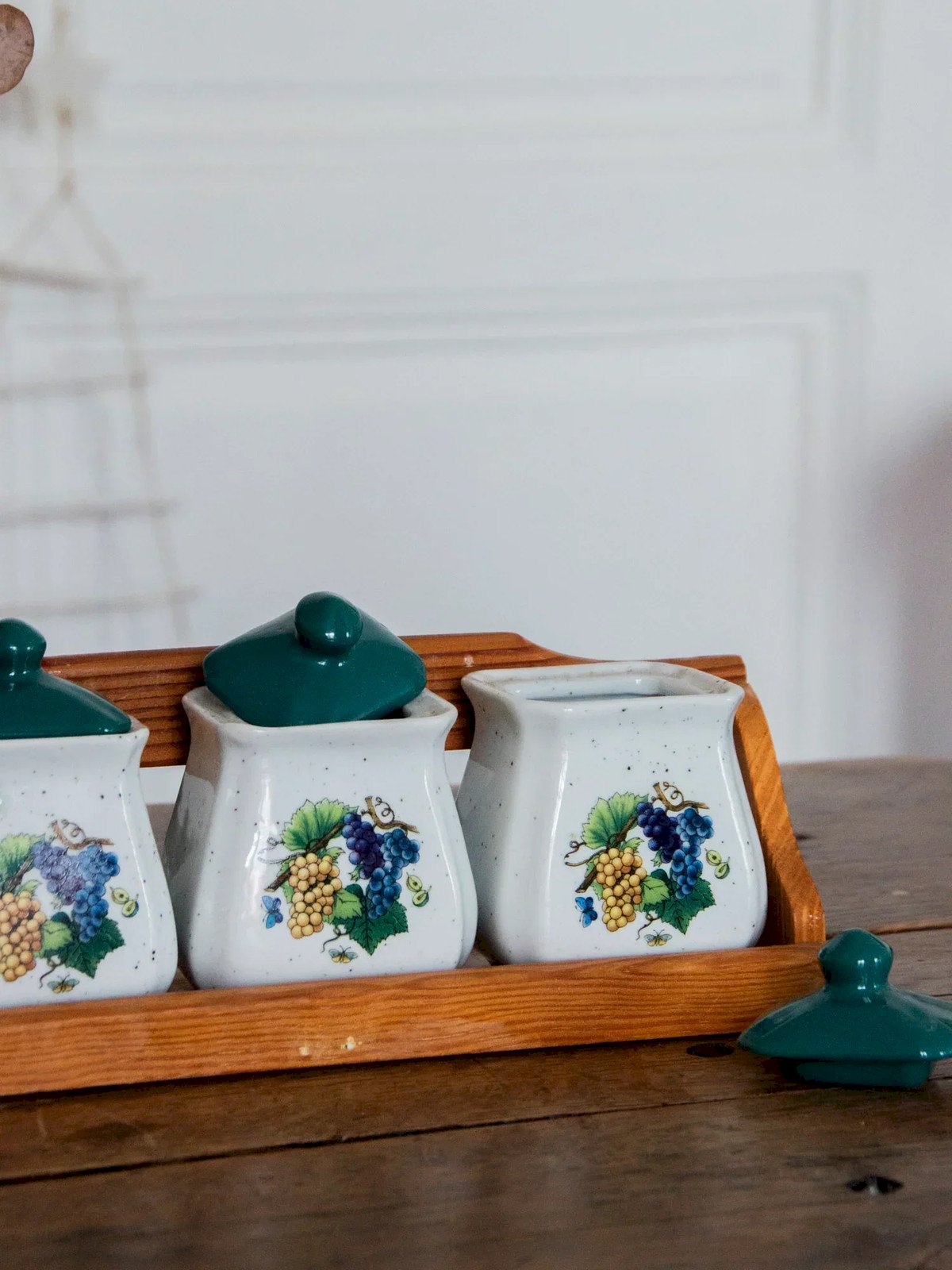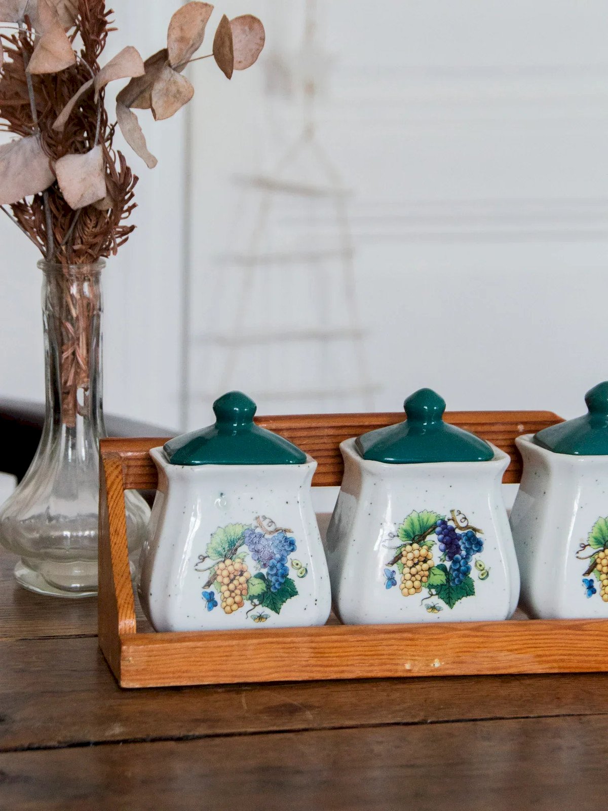 Ajoutez une touche rétro et organisée à votre plan de travail avec ce set-étagère à épices en bois émaillé, composé de trois petites boîtes à couvercles verts. La structure compacte et le plateau peu profond permettent de rassembler condiments et aromates à portée de main tout en conservant une silhouette délicate sur l'étagère. L'émail apporte une finition lumineuse facile d'entretien tandis que le bois confère chaleur et authenticité. Idéal pour structurer une cuisine au style soigné. Longueur : 26 cm Largeur : 7 cm Hauteur : 8,5 cm État:Occasion: Objet ayant été utilisé. Objet présentant quelques marques d'usure superficielle, ...Occasion: Objet ayant été utilisé. Objet présentant quelques marques d'usure superficielle, entièrement opérationnel et fonctionnant correctement. Il peut s'agir d'un modèle de démonstration ou d'un objet retourné en magasin après une courte période d'utilisation. les éventuelles imperfections. Marque:Debongout Type:Produit chiné Matériau:Bois, Faïence, Émail Style:Campagne