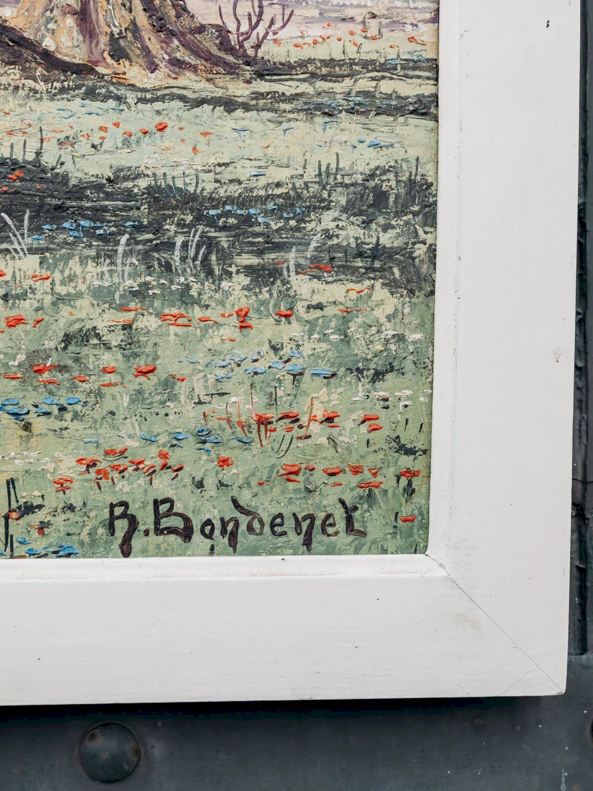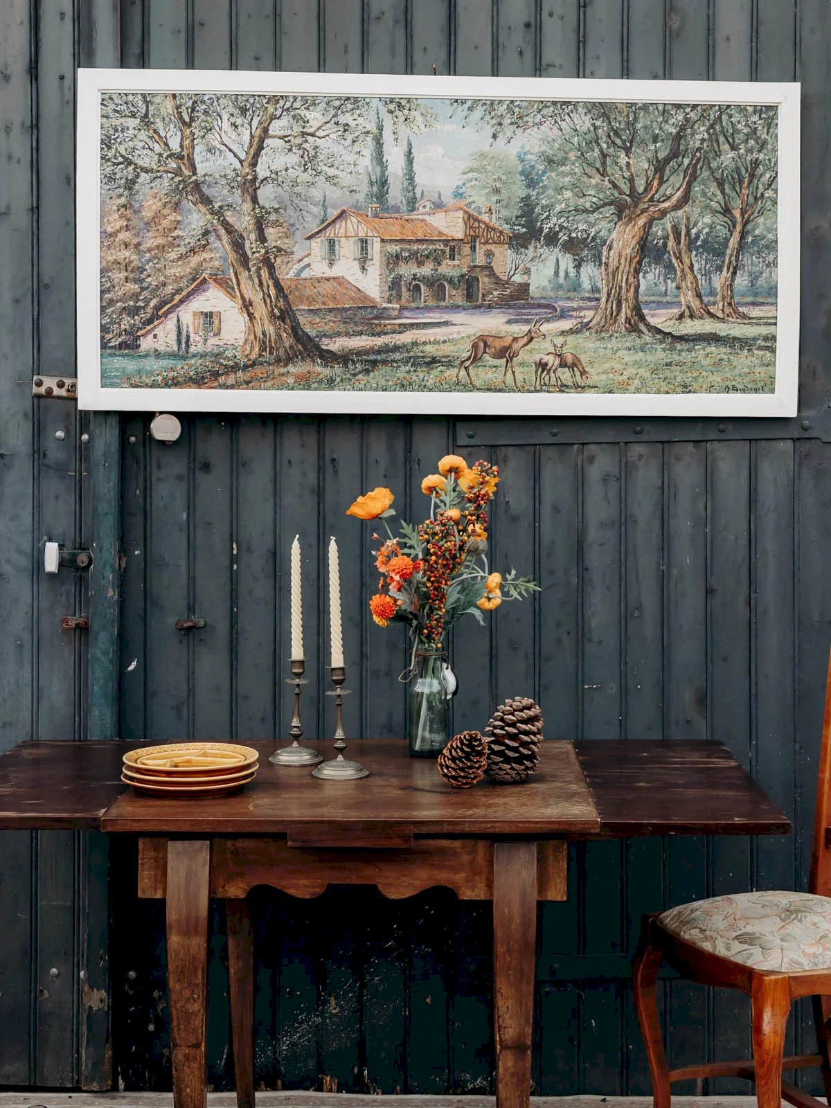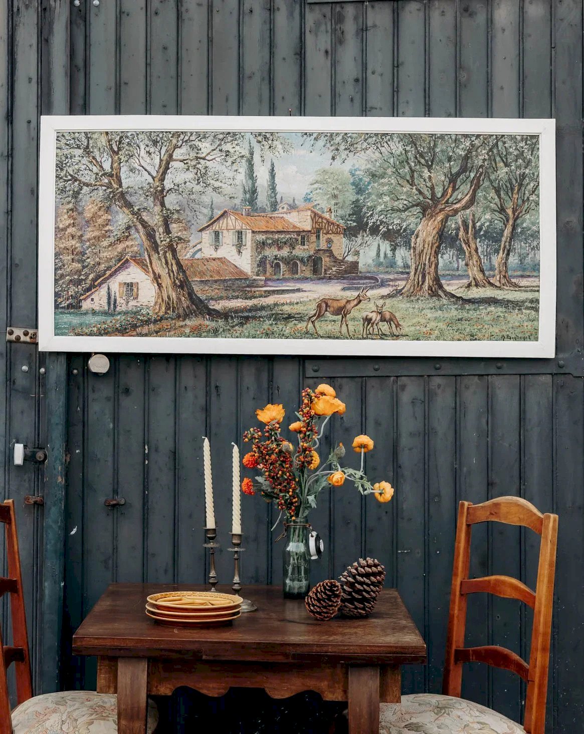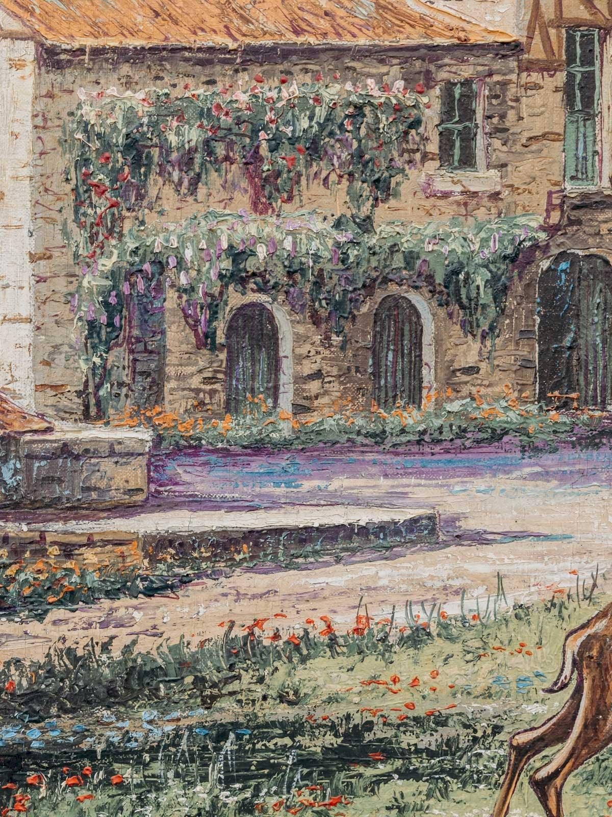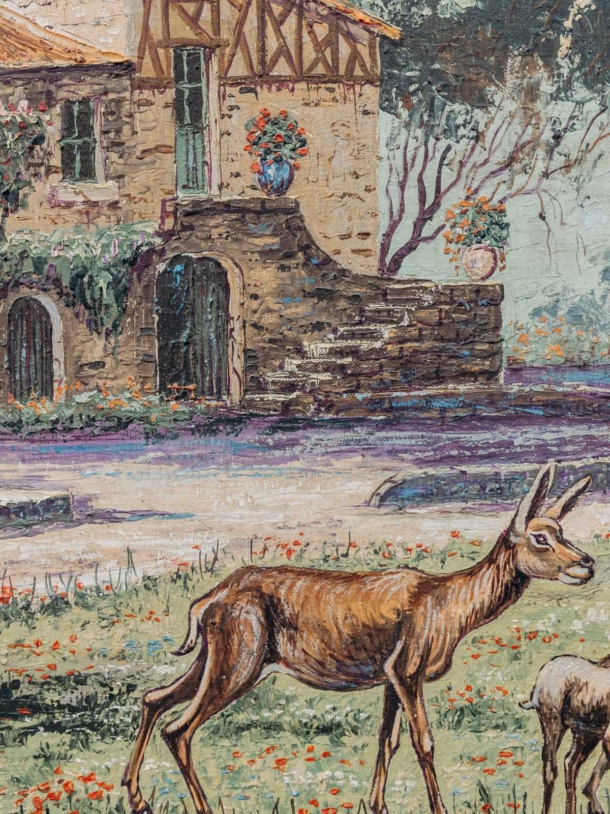 Découvrez cette toile ancienne de René Bondenet, peinte en 1955, qui restitue un paysage champêtre où une grange se love sous les arbres et où quelques biches animent la scène avec discrétion. La toile tendue sur châssis offre une matière chaleureuse et une patine naturelle, parfaite pour structurer un mur au-dessus d'un canapé ou dans une entrée, son format horizontal apportant une présence équilibrée et raffinée. Elle diffuse une atmosphère paisible et contemplative. Longueur : 148 cm Largeur : 4 cm Hauteur : 68 cm État:Occasion: Objet ayant été utilisé. Objet présentant quelques marques d'usure superficielle, ...Occasion: Objet ayant été utilisé. Objet présentant quelques marques d'usure superficielle, entièrement opérationnel et fonctionnant correctement. Il peut s'agir d'un modèle de démonstration ou d'un objet retourné en magasin après une courte période d'utilisation. les éventuelles imperfections. Marque:Debongout Type:Produit chiné Matériau:Toile Style:Contemporain