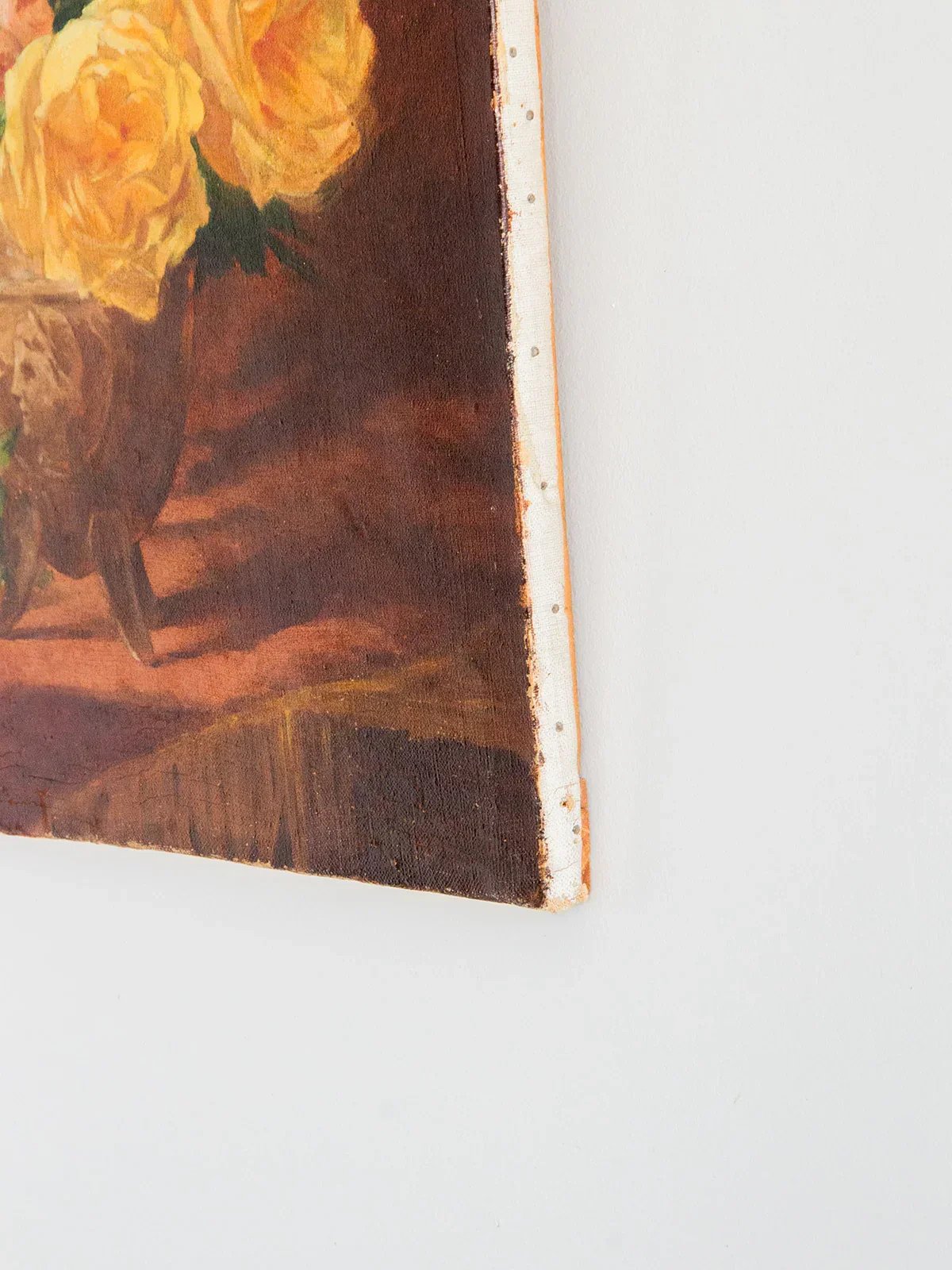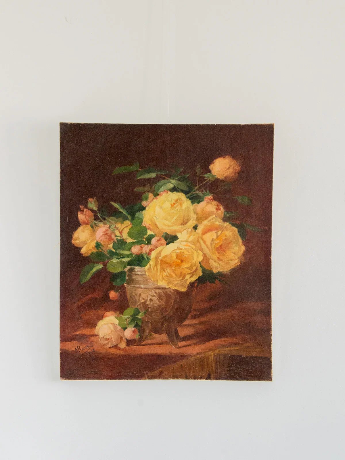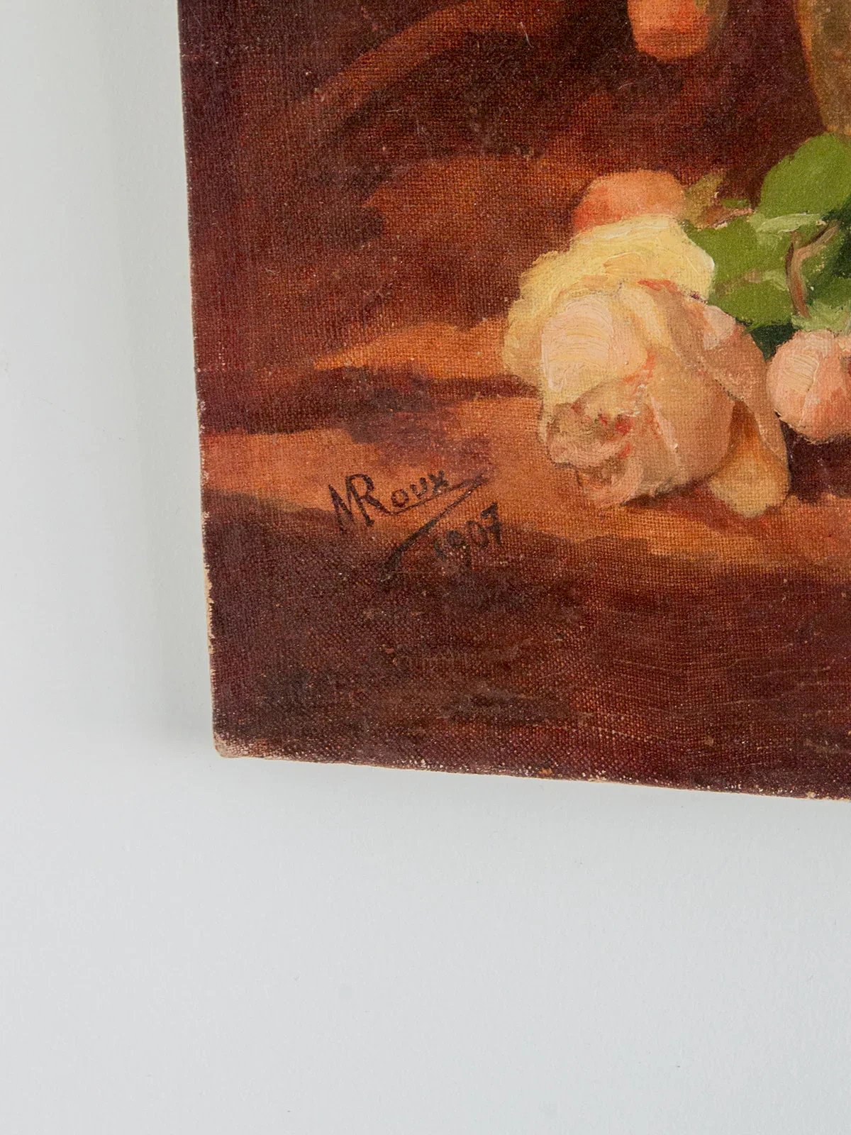 Découvrez cette toile peinte captivante, signée Roux, qui met en scène un délicat bouquet de roses claires garni dans un vase au superbe reflet cuivré. La finesse des détails et le charme du portrait délicatement intégré sur le vase ajoutent une touche d'élégance, faisant de cette œuvre un véritable bijou pour votre intérieur. Parfaite pour sublimer n'importe quel espace, cette huile sur toile apporte une atmosphère romantique et intemporelle à votre décoration. Un incontournable pour les amateurs d'art raffiné. Exclusivité web, la rencontre se fera chez vous ! Longueur : 38 cm Largeur : 46 cm État:Occasion: Objet ayant été utilisé. Objet présentant quelques marques d'usure superficielle, ...Occasion: Objet ayant été utilisé. Objet présentant quelques marques d'usure superficielle, entièrement opérationnel et fonctionnant correctement. Il peut s'agir d'un modèle de démonstration ou d'un objet retourné en magasin après une courte période d'utilisation. les éventuelles imperfections. Marque:Debongout Type:Produit chiné Matériau:Toile Style:Contemporain