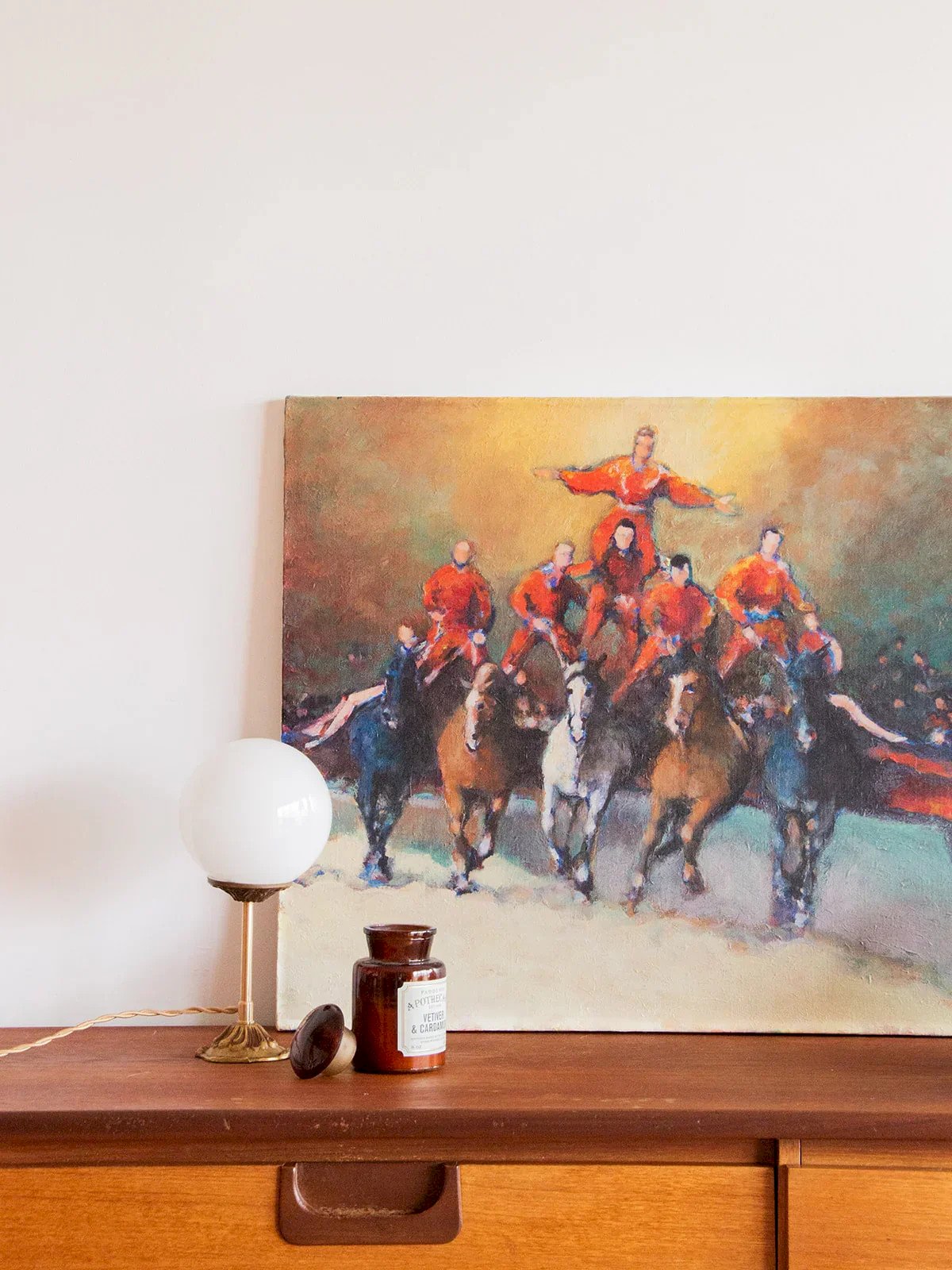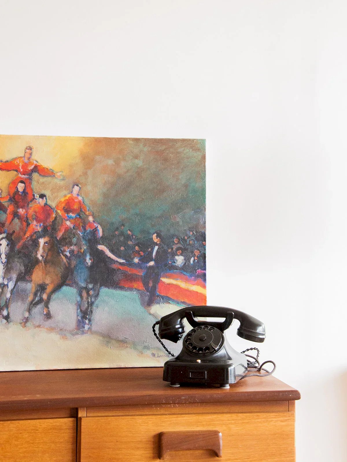 Plongez dans l’univers fascinant des acrobaties équestres avec cette huile sur toile signée par Marcel Lassauce. Artiste décorateur et peintre breton, Lassauce puise son inspiration auprès de son grand-père maréchal ferrant, développant ainsi une passion pour les chevaux. Évoquant la magie du cirque, cette œuvre captivante immortalisera à merveille la grâce et l'habileté des numéros équestres. Une pièce d’art unique qui apportera une touche de dynamisme et d’élégance à votre intérieur. Exclusivité web, la rencontre se fera chez vous ! Longueur : 73 cm Largeur : 54 cm État:Occasion: Objet ayant été utilisé. Objet présentant quelques marques d'usure superficielle, ...Occasion: Objet ayant été utilisé. Objet présentant quelques marques d'usure superficielle, entièrement opérationnel et fonctionnant correctement. Il peut s'agir d'un modèle de démonstration ou d'un objet retourné en magasin après une courte période d'utilisation. les éventuelles imperfections. Marque:Debongout Type:Produit chiné Matériau:Toile Style:Contemporain