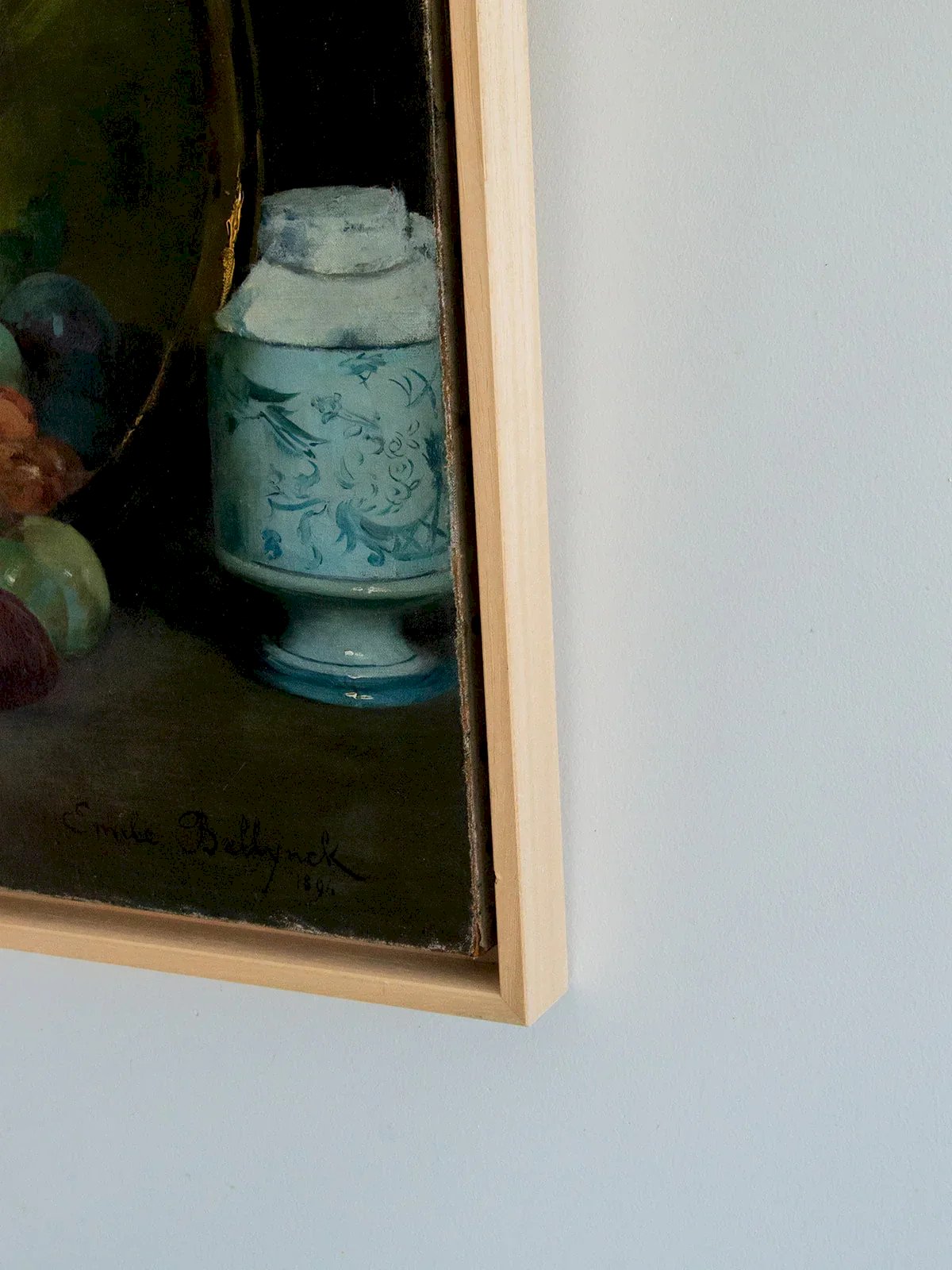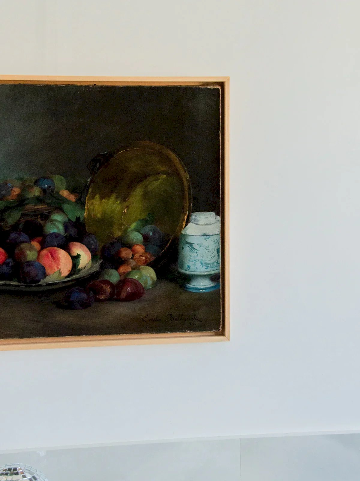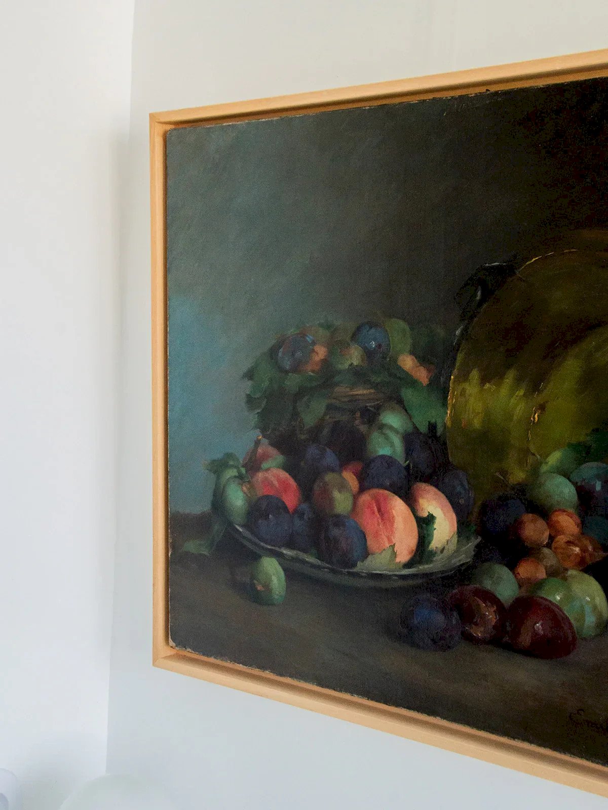 Découvrez cette toile d'une coupe de fruits renversée, mettant en scène des pêches et des prunes vertes et violettes délicates, signée par l'artiste Emile Bellunck. Cette œuvre originale se distingue par son arrière-plan foncé qui rehausse la richesse des couleurs et des textures des fruits au premier plan, créant ainsi un contraste saisissant. Parfaite pour apporter une touche artistique et gourmande à votre intérieur, cette toile saura séduire les amateurs d'art et de nature. Un incontournable pour sublimer vos murs avec élégance ! Exclusivité web, la rencontre se fera chez vous ! Longueur : 65 cm Largeur : 54 cm État:Occasion: Objet ayant été utilisé. Objet présentant quelques marques d'usure superficielle, ...Occasion: Objet ayant été utilisé. Objet présentant quelques marques d'usure superficielle, entièrement opérationnel et fonctionnant correctement. Il peut s'agir d'un modèle de démonstration ou d'un objet retourné en magasin après une courte période d'utilisation. les éventuelles imperfections. Marque:Debongout Type:Produit chiné Matériau:Toile Style:Contemporain