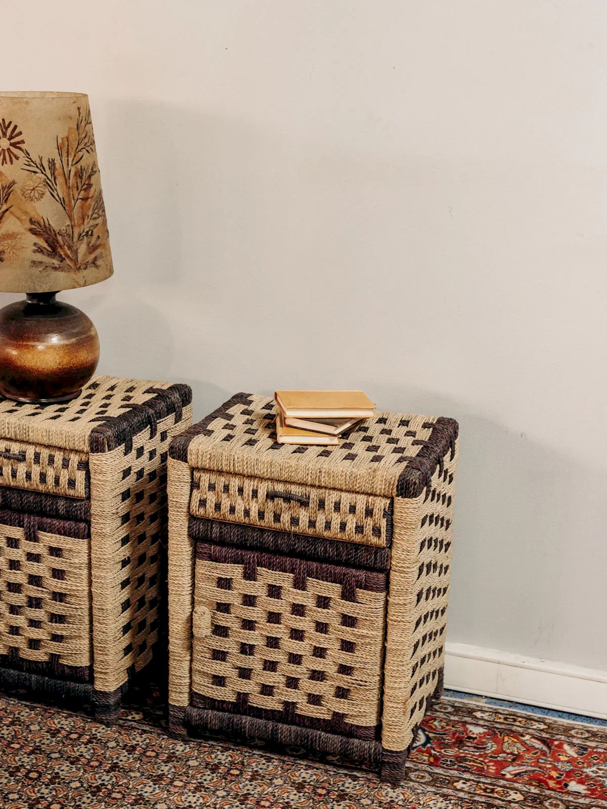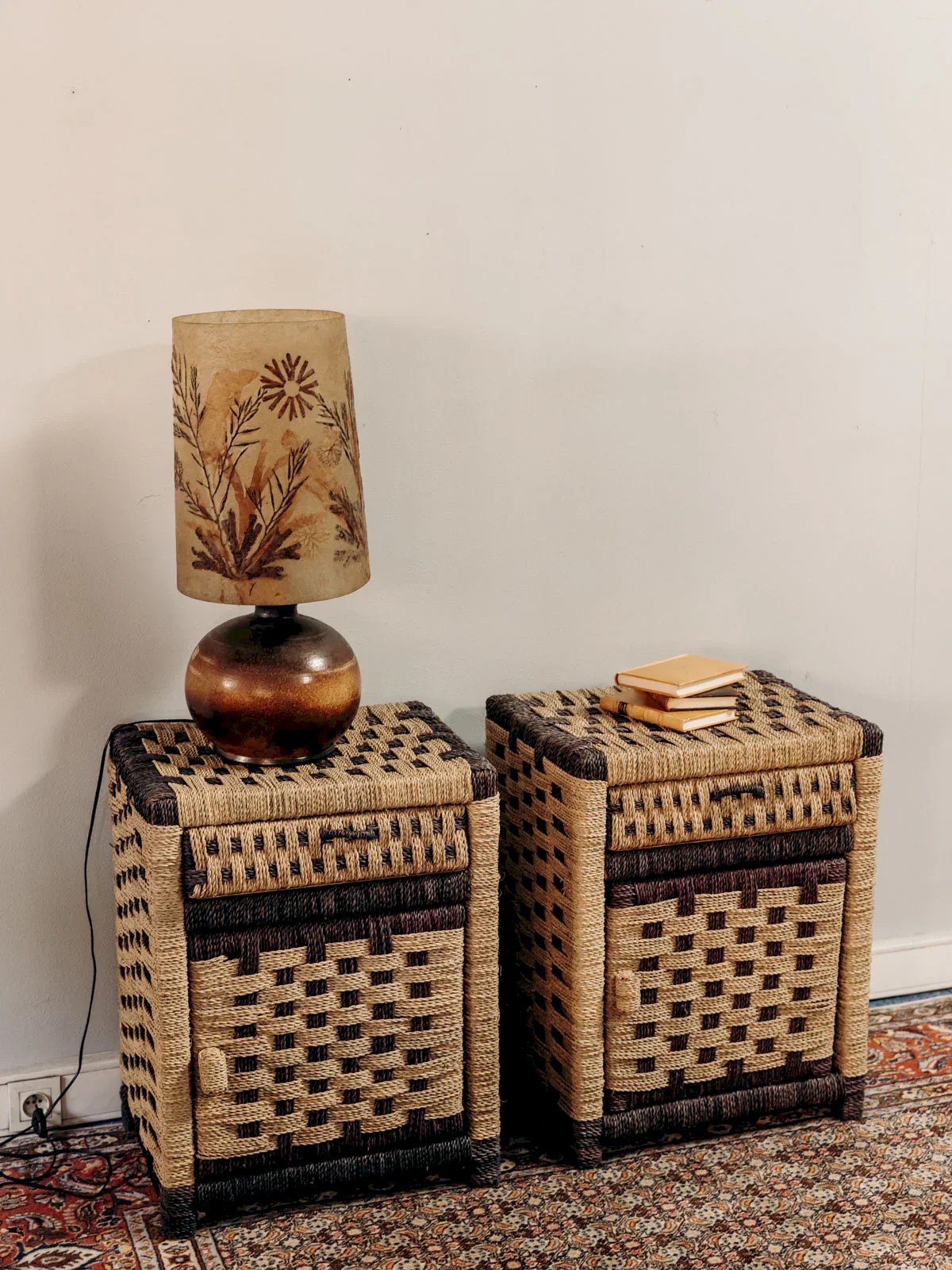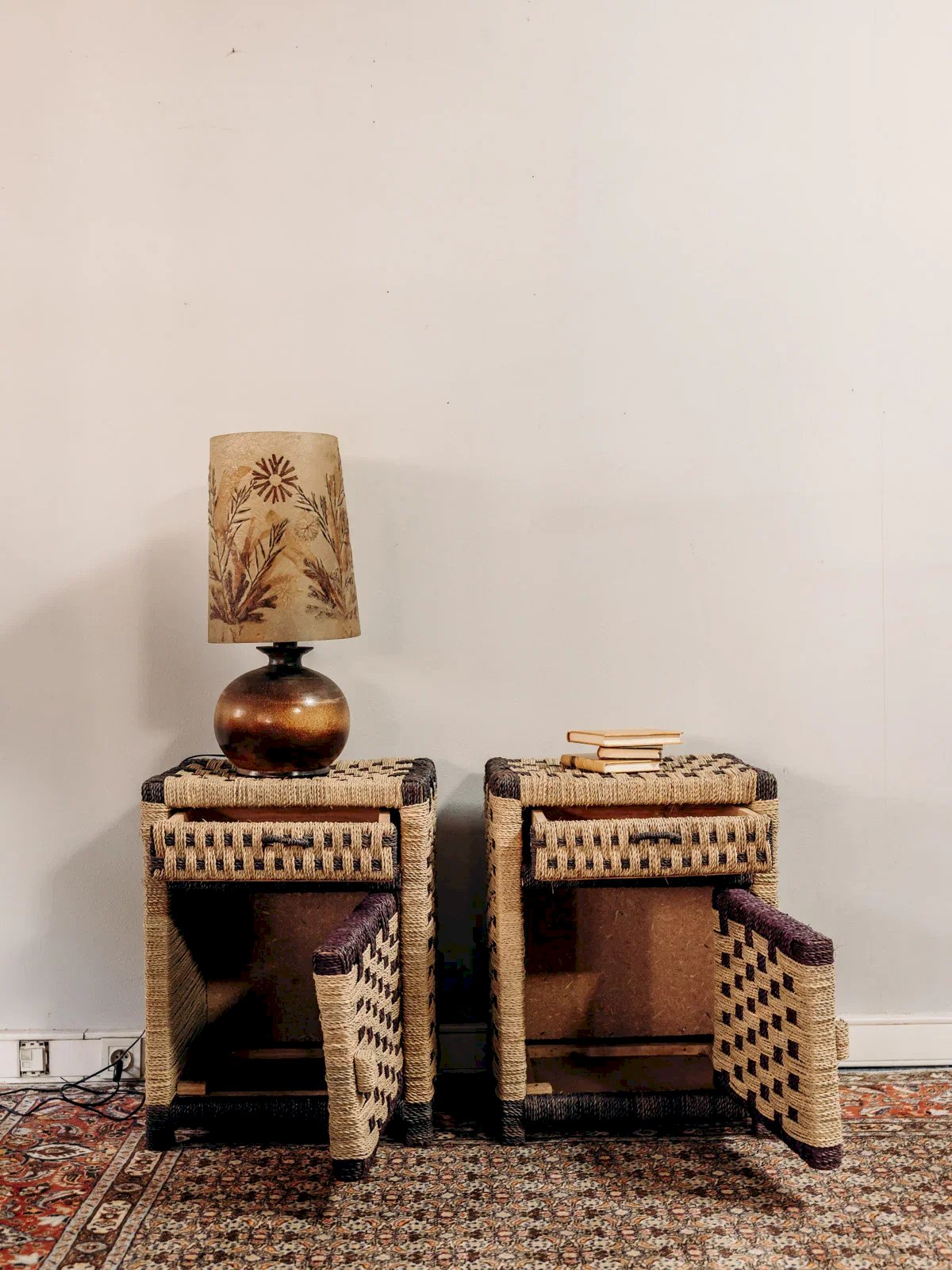 Adoptez cette paire de chevets en osier bicolore tressé et bois, au charme naturel et aux lignes légères. Chaque pièce associe un tiroir discret et un petit placard à poignée, offrant des rangements malins pour vos objets du quotidien. Les petits pieds élèvent l'ensemble et soulignent une silhouette équilibrée, idéale pour une chambre au style bohème-chic ou scandinave. La texture du tressage diffuse une ambiance chaleureuse et authentique. Longueur : 50 cm Largeur : 40 cm Hauteur : 67 cm Hauteur tiroir : 9 cm Hauteur de la niche : 37 cm Petite histoire du chevet Le terme "chevet" désigne depuis le Moyen Âge un petit meuble placé à côté du lit. Initialement conçu comme support pour une lampe ou des objets personnels, le chevet évolue avec le temps pour inclure des tiroirs et des étagères. Essentiel dans la chambre à coucher, il allie aujourd'hui fonctionnalité et design, s’adaptant à tous les styles d'intérieur. État:Occasion: Objet ayant été utilisé. Objet présentant quelques marques d'usure superficielle, ...Occasion: Objet ayant été utilisé. Objet présentant quelques marques d'usure superficielle, entièrement opérationnel et fonctionnant correctement. Il peut s'agir d'un modèle de démonstration ou d'un objet retourné en magasin après une courte période d'utilisation. les éventuelles imperfections. Marque:Debongout Type:Produit chiné Matériau:Osier, Bois Style:Campagne Personnalisé:Chevets