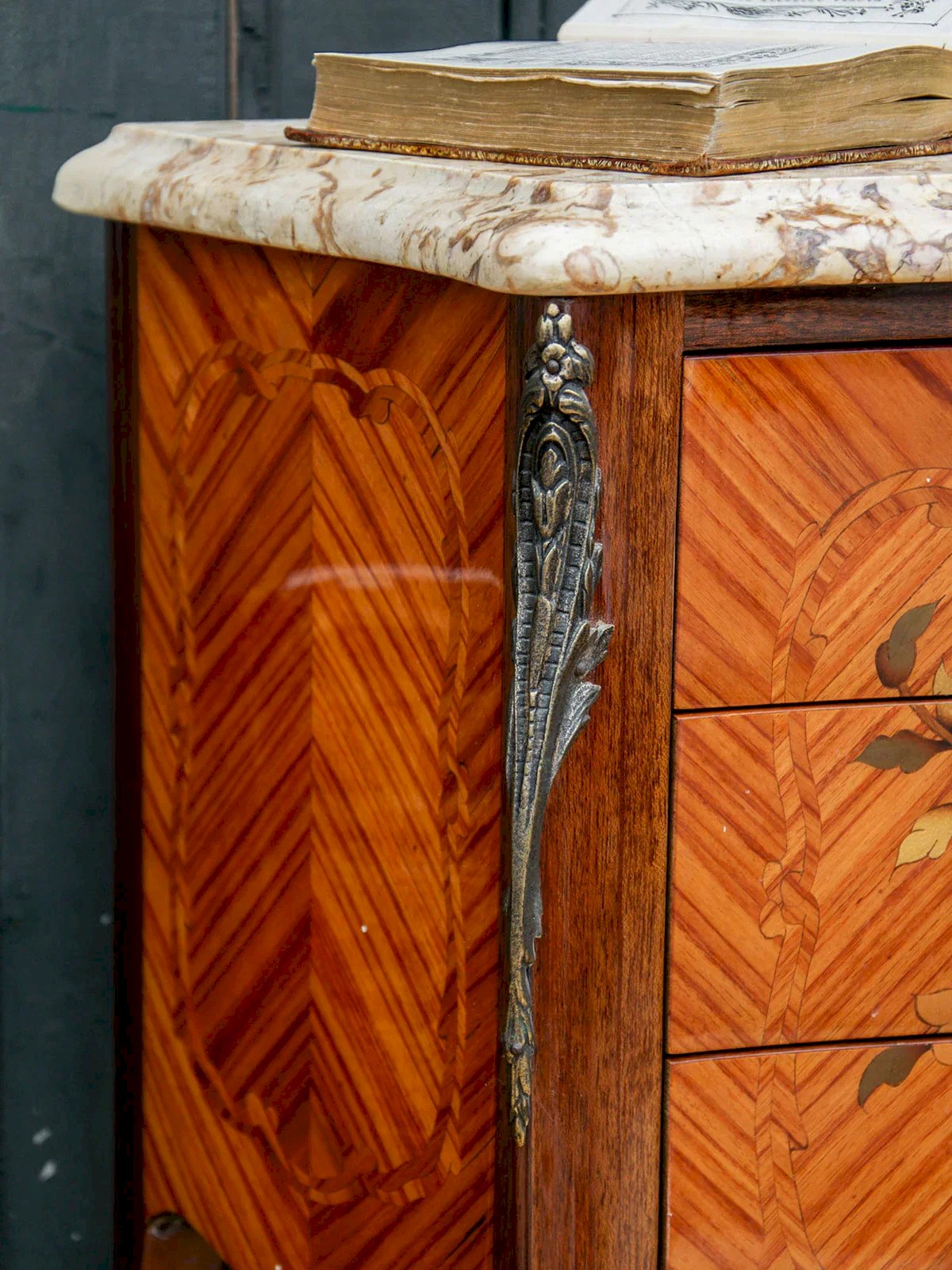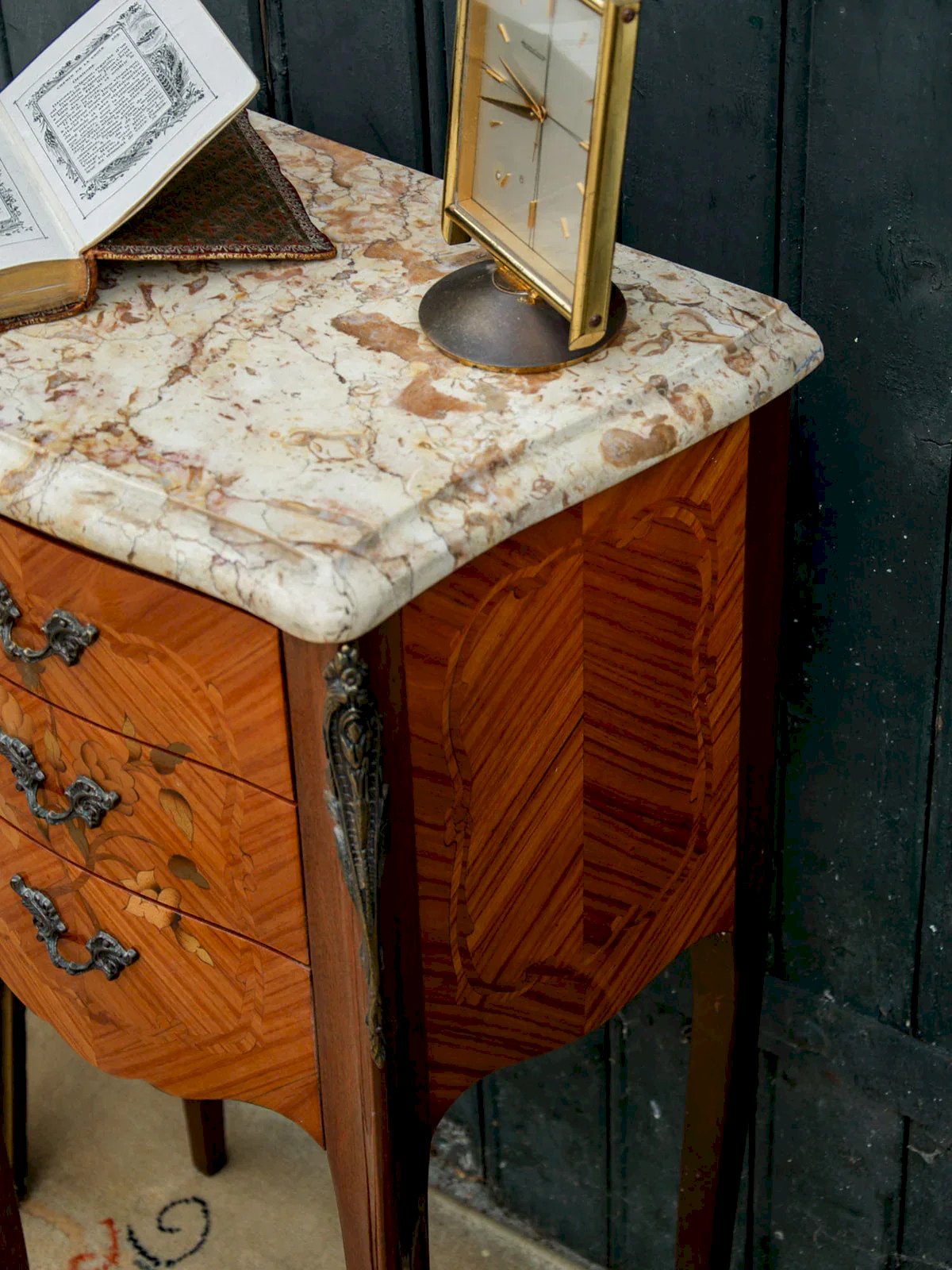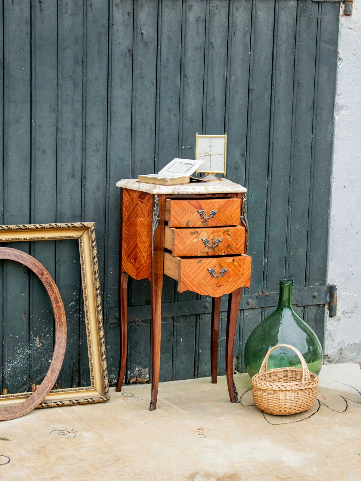 Découvrez ce chevet en bois plaqué au motif raffiné, sublimé par un élégant placage en bois de rose. Il est doté de trois tiroirs pratiques ornés de poignées en métal finement travaillées. Son plateau en marbre jaune apporte une touche de caractère et d’élégance à l’ensemble. Les détails du bois lui confèrent une allure précieuse. Une pièce décorative et fonctionnelle à intégrer dans une chambre ou un salon. Longueur : 41 cm Largeur : 26 cm Hauteur : 74 cm Hauteur du tiroir : 5 cm Petite histoire du chevet Le terme "chevet" désigne depuis le Moyen Âge un petit meuble placé à côté du lit. Initialement conçu comme support pour une lampe ou des objets personnels, le chevet évolue avec le temps pour inclure des tiroirs et des étagères. Essentiel dans la chambre à coucher, il allie aujourd'hui fonctionnalité et design, s’adaptant à tous les styles d'intérieur. État:Occasion: Objet ayant été utilisé. Objet présentant quelques marques d'usure superficielle, ...Occasion: Objet ayant été utilisé. Objet présentant quelques marques d'usure superficielle, entièrement opérationnel et fonctionnant correctement. Il peut s'agir d'un modèle de démonstration ou d'un objet retourné en magasin après une courte période d'utilisation. les éventuelles imperfections. Marque:Debongout Type:Produit chiné Matériau:Bois, Marbre, Métal Style:Campagne Personnalisé:Chevets