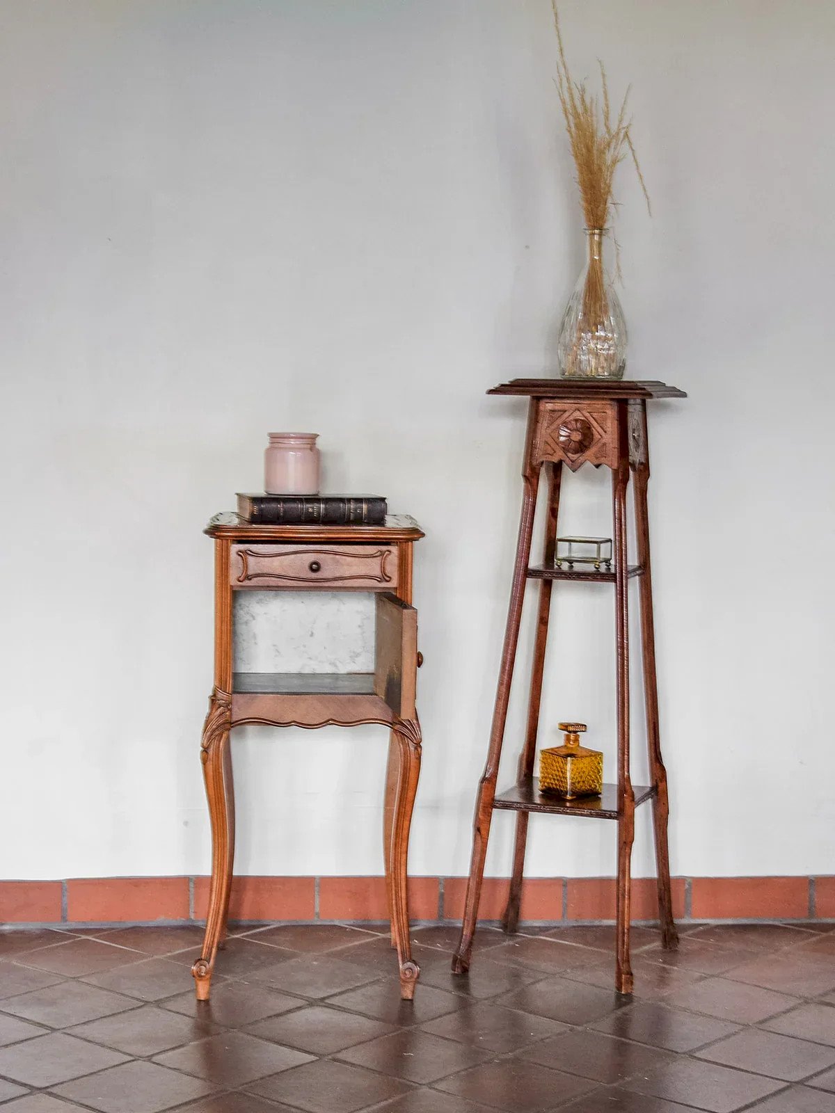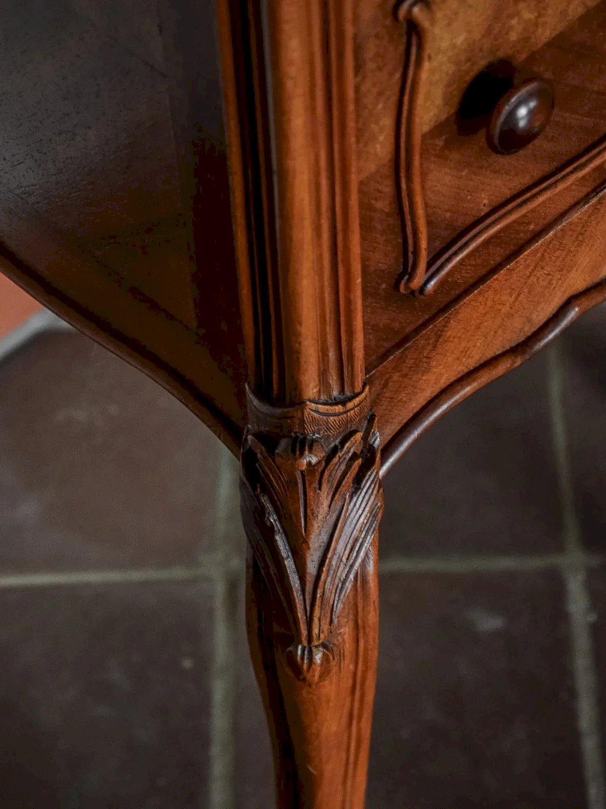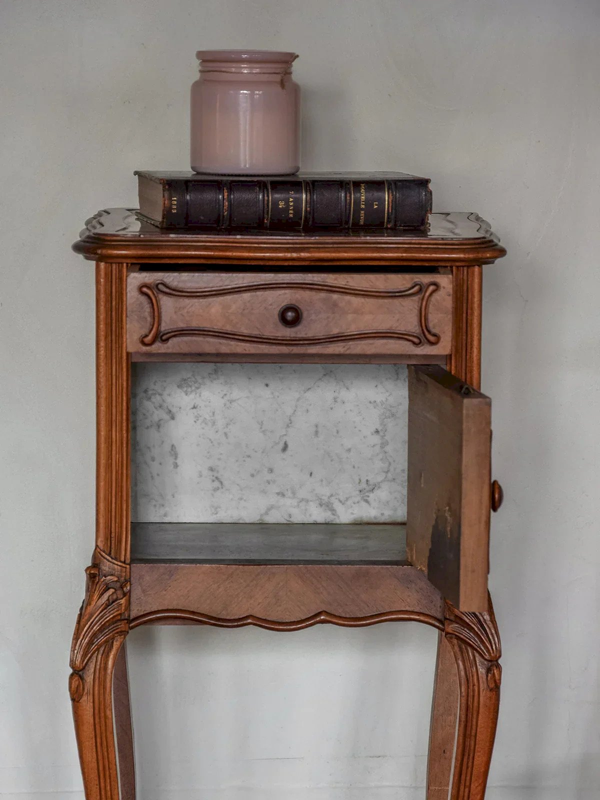 Ajoutez une touche d'élégance à votre chambre avec cette table de chevet en bois ornée de délicates marqueteries. Son plateau en marbre à la teinte marron rouge avec des veines blanches et grises. Dotée de pieds courbés, elle présente de jolis détails qui ne manqueront pas de séduire. Avec un tiroir et une porte, elle offre un espace de rangement fonctionnel tout en s'intégrant parfaitement dans votre décoration. Exclusivité web, la rencontre se fera chez vous ! Longueur : 39 cm Hauteur : 83 cm Hauteur tiroir : 5 cm Profondeur : 39 cm Hauteur de la niche : 18 cm Petite histoire du chevet Le terme "chevet" désigne depuis le Moyen Âge un petit meuble placé à côté du lit. Initialement conçu comme support pour une lampe ou des objets personnels, le chevet évolue avec le temps pour inclure des tiroirs et des étagères. Essentiel dans la chambre à coucher, il allie aujourd'hui fonctionnalité et design, s’adaptant à tous les styles d'intérieur. État:Occasion: Objet ayant été utilisé. Objet présentant quelques marques d'usure superficielle, ...Occasion: Objet ayant été utilisé. Objet présentant quelques marques d'usure superficielle, entièrement opérationnel et fonctionnant correctement. Il peut s'agir d'un modèle de démonstration ou d'un objet retourné en magasin après une courte période d'utilisation. les éventuelles imperfections. Marque:Debongout Type:Produit chiné Matériau:Bois Style:Campagne Personnalisé:Chevets