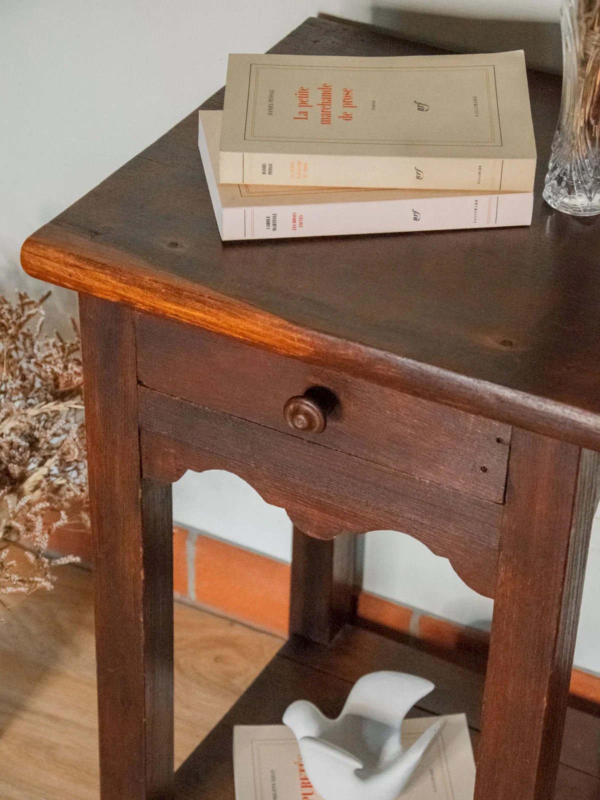 Sublimez votre coin nuit avec ce chevet en bois foncé aux lignes compactes, mariant fonctionnalité et allure classique. Son tiroir unique accueille élégamment vos indispensables, tandis que le plateau bas propose une surface pratique pour une lampe ou une petite pile de livres. Les ornements sculptés sur les quatre rebords apportent un relief délicat et une élégance travaillée, idéale pour une chambre chaleureuse et intimiste. Légères traces du temps présentes. Longueur : 40 cm Largeur : 41 cm Hauteur : 66,5 cm Hauteur tiroir : 5,5 cm Hauteur de la niche : 49 cm Petite histoire du chevet Le terme "chevet" désigne depuis le Moyen Âge un petit meuble placé à côté du lit. Initialement conçu comme support pour une lampe ou des objets personnels, le chevet évolue avec le temps pour inclure des tiroirs et des étagères. Essentiel dans la chambre à coucher, il allie aujourd'hui fonctionnalité et design, s’adaptant à tous les styles d'intérieur. État:Occasion: Objet ayant été utilisé. Objet présentant quelques marques d'usure superficielle, ...Occasion: Objet ayant été utilisé. Objet présentant quelques marques d'usure superficielle, entièrement opérationnel et fonctionnant correctement. Il peut s'agir d'un modèle de démonstration ou d'un objet retourné en magasin après une courte période d'utilisation. les éventuelles imperfections. Marque:Debongout Type:Produit chiné Matériau:Bois Style:Campagne Personnalisé:Chevets