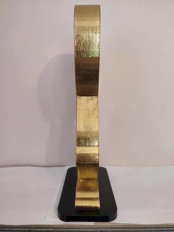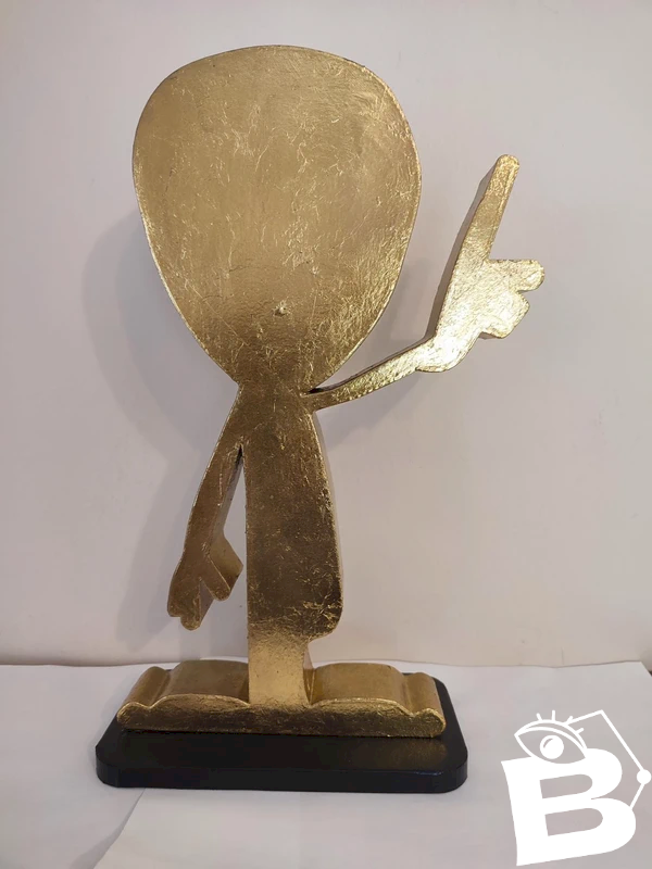 oeuvre originale et unique dessinée et concues en impression 3d par l'artiste pop art / street art PBS en bon etat l'ouvre intitulé "excuse me human?" represente un extraterrestre interrogeant les humains l'oeuvre à ete farbiquée en PLA avant d'etre entierement recouvert de feuille dit "d'or" ( les feuilles sont composees principalement de cuivre avec une fine couche de dorure) il a fallu plus de 100feuilles de 9X9cm pour recouvrir ce personnage qui mesure 35cm de haut 22cm de large et 9cm profondeur avec son socle en pla peint noir l'ouvre est unique et a ete acquis directement au pres de l'artiste