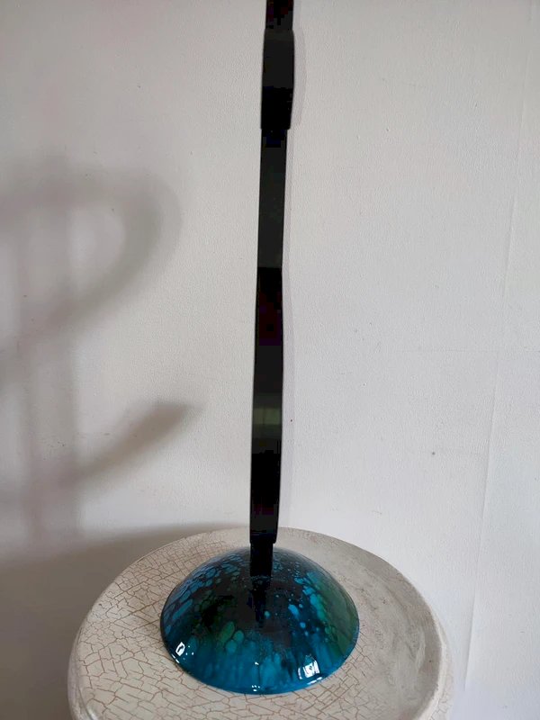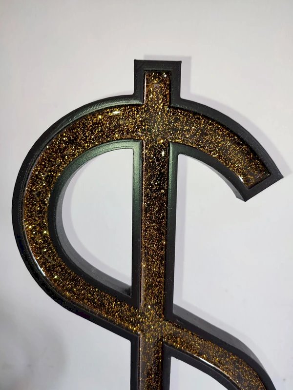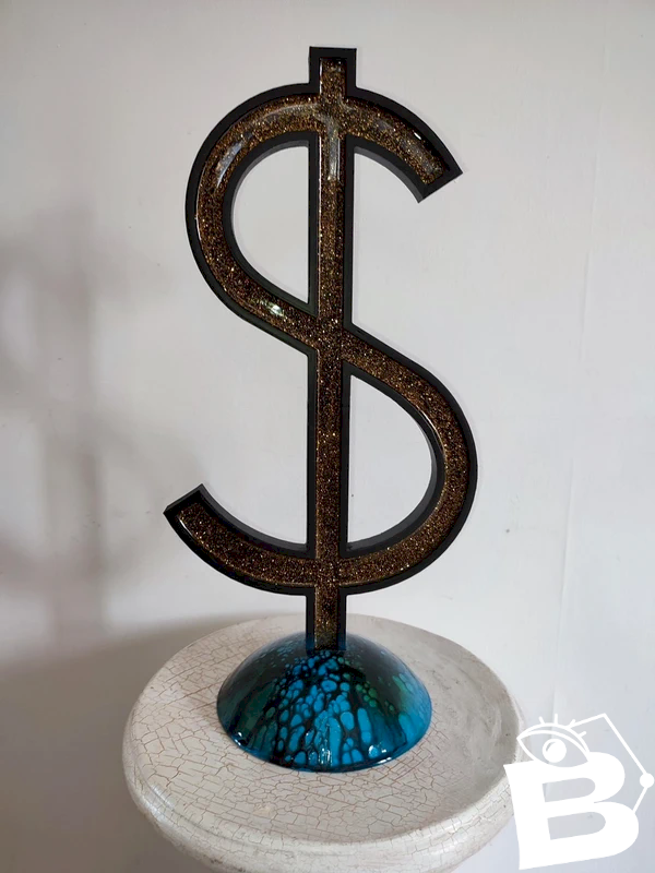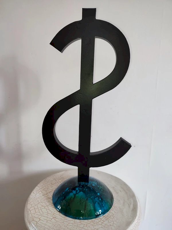 l'interieur du dollar est creuse avec incrustation de paillette doré dans la resine qui à ete coulé ensuite à l'interieur la partie basse qui sert de socle, egalement en PLA forme une partie de globe pour representer la terre il est entierement recouvert de resine dans laquelle l'artiste à integré plusieurs couleurs dont le noir pour donner cette impression de pollution recouvrant la planete sculpture de belle taille car elle mesure pres de 40cm cm de haut et legere du fait de son type de materiaux l'artiste travaille en gardant le plus possible les pieces en sortie d'impression brut, on peut donc voir par endroit les traits de fabrication de l'impression 3d unique à chaque impression objet super design...
