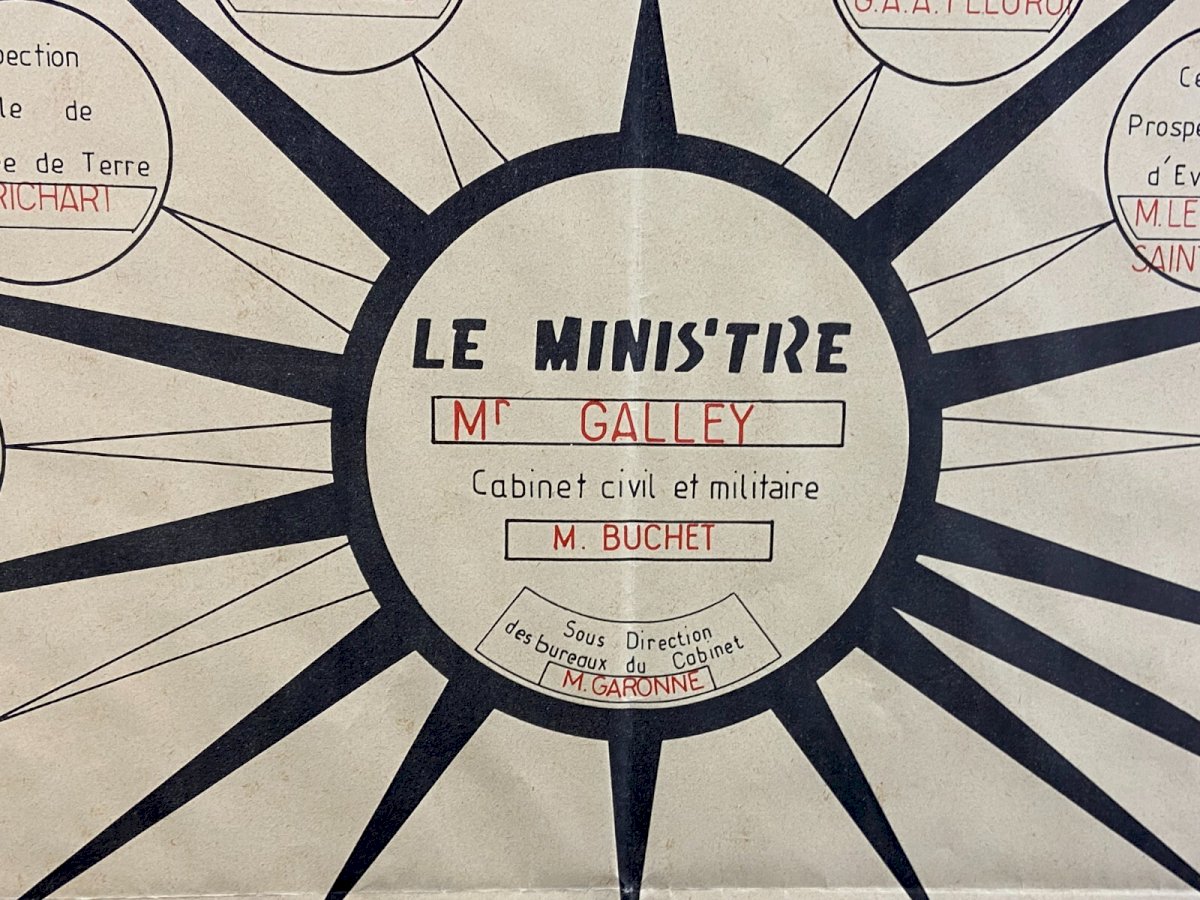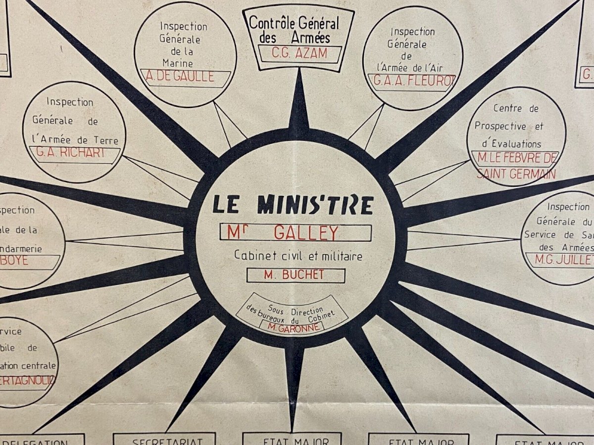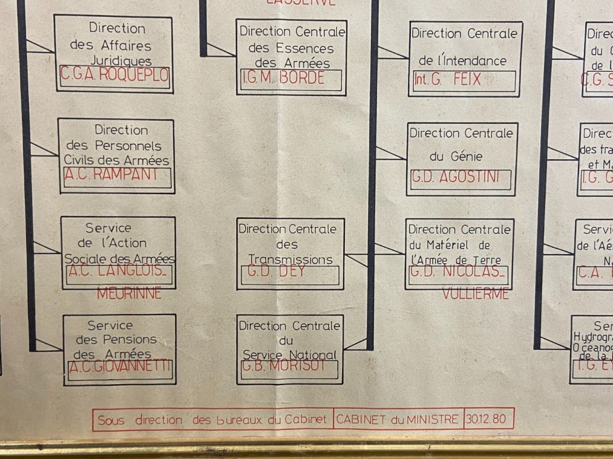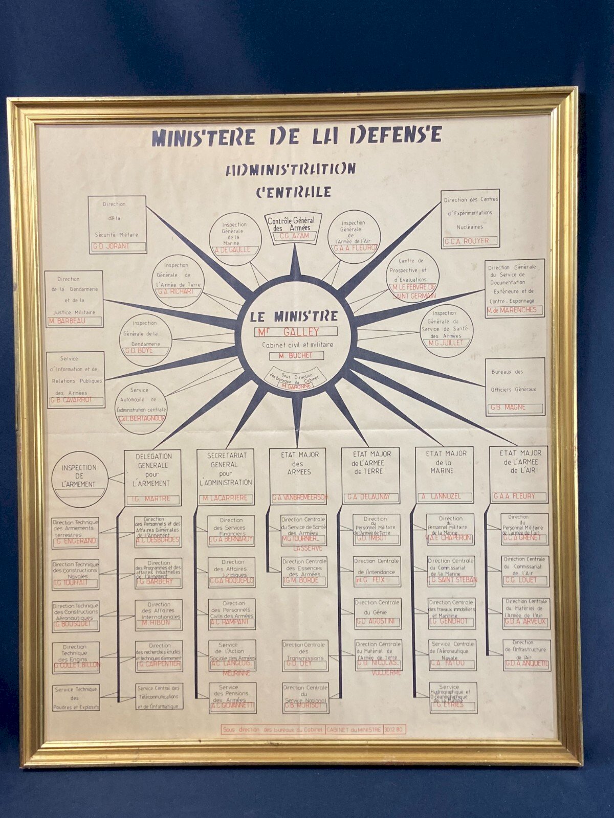 Organigramme du Ministère de la Défense, Administration Centrale, Sous-direction des bureaux du cabinet, Cabinet du Ministre Référence du document officiel : 3012-80 Ministre : M. GALLEY Dimensions avec cadre : 60,9 x 51,2 cm / Dimensions hors cadre : 56,5 x 46,8 cm Poids : 1604 grammes Envoi ultra sécurisé à destination du monde entier - Retrait des commandes possible sur rendez-vous, 7 rue Notre-Dame 18000 Bourges. - Possibilité de groupage au sein d'un même colis : merci de bien vouloir me contacter préalablement afin que je puisse calculer vos frais de transport optimisés. Pays d'origine:France Type:Document Période:1973-1981 Sous-type:Organigramme Pays, Organisation:France
