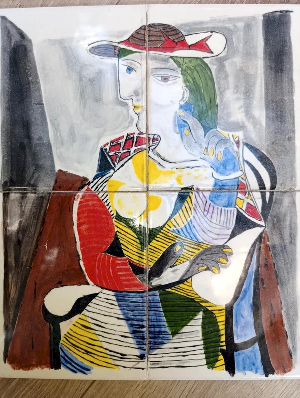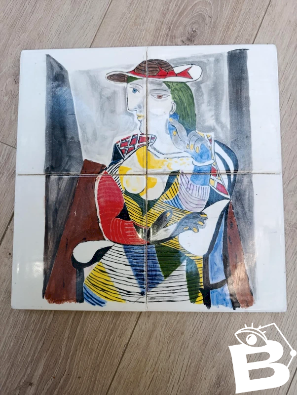 original grand dessous de table carrelé decor picasso en bon etat corps en bois et dessus carrele un peu d'usures du contour en bois (voir photos) et quelques petites marques d'usures normales d'utilisation sur le dessus dimension 30.5X30.5cm...