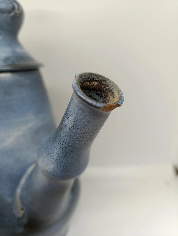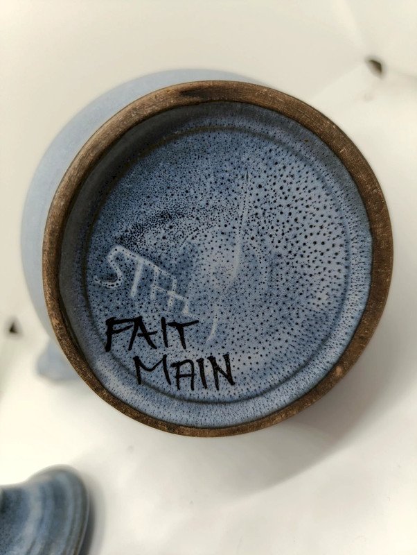 Ancien pichet / vase en gres à coulure bleu signé JT en bon etat (made in chiner)