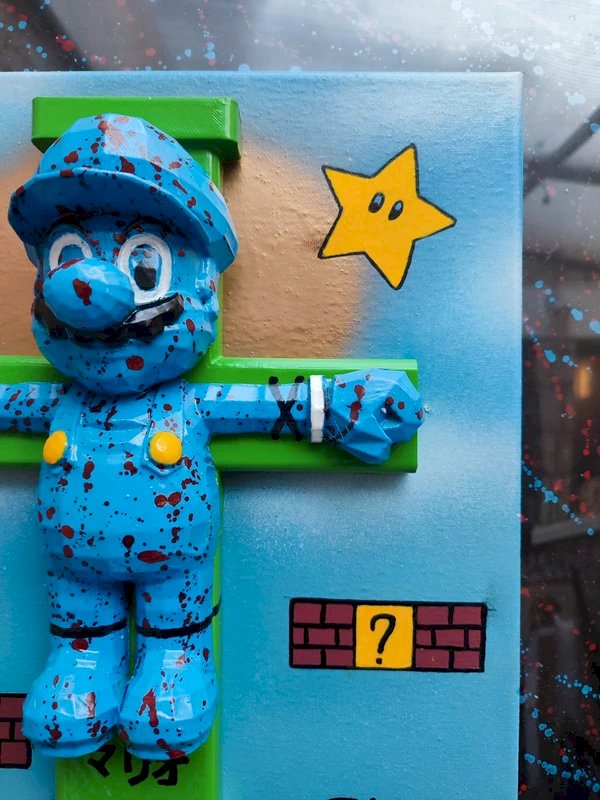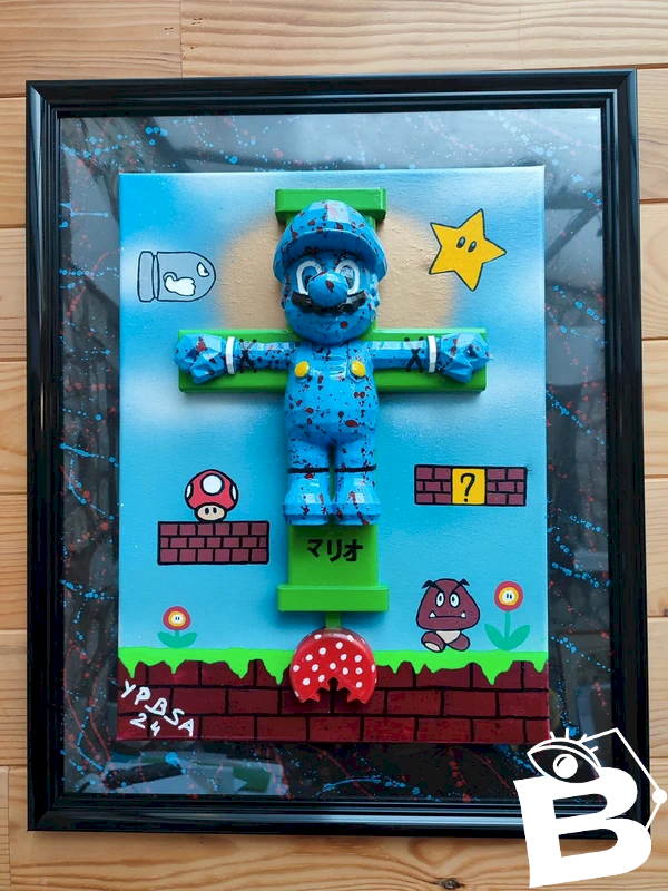 original tableau signé PBS renommé YPBSA pour cette oeuvre uniquement appelé "mario christ" en tres bon etat l'artiste a dessiné un fond sur une toile representant le decor de mario bros avant de concevoir le mario ainsi que la croix en impression 3D qui est une des particularités de cet artiste qui mélange la peinture acrylique à la modernité en utilisant l'impression 3 D ou encore la resine petit clin d'oeil avec le nom mario ecrit en japonais sous le personnage et le pseudo de l'artiste YPBSA pour se rapprocher d'un nom japonais en dedicace à l'origine de mario uniquement pour cette oeuvre l'œuvre est signé et unique le cadre mesure 53.5CM X 43.5cm sur laquelle on peut noté un projeté rouge et bleu pour rappeler mario et le tableau mesure en lui meme 40X30cm...