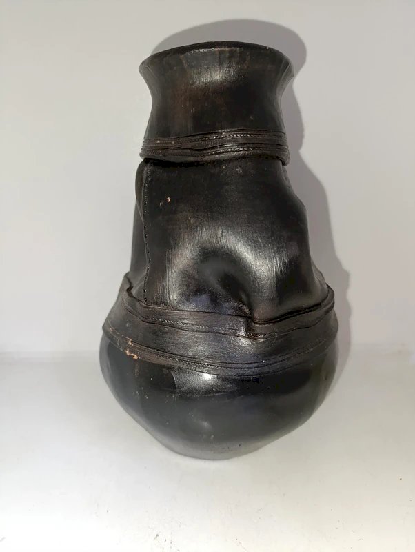 original vase en forme de besace ou sac en terre cuit peint signé et daté en bon etat