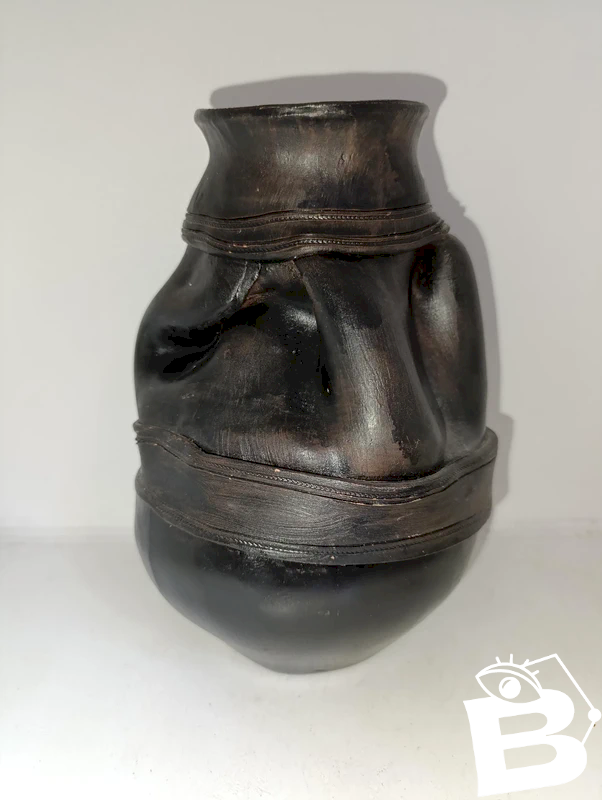 original vase en forme de besace ou sac en terre cuit peint signé et daté en bon etat hauteur 22cm quelques petits manques de couleurs