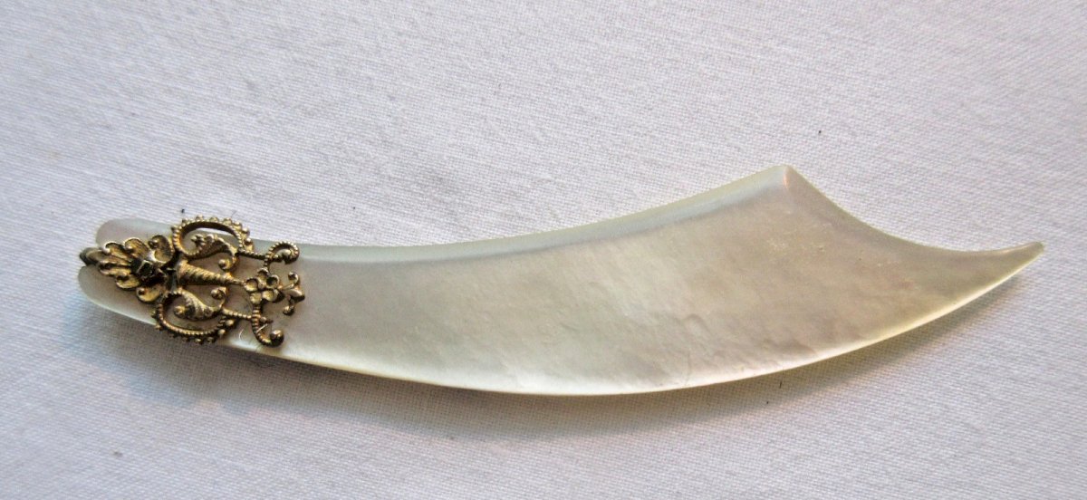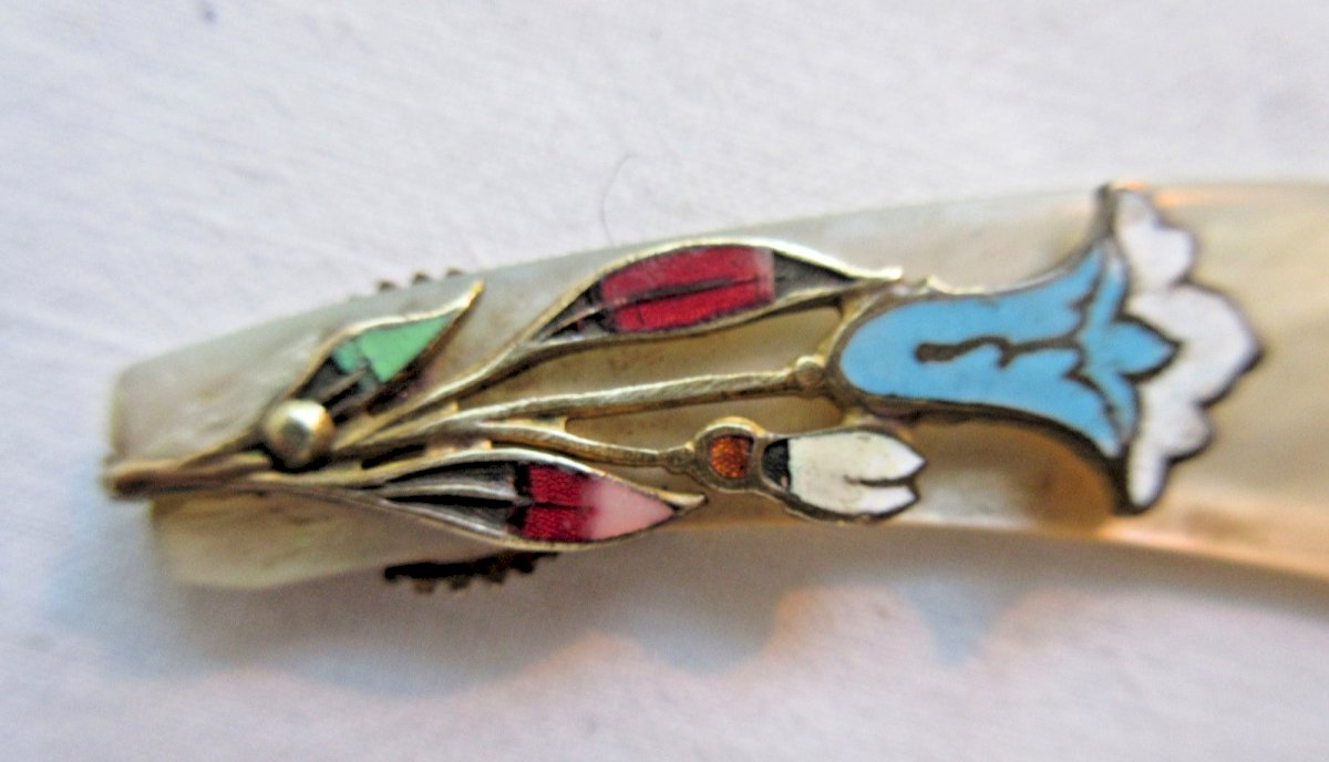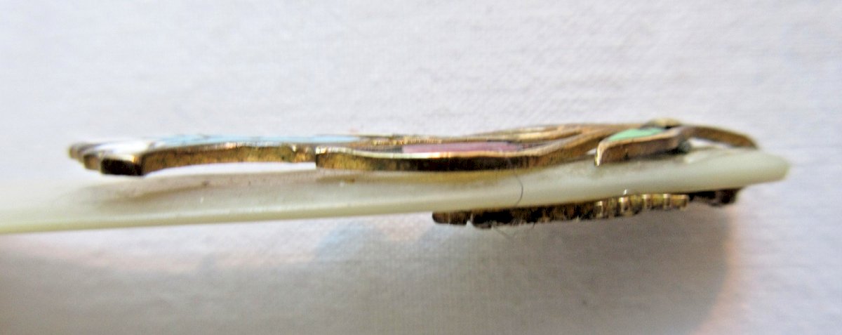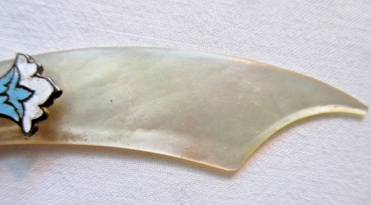 Ouvre lettre faisant marque-page, lame en nacre, déco laiton et émaux cloisonnés