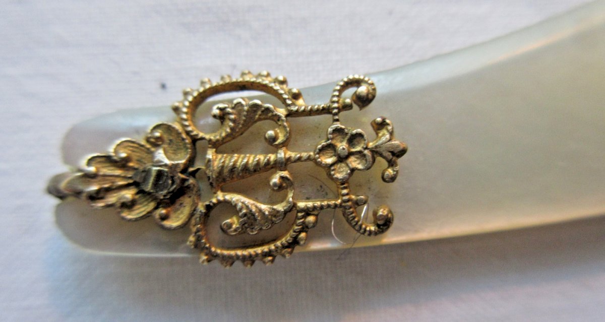 Vente dans le monde entier. Ouvre lettre en nacre  faisant aussi office de marque-page. Sur la lame, une petite décoration en émaux cloisonnés. Elle est légèrement surélevée d'1 ou 2 mm. pour servir de marque-page très original. Parfait état, aucun défaut. Dimensions: 9 cm de long sur 2 cm de large. Bel objet authentique à collectionner. Authenticité:Original Type:Objet de vitrine, Décoratif Période:Art Déco Origine:France Sous-type:Encrier, Plumier Pays de fabrication:France Matière:Laiton