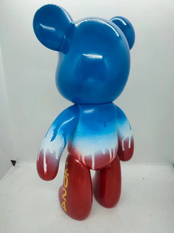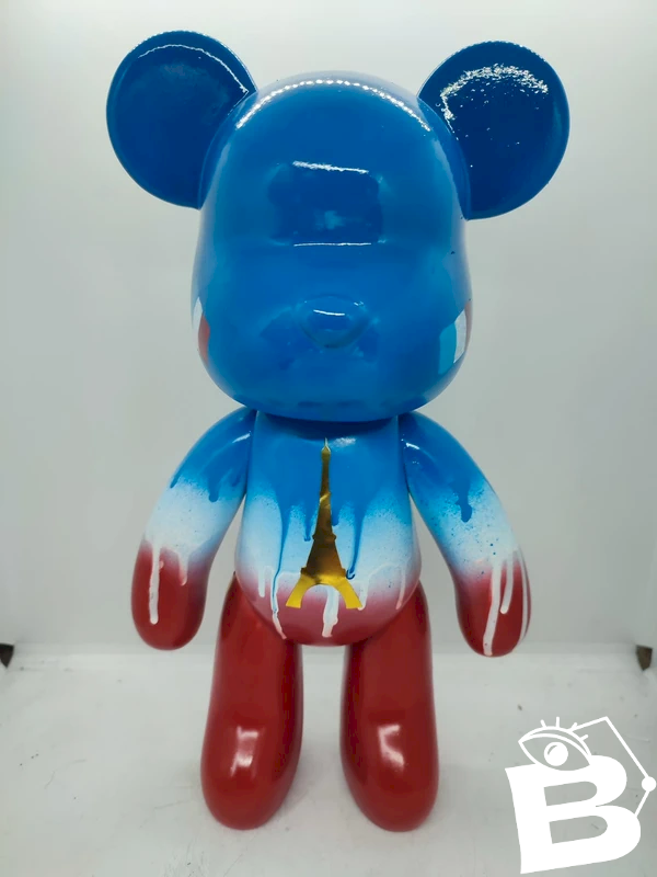 œuvre unique sur base d'une sculpture d'ours en pvc entièrement repeint main au couleur de la france et en rapport avec les jeux olympiques de paris l'œuvre est appelée " french bear" travail des couleurs fait main (pas de pochoir ni scotch de marquage donc avec ses qualites et defaus ) à la bombe , peinture ,marqueur acrylique et vynile adhesif.