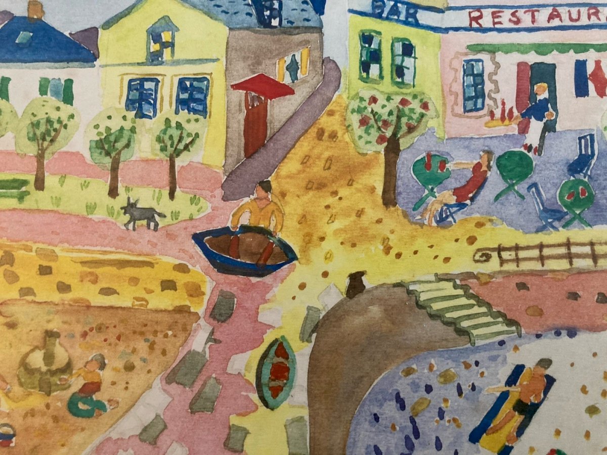 Painting peinture 1970 Gouache Art Brut À Identifier FP Naïf Village Bretagne ?