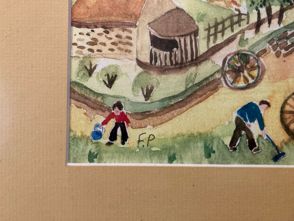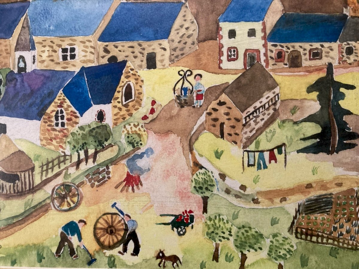 Painting peinture Gouache Art Brut À Identifier FP Naïf Village Bretagne? 1970