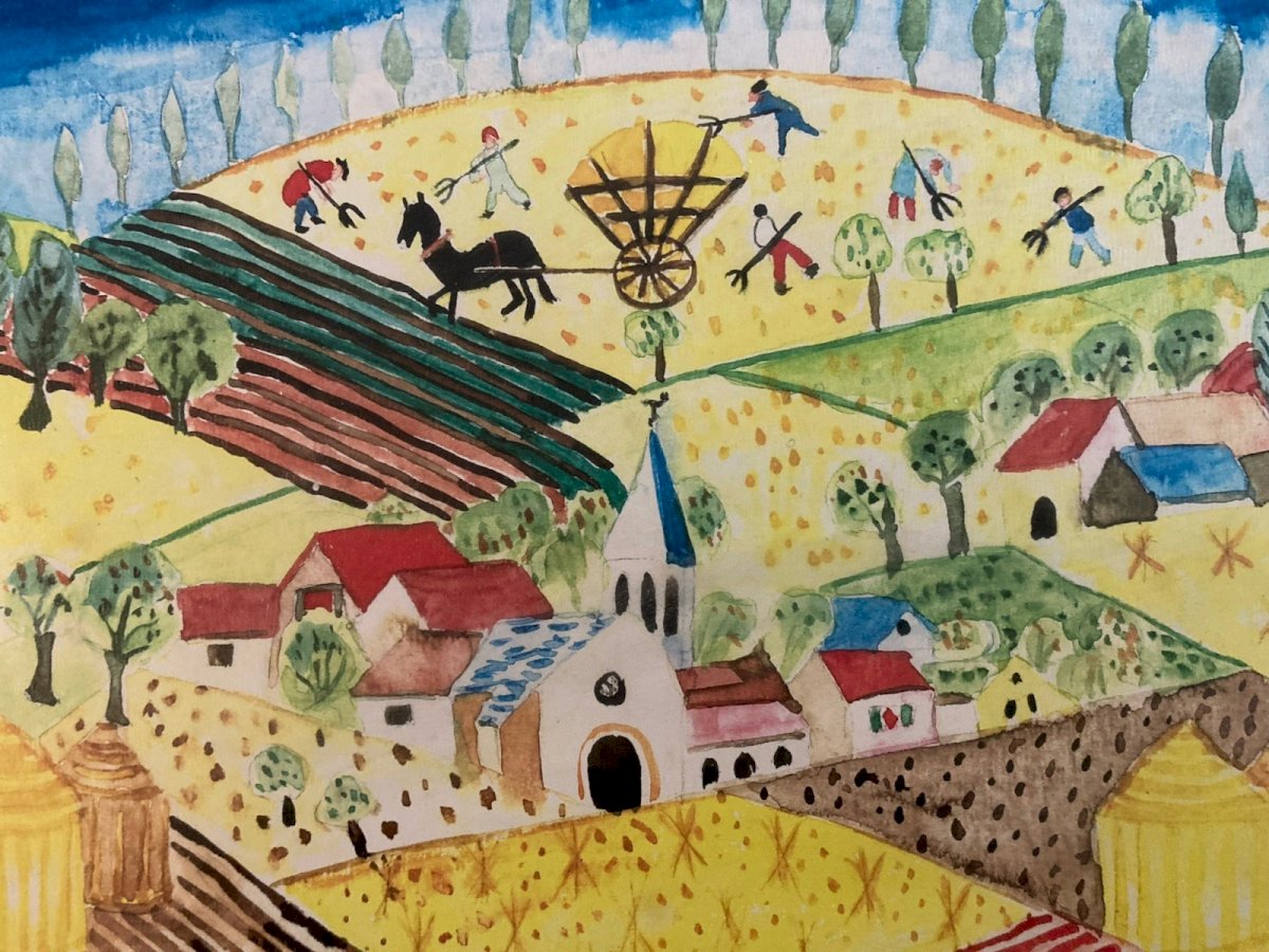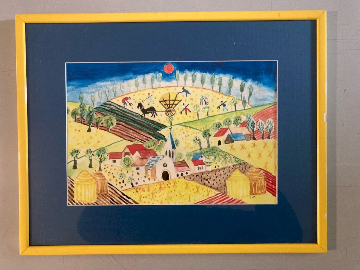 Painting peinture Gouache Art Brut À Identifier FP Naïf Village Bretagne ? 1970