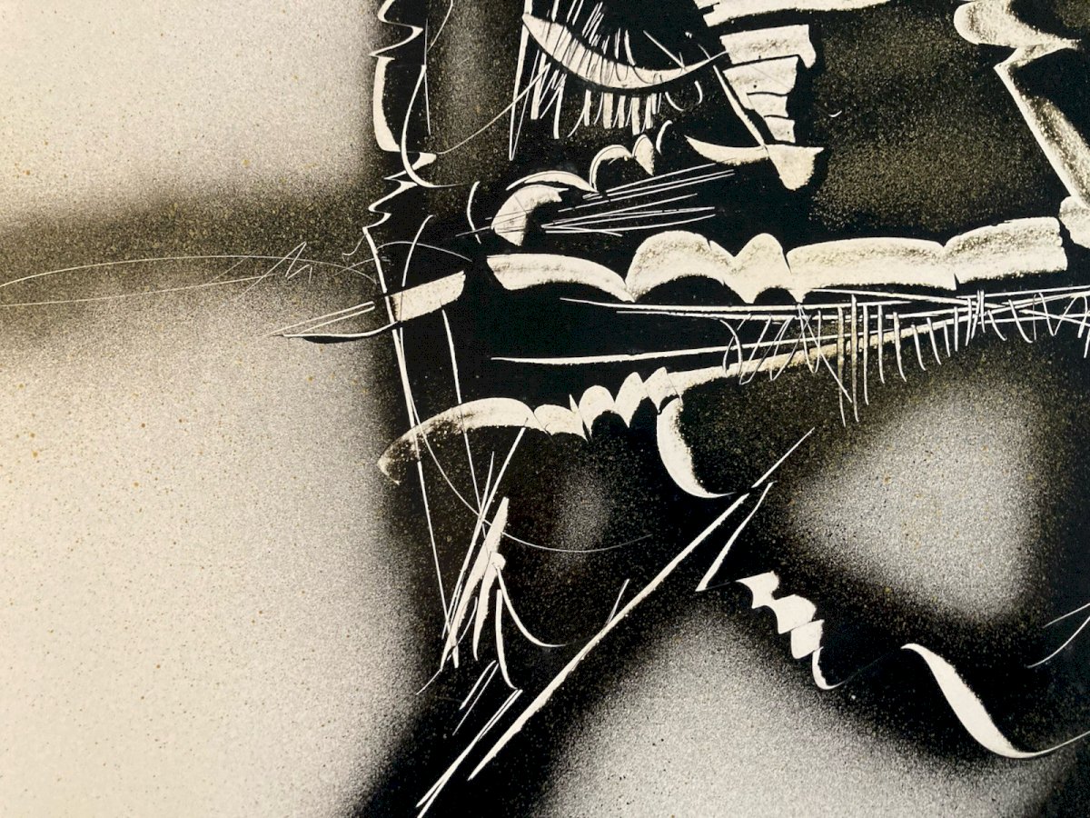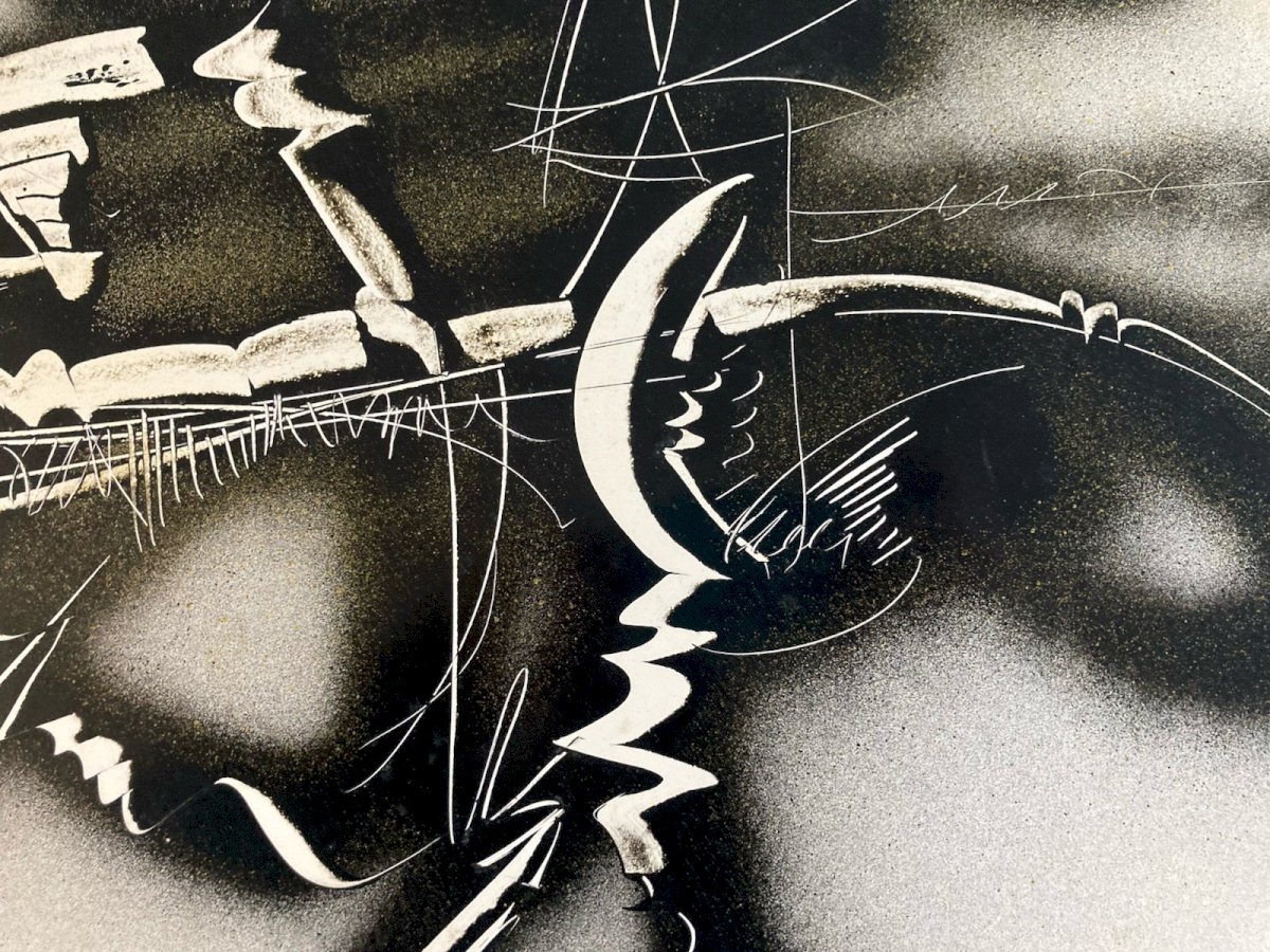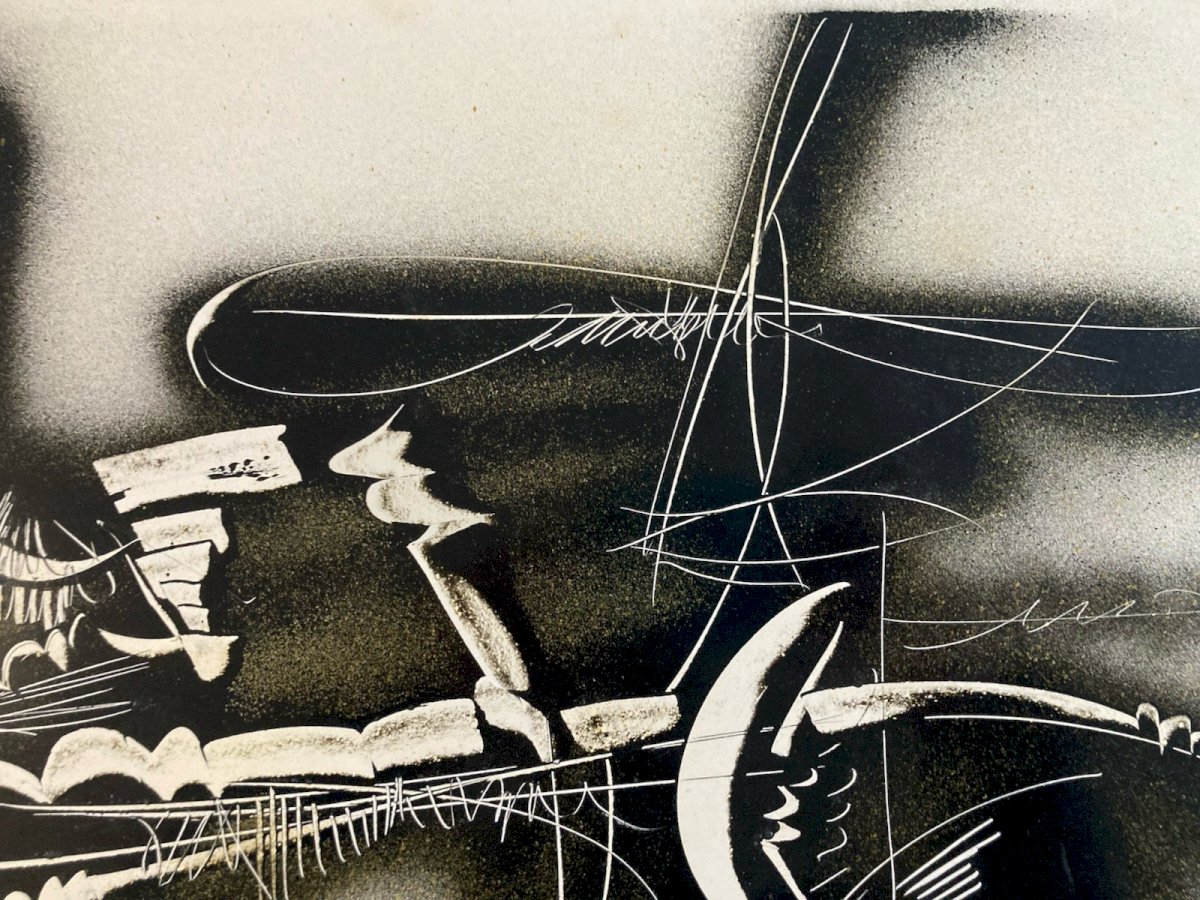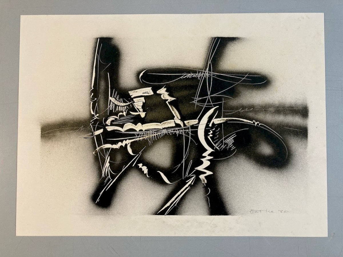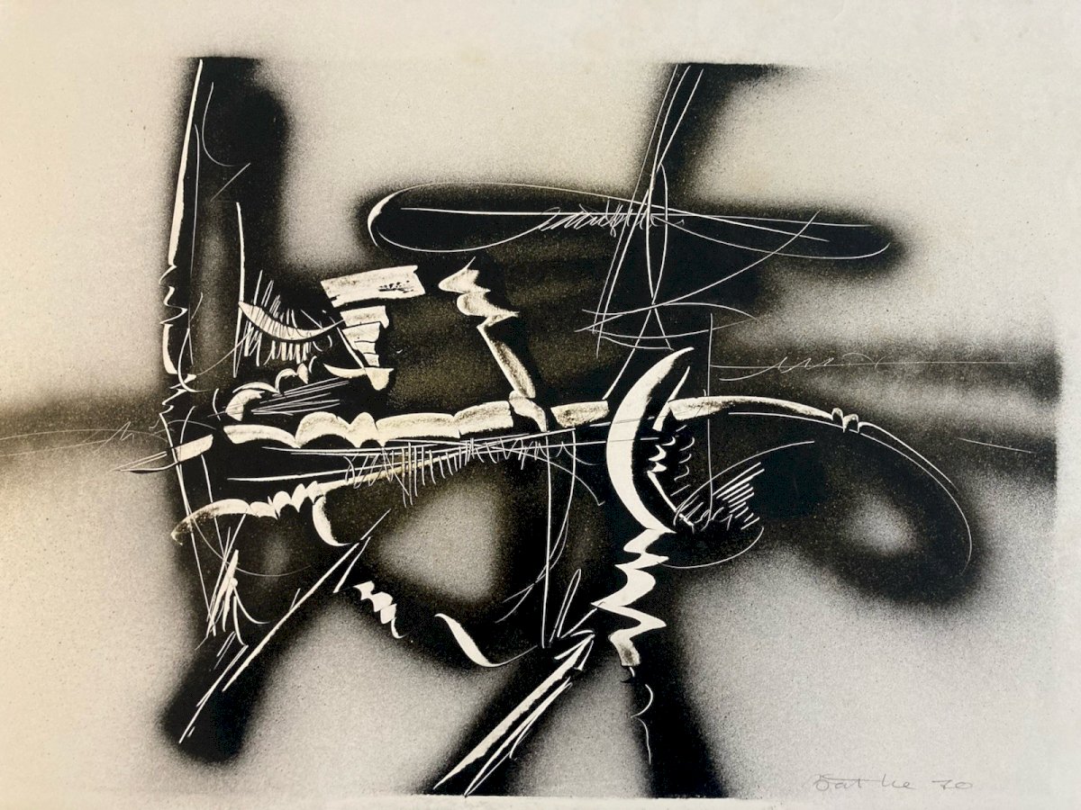 Michel BATLLE (né en 1946) Composition abstraite, 1970 Encre et peinture aérosol sur papier Dimensions : 60 × 43 cm Signée et datée en bas à droite (1970) Œuvre abstraite sur papier réalisée à l’encre et à la peinture aérosol, caractéristique des recherches menées par Michel Batlle à la fin des années 1960 et au début des années 1970. La composition associe des zones pulvérisées sombres à des réserves claires, traversées de lignes incisives et de gestes graphiques spontanés, créant une tension entre contrôle et expressivité. Le travail du contraste, de la trace et du mouvement inscrit cette œuvre dans le prolongement de l’abstraction lyrique et de l’art informel, tout en annonçant les recherches ultérieures de l’artiste autour du signe, de l’écriture et du graffiti. L’utilisation de l’aérosol, encore peu répandue à cette époque sur papier, confère à l’ensemble une dimension expérimentale et résolument contemporaine. Œuvre sur papier signée et datée, provenant d’une ancienne collection toulousaine (collection Jean Dieuzaide). Bon état général, avec légères marques du temps liées à la nature du support. ⸻ Michel Batlle – Biographie Né en 1946 à Monaco, Michel Batlle est un artiste français majeur de la scène contemporaine, actif dès la fin des années 1960. Après des études d’art, il développe très tôt une pratique expérimentale mêlant abstraction gestuelle, signes, écriture et techniques non conventionnelles, notamment l’usage de la peinture aérosol. Dans les années 1970, son travail s’inscrit dans une réflexion autour du signe, du langage et du graffiti, le plaçant parmi les précurseurs d’une esthétique urbaine et conceptuelle. À partir des années 1980, Michel Batlle connaît une reconnaissance internationale, exposant dans de nombreuses galeries et institutions en France et à l’étranger. Son œuvre est aujourd’hui présente dans plusieurs collections publiques et privées. Produits recommandés Provided by Très Belle Peinture Abstraite Aquarelle Sur Papier Abstrait Abstraction Signé Voir le produit Belle Peinture Abstraite Aquarelle Gouache Sur Papier Abstrait 1980 Abstraction Voir le produit Type:Composition mixte Pays d'origine:France Style:1960 Genre:Abstrait Caractéristiques:Signé Thème:Abstrait