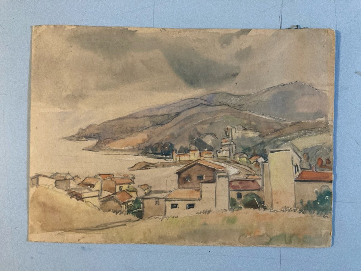 Painting Peinture Village Côte Basque ?Marine Bateau Mer Ancien 1950 Old Art XXe