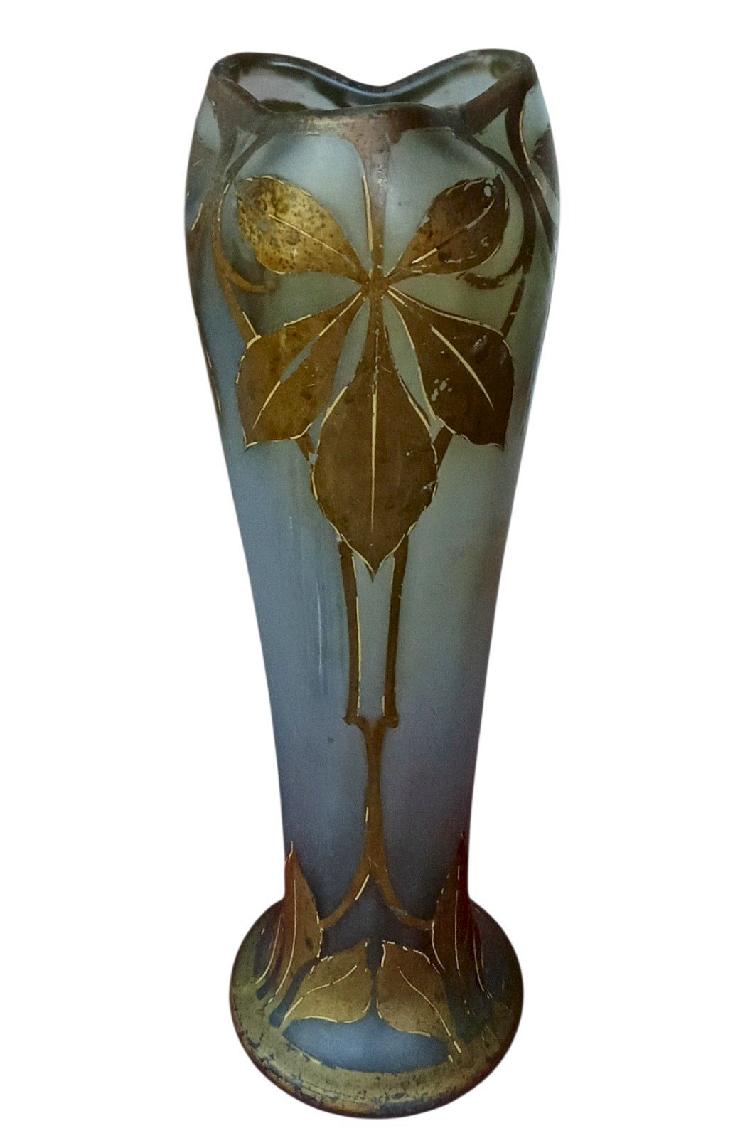 Ancienne Paire de très grands vases Belgrade Legras Art nouveau Bleu pâle avec feuilles de châtaignier dorées Belles pièces Bon état Décor un peu estompé par endroit Hauteur 41 cm Diamètre bas 13.5 cm Marque:Legras