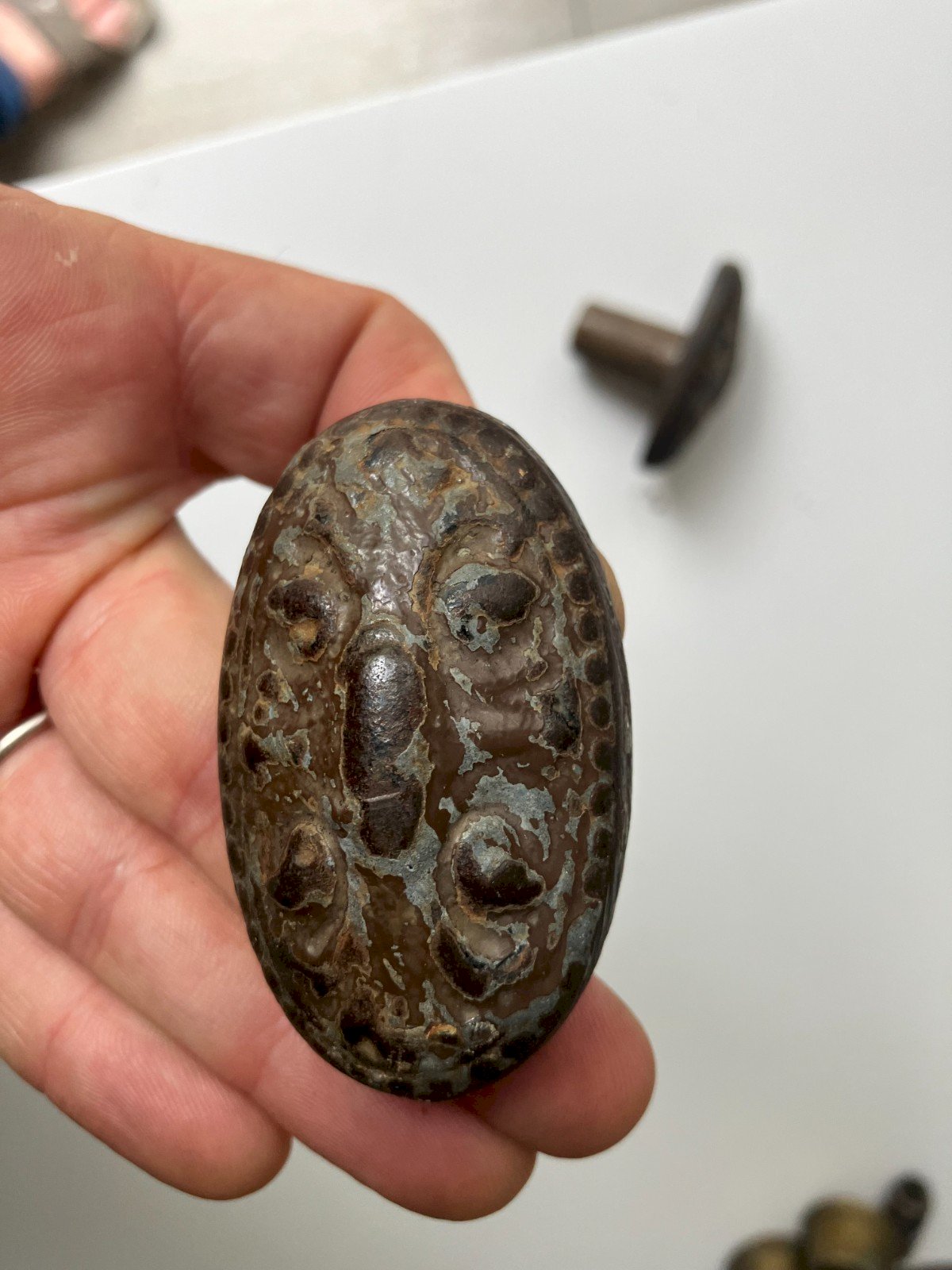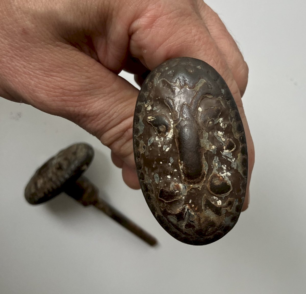 paire d' anciennes poignées olives de porte en fer forge avec un carré de 6 mm fixé sur l' une - longueur du carre 7,5 cm dimensions poignees hauteur 6,2x largeur 3,7 x profondeur 4,6 cm expedition gratuite par MONDIALRELAY Type:Porte Matière:Fer Forgé