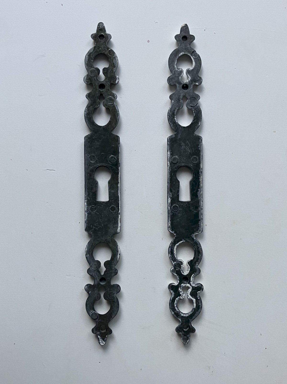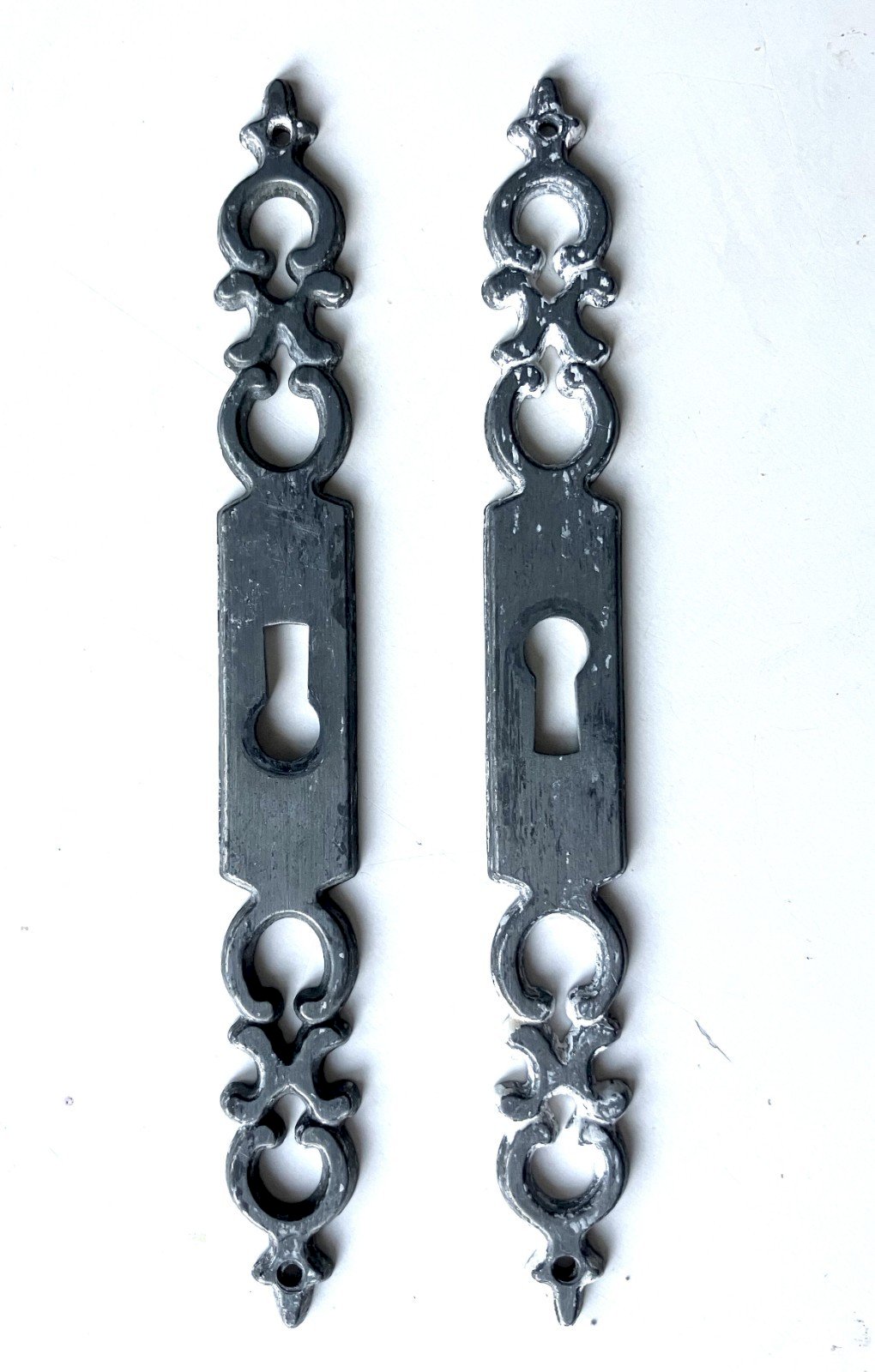 paire d' entrees de serrure hauteur 142 mm largeur 16 mm epaisseur 2 mm hauteur totale du trou de serrure 16 mm diametre trou superieur 7 mm bon etat general - des residus de peinture expedition en lettre suivie