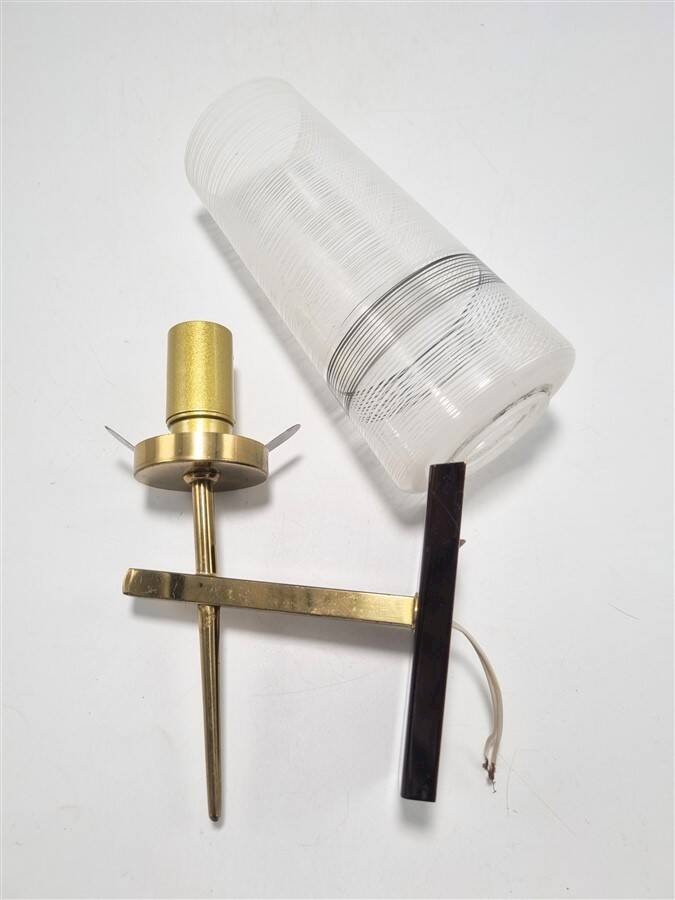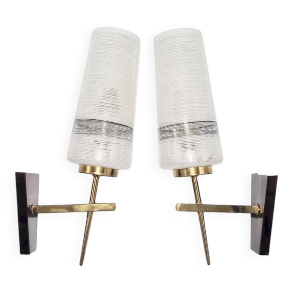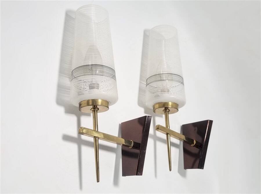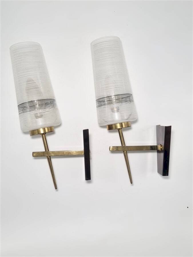 Paire d'appliques murales vintage.Globes en verre au motif noir et blanc, bras en laiton, dorés et bruns, présentant de discrètes traces du temps (voir photo.)Douilles E14.Hauteur: 30 cm.Largeur: 8 cm.Profondeur: 15.5 cm.Poids: 670 g.