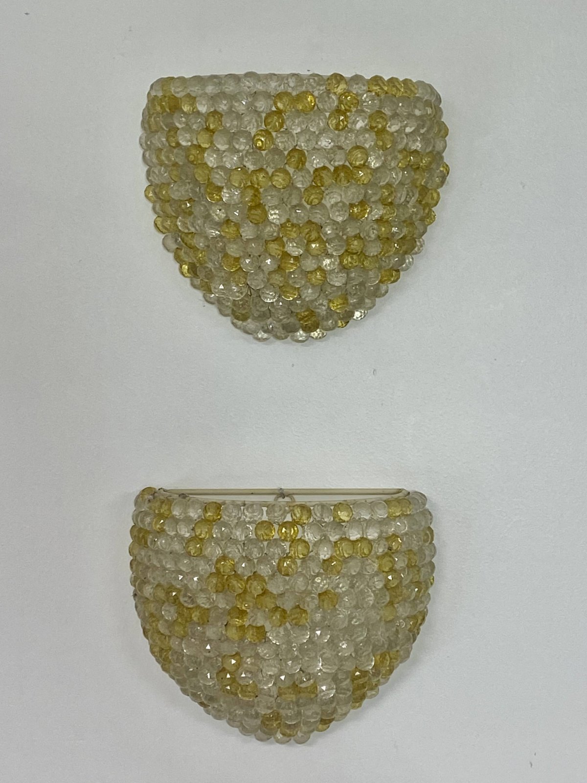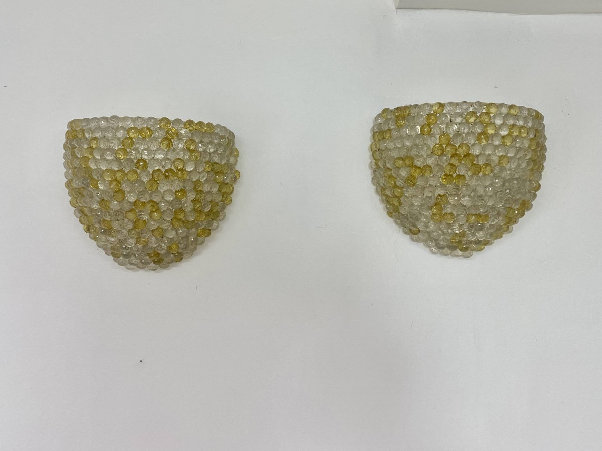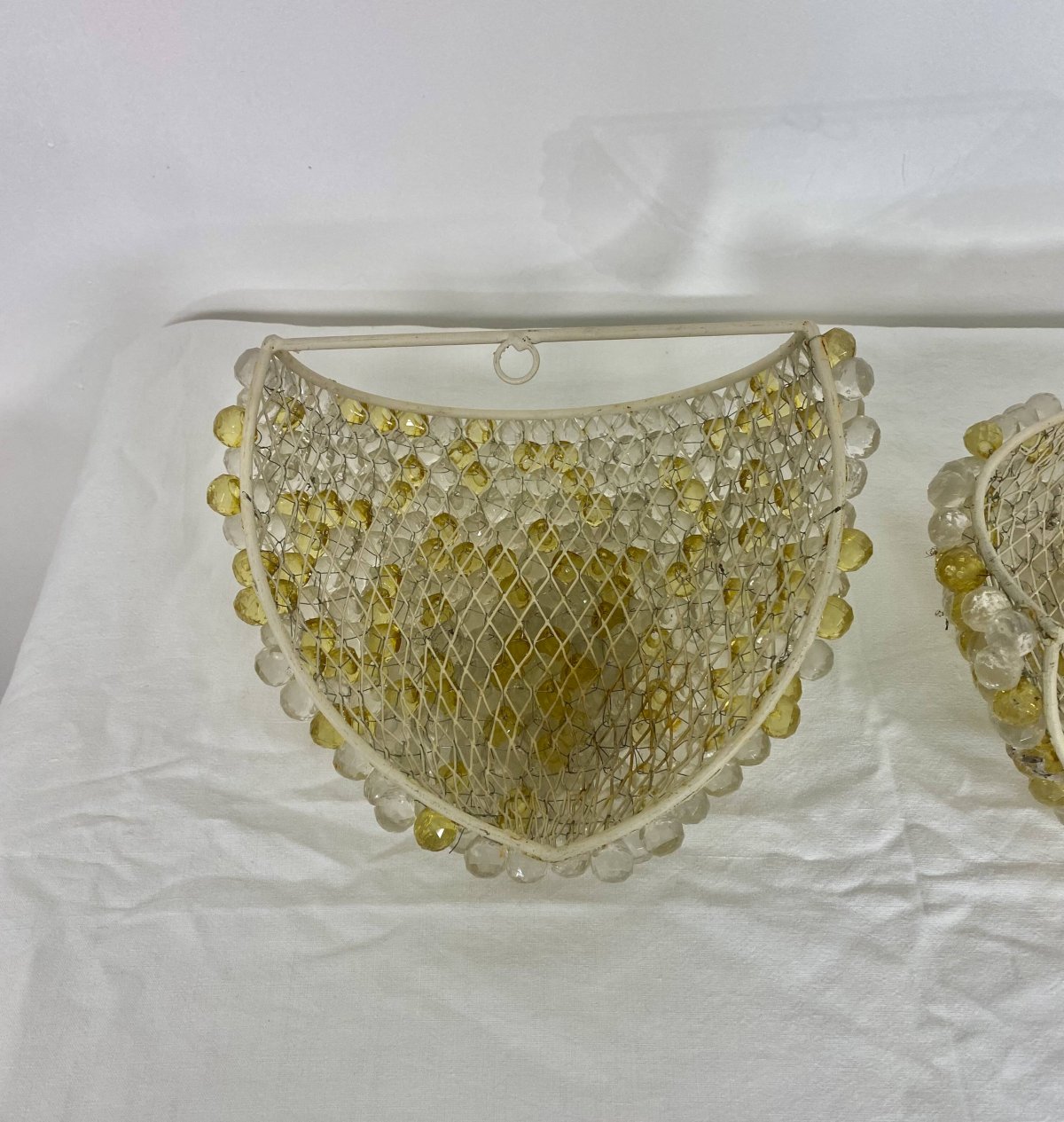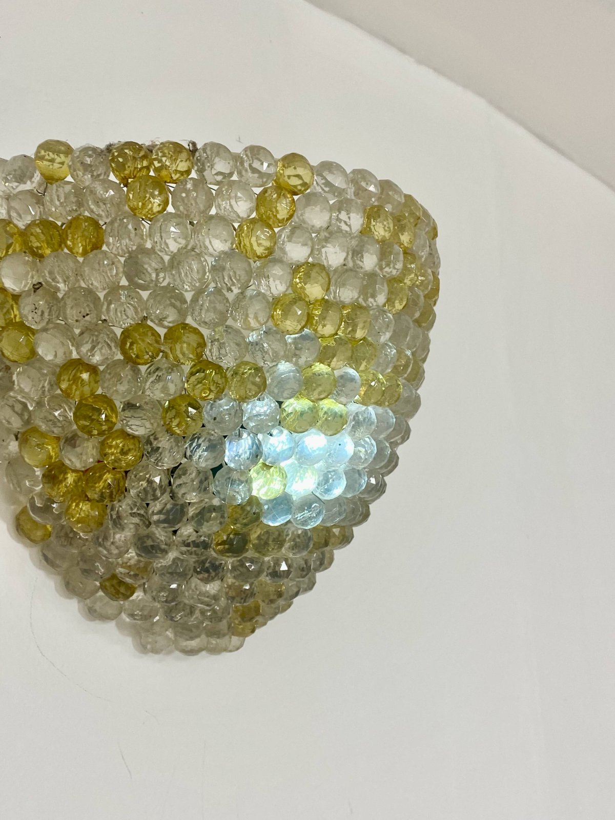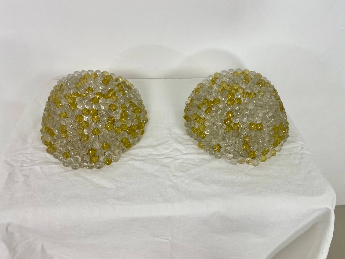 Très belle paire d’appliques murales des années 70, ornées de perles jaunes et transparentes.Les perles, en plastique, créent un joli mélange de couleurs et apportent un charme rétro typique des années 70–80.Une fois allumées, elles diffusent une lumière douce et légèrement perlée, parfaite pour une ambiance chaleureuse et décorative.En parfait état.Dimensions:— Hauteur: 19 cm.— Largeur: 20 cm.— Profondeur: 10 cm.— Poids: 1 kg.