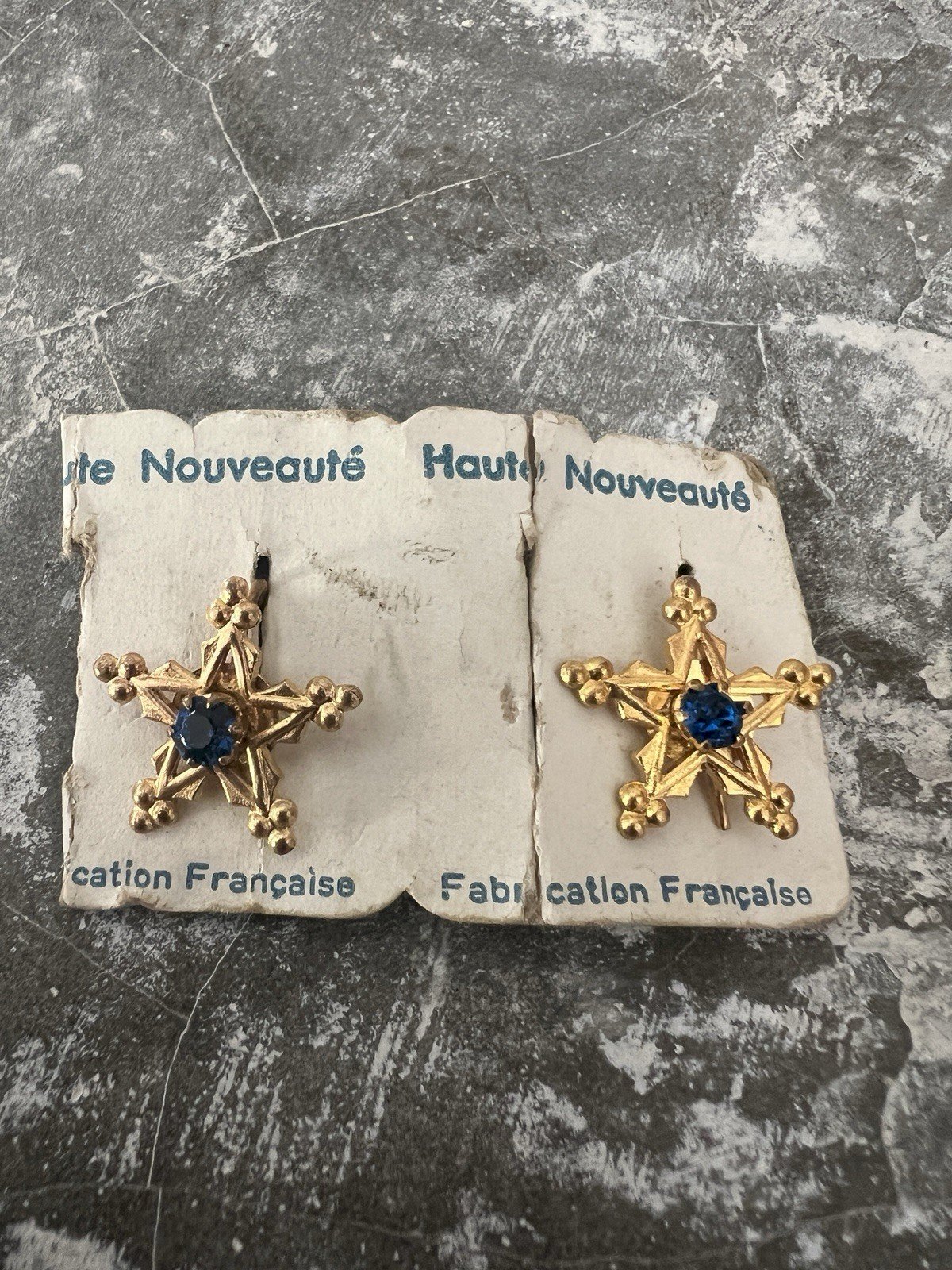 Paire de boucles d’oreilles étoile stock neuf ancienne vers 1930 dormeuses. Paire de boucles d’oreilles, étoile, serti d’un strass bleu avec son carton d’origine vers 1930 provenant d’un stock neuf, ces boucles d’oreilles sont extrêmement légère. Elles pèsent toutes les deux, 3,1 g environ et mesurent environ 2 cm sur 2 cm. Évidemment, excellent état de conservation. État:Occasion: Objet ayant été porté. ...Occasion: Objet ayant été porté. les éventuelles imperfections. Fermoir:Dormeuses Type:Boucle Pierre dominante:Bleu Strasse Marque:Boucle d’oreille, 1930 Pays d'origine:France Couleur dominante:Doré Matière:Verre Métal:Alliage