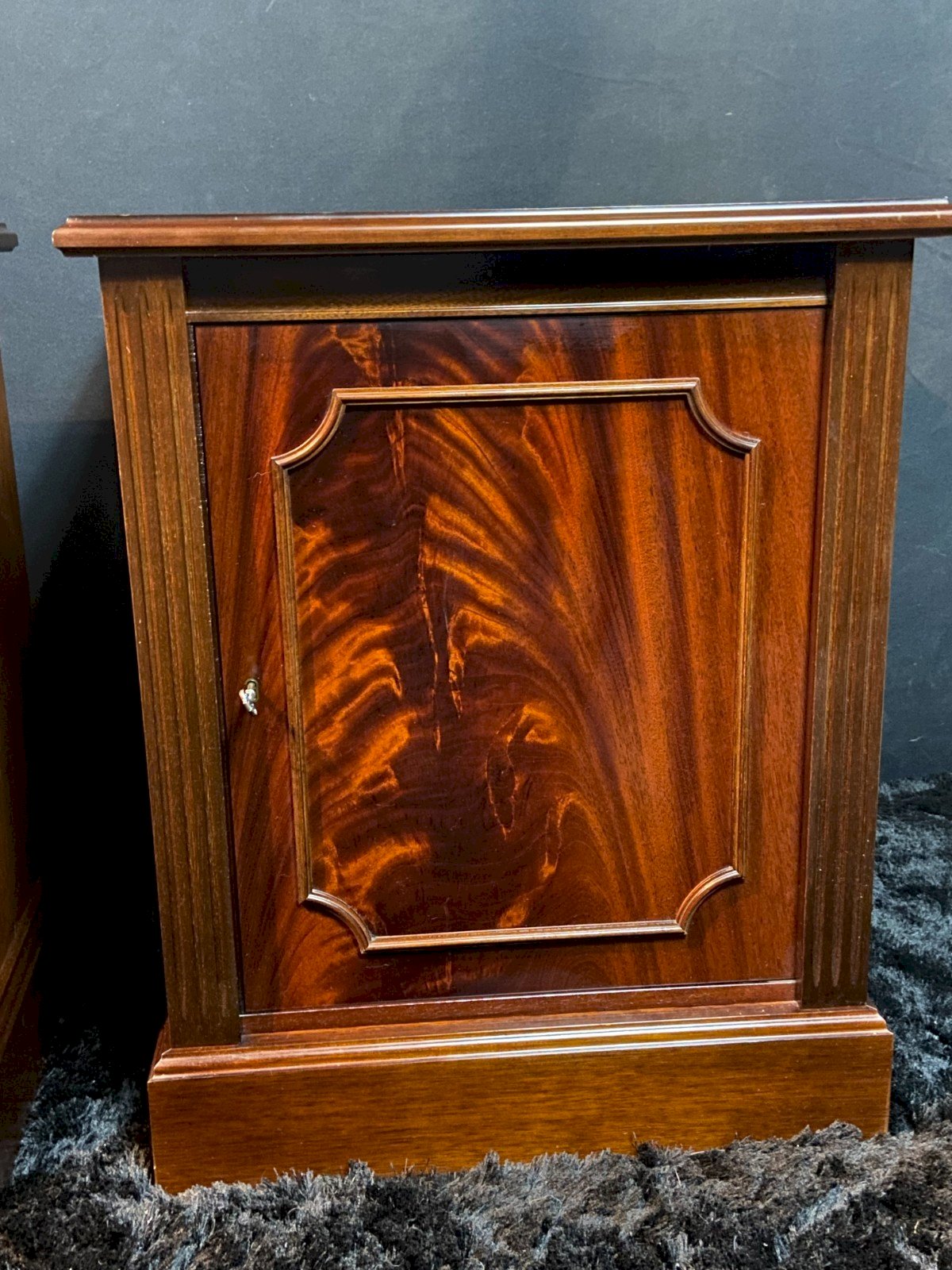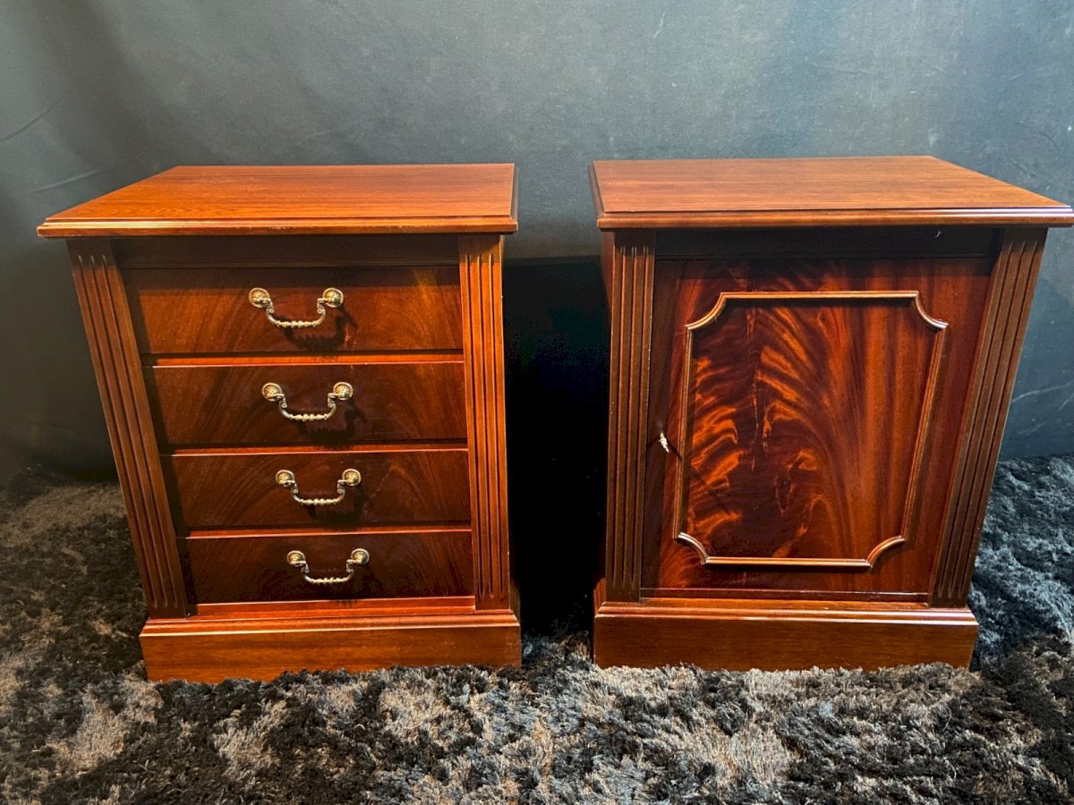 Paire de caissons de bureau, blocs de classement en placage d'acajou de style anglais Epoque 1970 - 1980 L'un ouvrant à quatre tiroirs. Tiroir supérieur à 10 compartiments intérieurs pour fiches L'autre ouvrant à un vantail Dimensions max : Hauteur 75,5 x 61,4 x 48,1 cm Je ne relèverais que de petites traces usuelles Retrait gratuit possible dans le centre historique de Bourges (Église Notre-Dame) . - Les commandes sont déposées au pied de votre domicile - Les dimensions sont  toujours précisées : aucune contestation ne sera admise si le meuble ne passe pas dans votre escalier ou si votre plafond est trop bas...par exemple. - Des tarifs de livraison spécifiques s'appliquent pour les îles : Corse, Sardaigne, Sicile, Baléares......... - Les délais sont généralement très courts pour toutes les grandes agglomérations  - Ces derniers peuvent être rallongés pour des destinations extrêmement isolées et particulièrement mal desservies : n'hésitez pas à me contacter préalablement. Couleur:Marron Type:Bloc de classement Pays d'origine:Royaume-Uni Matière:Acajou Style:Regency