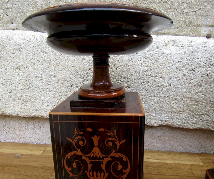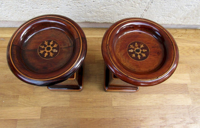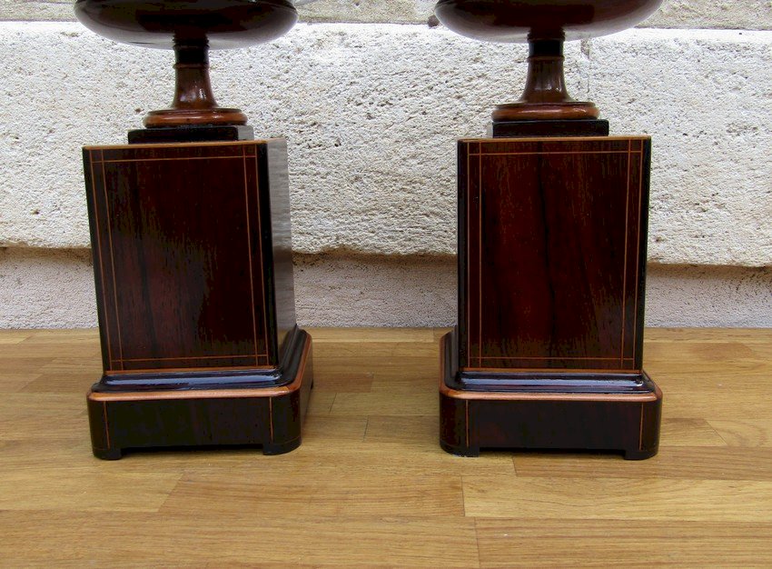 Belle paire de cassolettes époque CHARLES X XIX siècle en placage de palissandre et de citronnier ,bon état juste un petit manque de placage sous la coupe ,voir photo .
