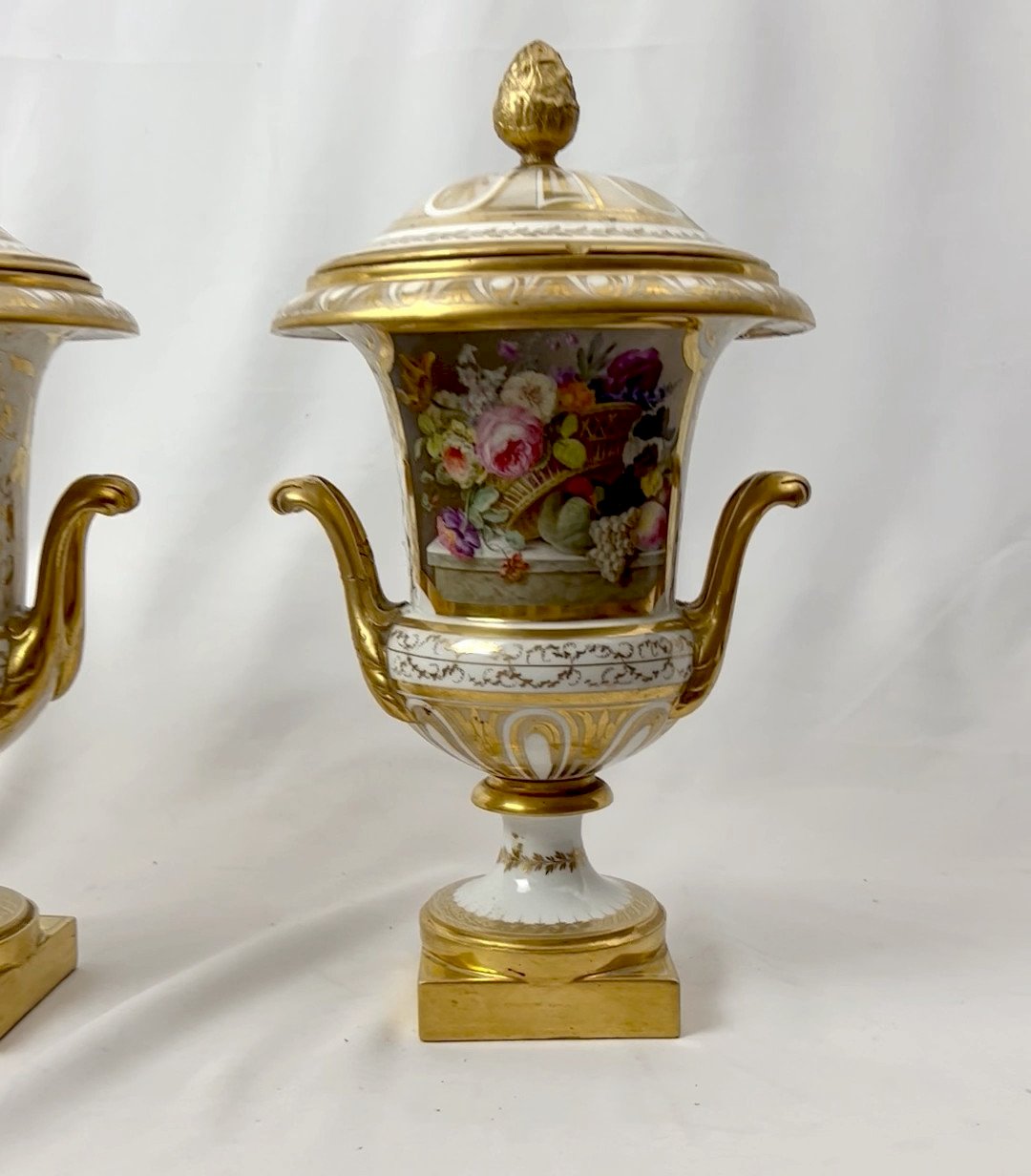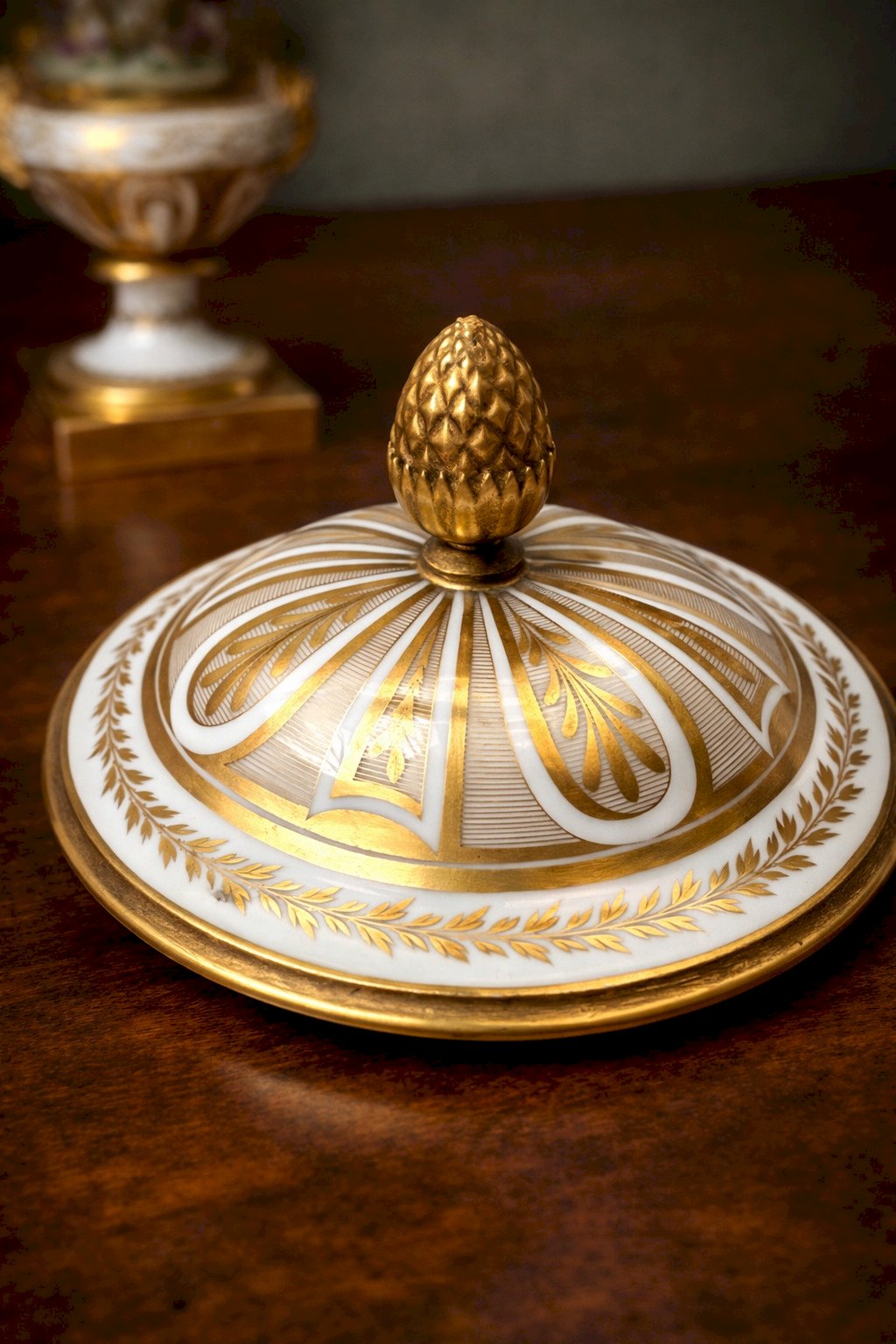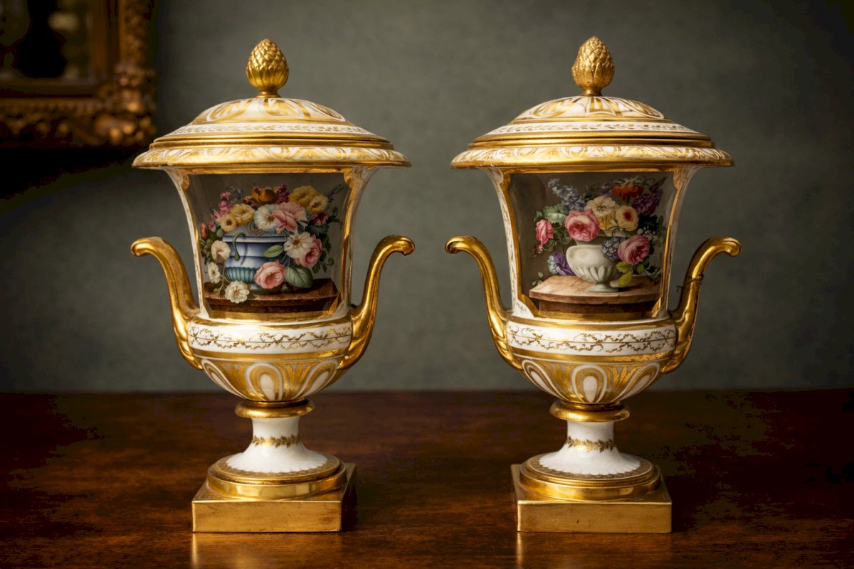 Superbe paire de cassolettes couvertes de forme Médicis en porcelaine de Paris, vers 1830. Ces élégants vases reposent sur une base carrée dorée, surmontée d’un piédouche circulaire. Le corps est richement rehaussé d’or fin et décoré de cartouches en réserve présentant de délicats bouquets floraux. Chaque vase présente deux cartouches différents, soit quatre compositions au total, symbolisant les quatre saisons. Les anses latérales sont stylisées et finement dorées. Les couvercles sont coiffés d’une prise en forme de pomme de pin, symbole d’abondance. La qualité de peinture est remarquable : les bouquets sont finement dessinés, aux couleurs fraîches et lumineuses. Dimensions Base : 9 x 9 cm (3,5’’ x 3,5’’) Hauteur sans couvercle : 26 cm (10,2’’) Hauteur avec couvercle : 31,5 cm (12’’) État Dorure en bon état général Peintures en très bel état Un éclat sur le bord d’un couvercle Une pomme de pin restaurée Deux anses anciennement recollées (une sur chaque vase) Les restaurations sont stables et n’altèrent pas la présentation décorative. Photos détaillées disponibles sur demande. Pourquoi cette paire ? ✔️ Belle présence décorative ✔️ Élégance néoclassique ✔️ Décor des quatre saisons ✔️ Format idéal pour cheminée, console ou bibliothèque Une paire décorative raffinée, idéale pour un intérieur classique, hôtel particulier ou décoration éclectique chic. État:Occasion: Objet ayant été utilisé. Objet présentant quelques marques d'usure superficielle, ...Occasion: Objet ayant été utilisé. Objet présentant quelques marques d'usure superficielle, entièrement opérationnel et fonctionnant correctement. Il peut s'agir d'un modèle de démonstration ou d'un objet retourné en magasin après une courte période d'utilisation. les éventuelles imperfections. Couleur:Multicolore Type:Vase Pays d'origine:France Matériau:Céramique Thème:Fleur, Jardin