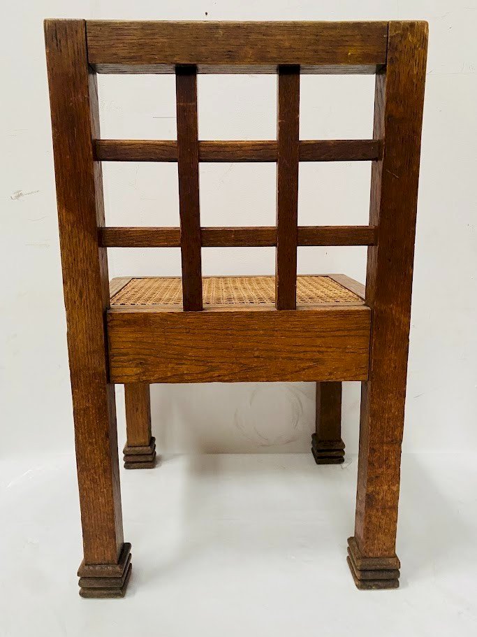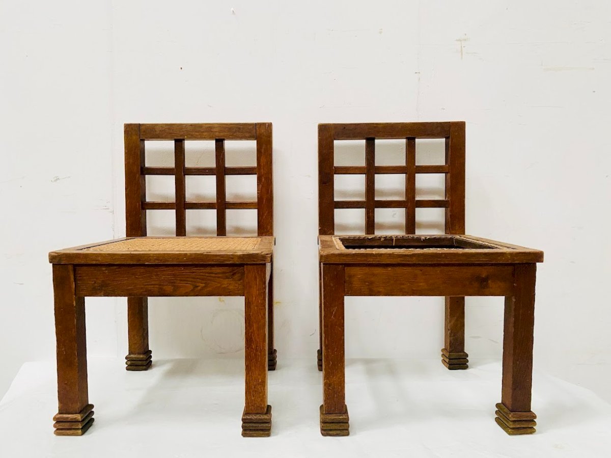 Paire de chaise architecturale en chêne massif Chaises chauffeuse a dossier droit a petits carrés Piètement a sabots de chêne Assises a fond de canne (une assises abimée voir la photo) Dimension H 60 x L 32 x 39 cm Hauteur d'assise 33 cm XX siècle Nombre de pièces:2 Type:Chaise Période:Art Déco Origine:France Pays d'origine:France Hauteur:60 Matière:Chêne Longueur:32 Largeur:39