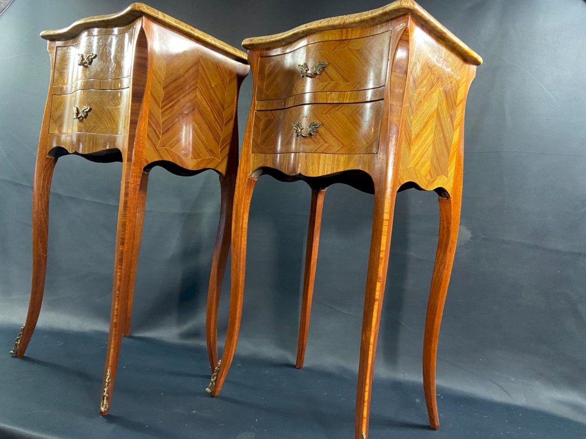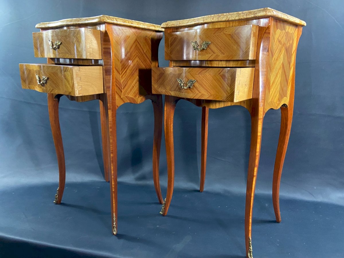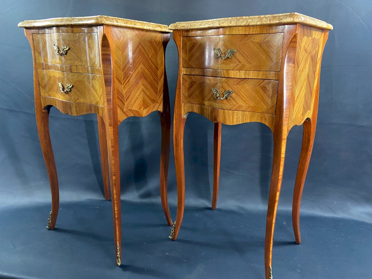 Paire de chevets à décor marqueté ornement bronze plateau marbre style Louis XV