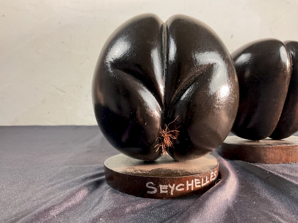 Paire de Coco fesse en bois pour cabinet de curiosité Seychelles ( rasé ou pas ) Hauteur : 11,5 et 12,5 cm Type:Figurine, statue Sous-type:De décoration Matière:Bois