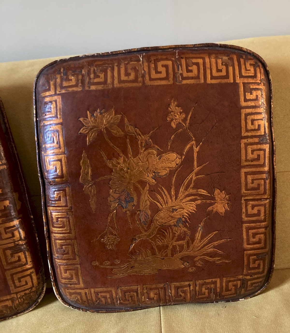 Paire de coussins (39 x 43) en cuir laqué à décor de héron et de feuillage - Vietnam début XXe. Usures visibles sur les photos.
