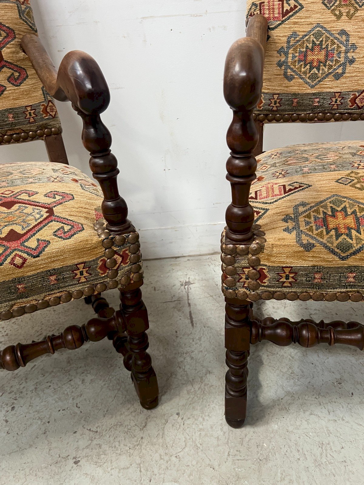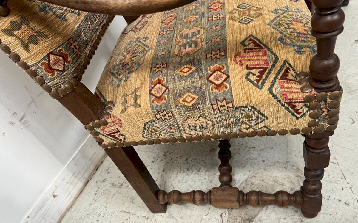 Paire de fauteuils de style Louis XIII en noyer massif Quatre pieds a entretoise sculptée Garnissage et tapisserie a motif floral en très bon état Dimension H 117 x L 55 x 46 cm Hauteur d'assise 50 cm Epoque début du XX siècle Nombre de pièces:2 Type:Fauteuil Sous-type:Haute Hauteur:117 Matière:Noyer Longueur:46 Largeur:55