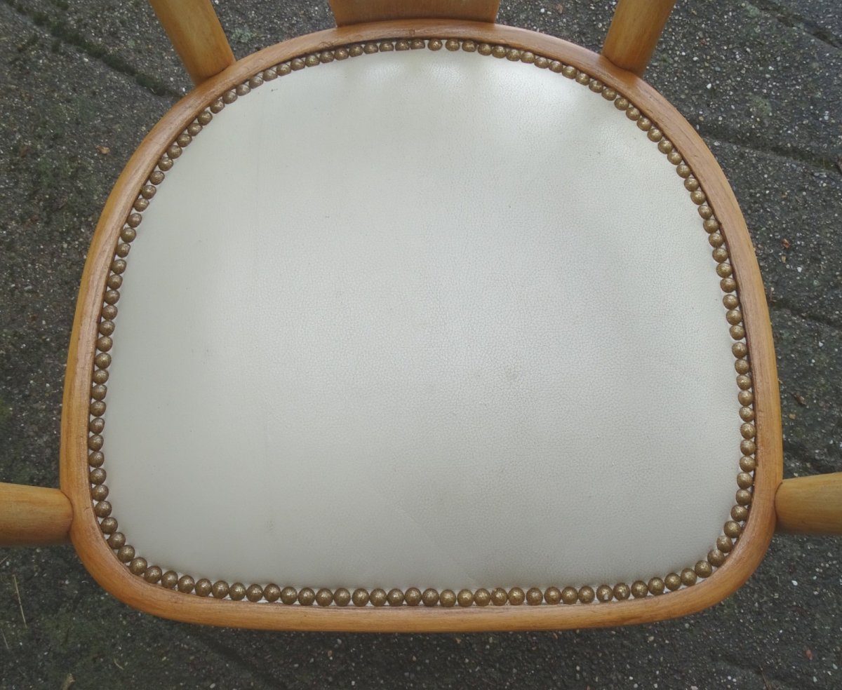 Ces Fauteuils de salon ou de bureau / bistrot THONET A 969 F produits entre 1925 et 1937 sont dérivés du design et des formats initiés par la Sécession viennoise, ce type de modèles réapparait dans les catalogues des fabricants dans la période Art Déco. Proportions compactes, design sobre, les pieds du siège sont aussi les montants sur lesquels repose un ceintre en bois courbé formant accotoirs et dossier, habillé ici d'un simple cuir sous pointes bronze. Très bon état, le cuir et l’ensemble de la tapisserie sont récents.   L’étiquette de la marque Thonet est visible sous chaque siège.   Teinte hêtre naturel sous gomme-laque   Hauteur d’assise au centre de la selle : 47 cm ha Hauteur totale : 77 cm , hauteur aux accotoirs devant :72 cm - largeur Ht : 51 cm, profondeur : 54 cm.   Plus de photos et renseignements sur demande Livraison sur France et Europe ou enlèvement Alsace. Couleur:Blanc Nombre de pièces:2 Type:Fauteuil Marque:Thonet Période:Art Déco Origine:Tchecoslovaquie Sous-type:bureau Matière:Hêtre