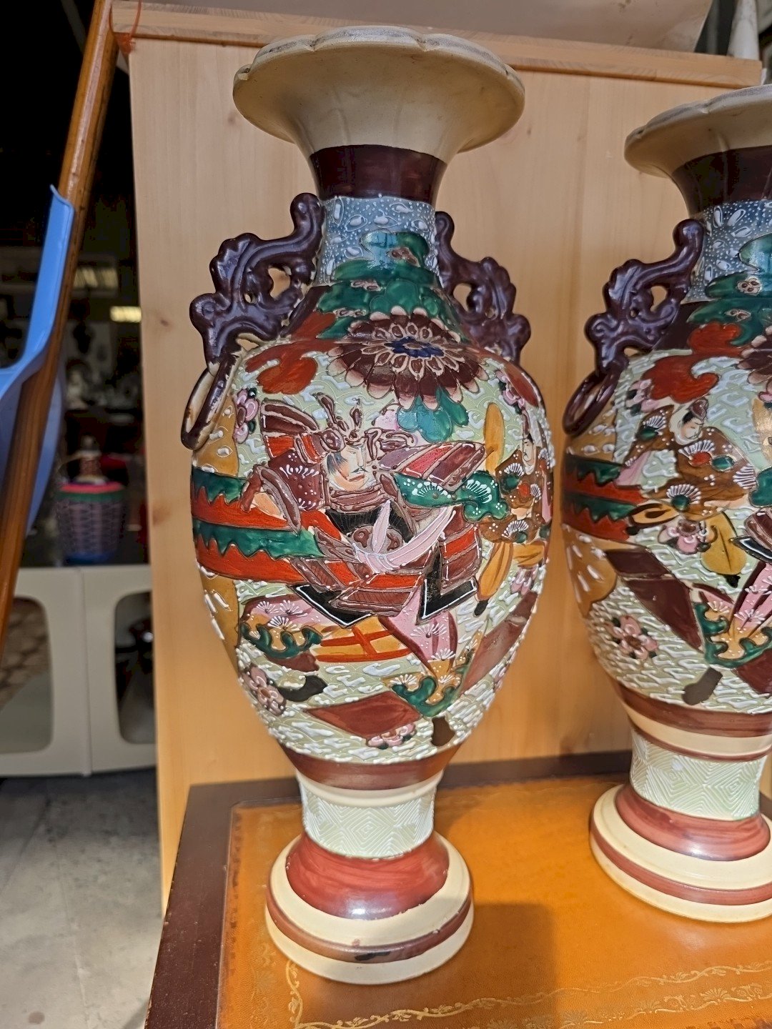 Superbe paire authentique de vases japonais Satsuma, époque fin XIXᵉ – début XXᵉ siècle (ère Meiji / début Taishō, vers 1890-1920). Ces deux vases de grande taille présentent un décor richement peint en relief, représentant des scènes de samouraïs entourés de motifs floraux et géométriques, avec de nombreux rehauts dorés. Les anses sont finement travaillées en forme de dragons/volutes, typiques du style Satsuma export. Sous la base figure une marque d’atelier japonaise peinte à la main, attestant l’authenticité de la fabrication. --- ✨ Caractéristiques : Origine : Japon Époque : fin XIXᵉ – début XXᵉ (vers 1890-1920) Matière : céramique émaillée et dorée Décor : scènes de samouraïs, émaux polychromes, reliefs et dorures Anses : dragons/volutes ajourées Dimensions : hauteur 48 cm – largeur 21 cm Signature : marque d’atelier japonaise sous la base État : très bon état général, petites usures d’émail et de dorure normales pour l’âge, pas de fêle ni éclat majeur. --- ? Une paire impressionnante par sa taille, sa richesse décorative et la présence d’une marque d’atelier. Pièces de collection, idéales pour amateurs de céramiques japonaises anciennes ou pour une décoration orientale élégante. ? Envoi très soigné et sécurisé (emballage renforcé, expédition séparée pour chaque vase). Pays d'origine:Japon