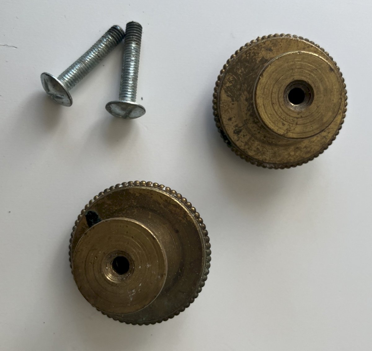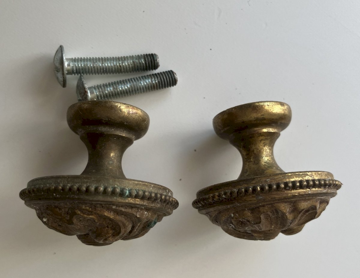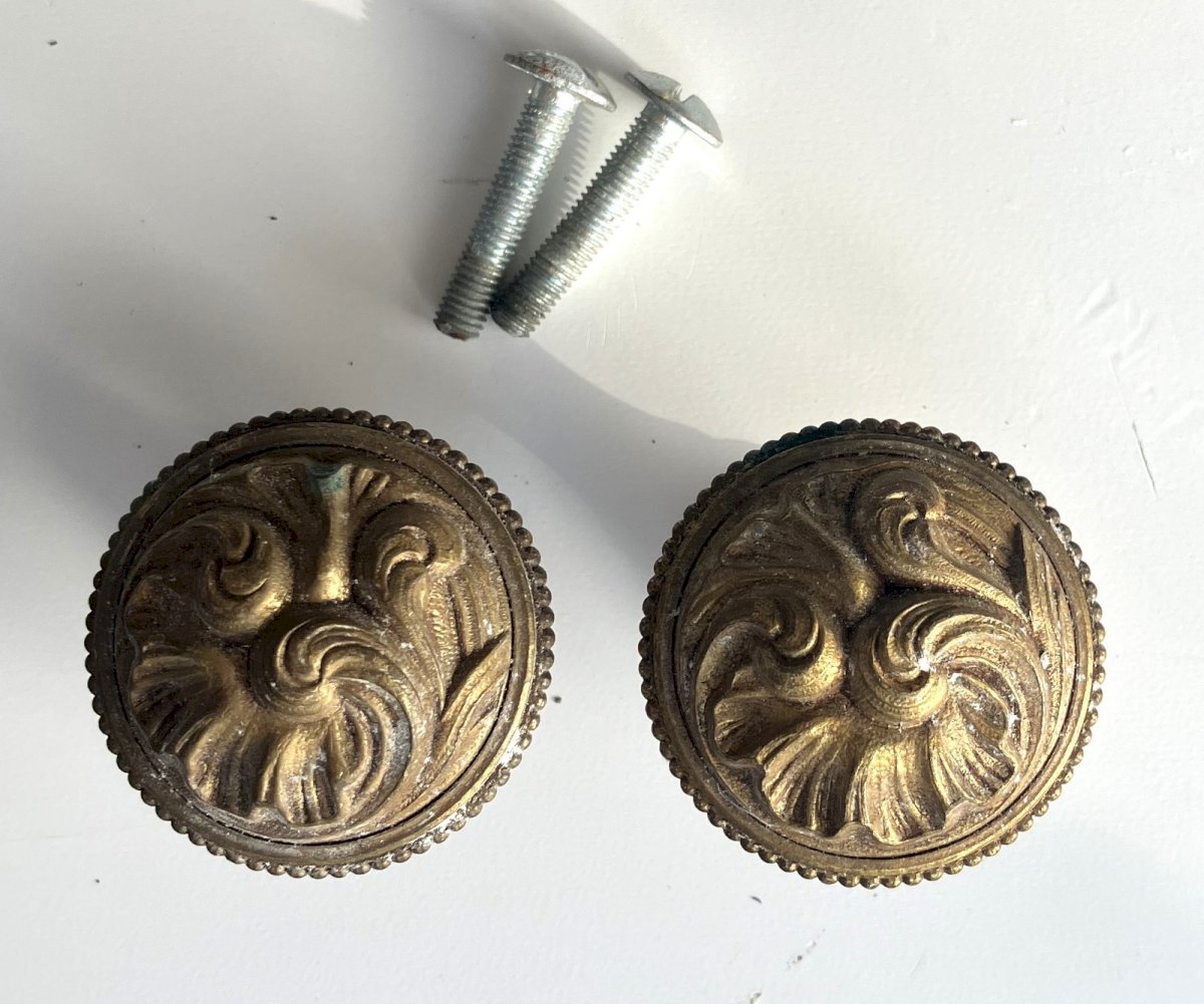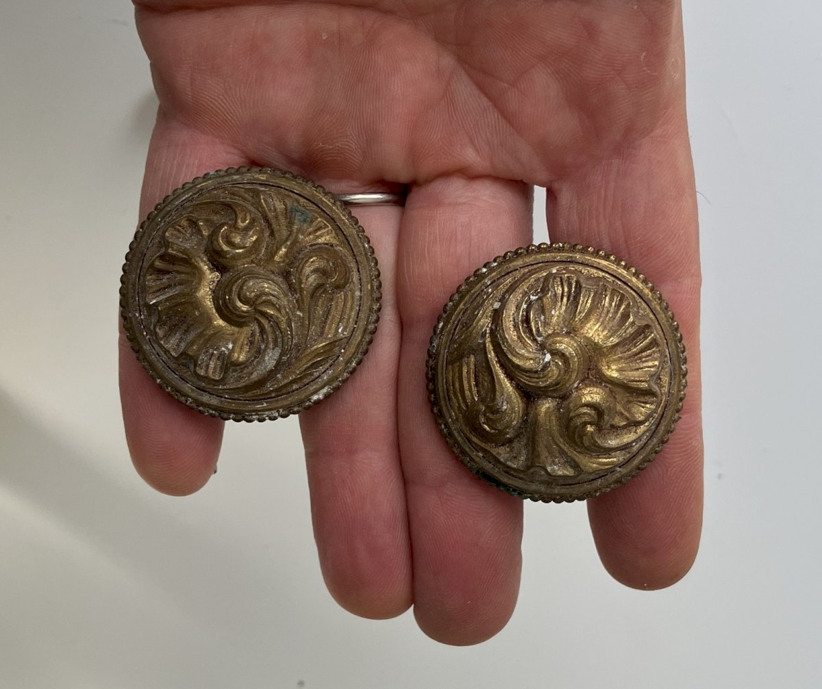 paire de gros boutons de tiroir ou porte en bronze laiton massif diametre 39 mm assez lourds (poids 72 g piece) profondeur (sans la vis) 35 mm longueur vis (sans la tete) 25 mm, un legerement tordue bon etat general - petits residus de peinture expedition par MONDIALRELAY Matière:Bronze