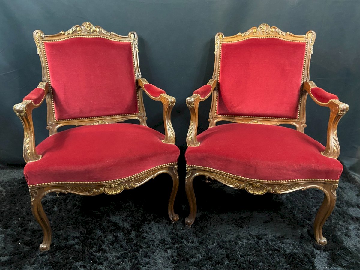 Paire de larges fauteuils à dossier plat de style Louis XV en hêtre massif recouvert d'un velours rouge profond légèrement framboise Hêtre foncé légèrement rehaussé d'une patine dorée Epoque milieu XXe Incontestable élégance Parfaite stabilité Excellent confort Dimensions max : Hauteur dossier 99,8 x Hauteur assise 44 x Envergure 71,7 x profondeur assise 54 cm Je signale la présence de traces de piquages en surfaces Possibilité de former une suite de quatre fauteuils : la 2e paire est actuellement en vente au sein de ma boutique. Retrait gratuit possible dans le centre historique de Bourges (Église Notre-Dame) . - Les commandes sont déposées au pied de votre domicile - Les dimensions sont  toujours précisées : aucune contestation ne sera admise si le meuble ne passe pas dans votre escalier ou si votre plafond est trop bas...par exemple. - Des tarifs de livraison spécifiques s'appliquent pour les îles : Corse, Sardaigne, Sicile, Baléares......... - Les délais sont généralement très courts pour toutes les grandes agglomérations  - Ces derniers peuvent être rallongés pour des destinations extrêmement isolées et particulièrement mal desservies : n'hésitez pas à me contacter préalablement. Couleur:Rouge Nombre de pièces:2 Type:Fauteuil Origine:France Pays d'origine:France Style:Louis XV, Néoclassique Matière:Hêtre