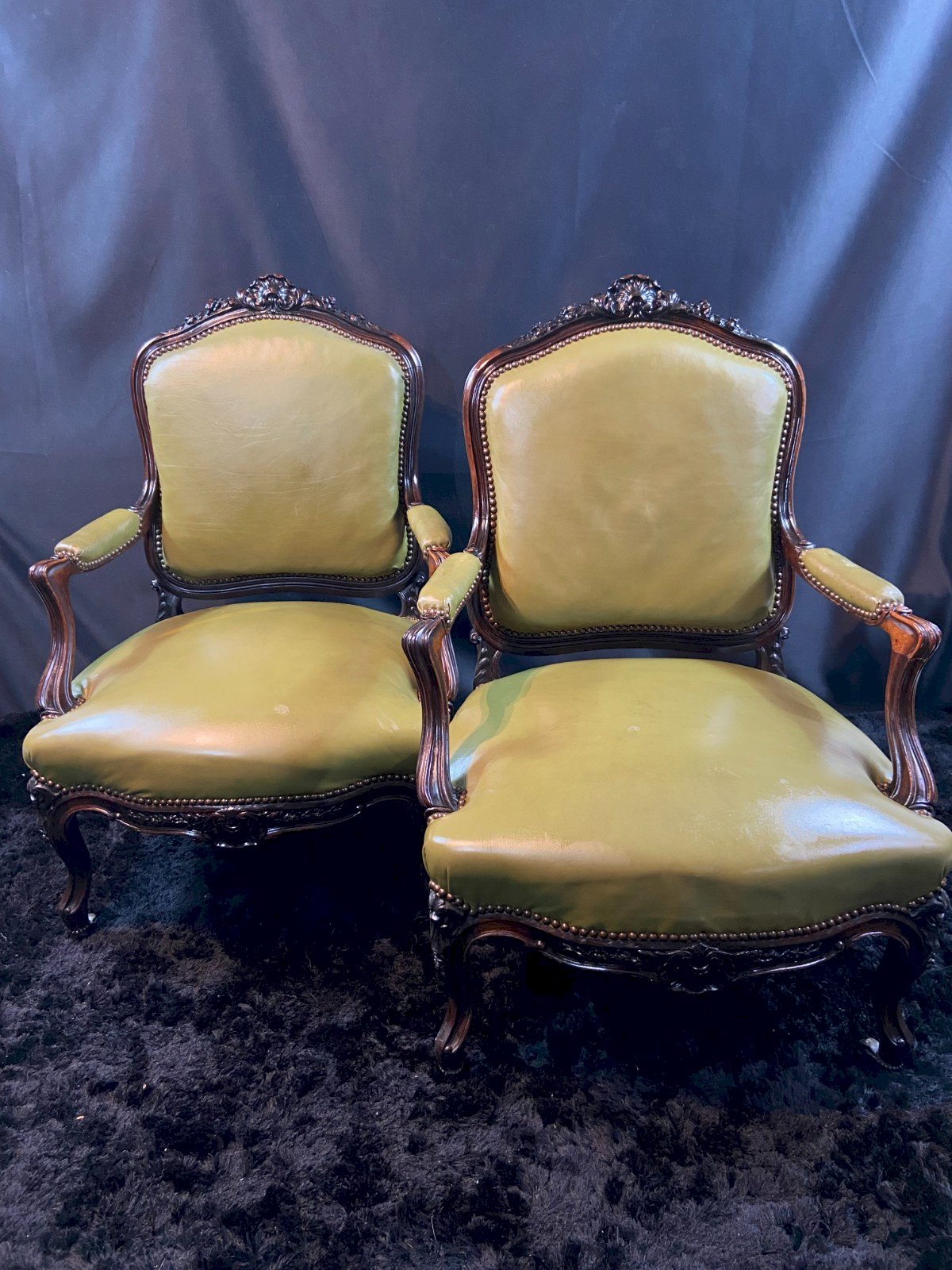 Paire de larges fauteuils en cuir vert de style Louis XV Structure en acajou ou noyer foncé richement sculpté Parfaite stabilité Excellent confort Incontestable élégance Dimensions max : Hauteur dossier 96,5 x Hauteur assise 40 x Envergure 67 x profondeur assise 54 cm Je ne signalerais que de légères usures en surface et autres petites discrètes restaurations usuelles, notamment en partie inférieure intérieure arrière des dossiers Retrait gratuit possible dans le centre historique de Bourges (Église Notre-Dame) . - Les commandes sont déposées au pied de votre domicile - Les dimensions sont  toujours précisées : aucune contestation ne sera admise si le meuble ne passe pas dans votre escalier ou si votre plafond est trop bas...par exemple. - Des tarifs de livraison spécifiques s'appliquent pour les îles : Corse, Sardaigne, Sicile, Baléares......... - Les délais sont généralement très courts pour toutes les grandes agglomérations  - Ces derniers peuvent être rallongés pour des destinations extrêmement isolées et particulièrement mal desservies : n'hésitez pas à me contacter préalablement. Couleur:Vert Type:Fauteuil Origine:France Période:XIXème et avant Pays d'origine:France Style:Louis XV, Néoclassique Matière:Cuir