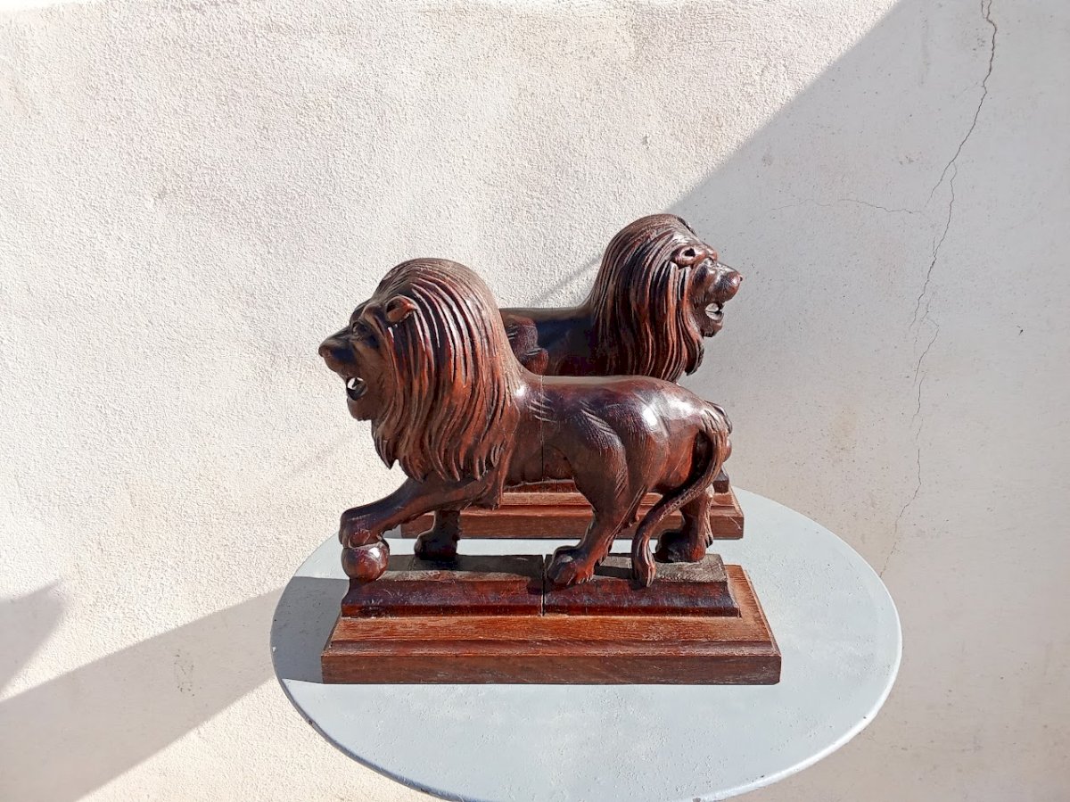 Superbe paire de lions Médicis en noyer sculpté, reposant sur socles.