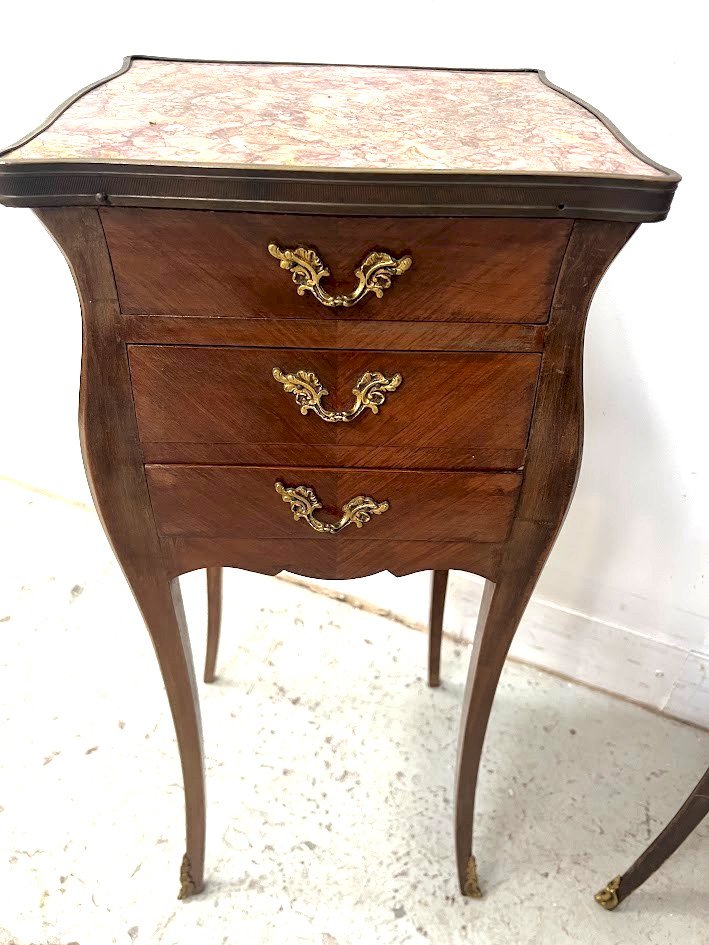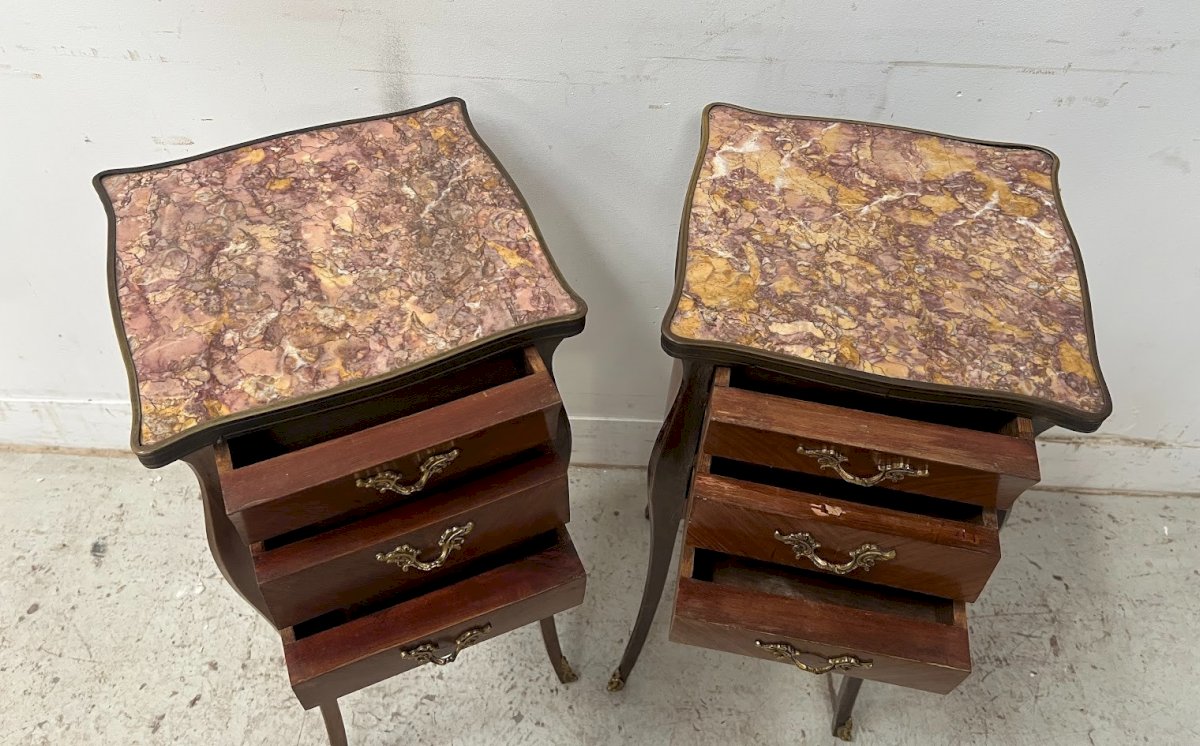 Paire de petites commodes marquetées de style Louis XV Dessus marbre XX siècle